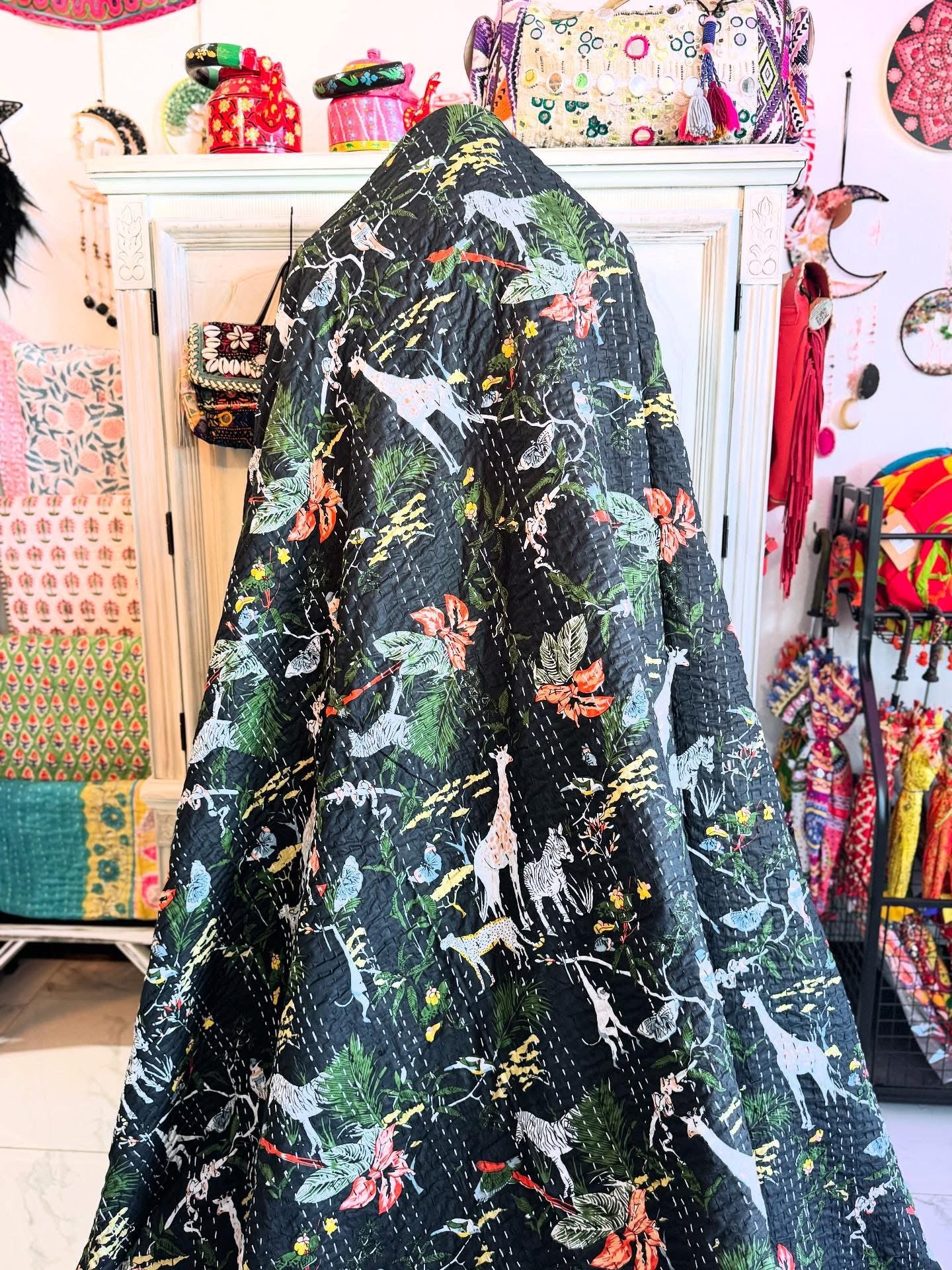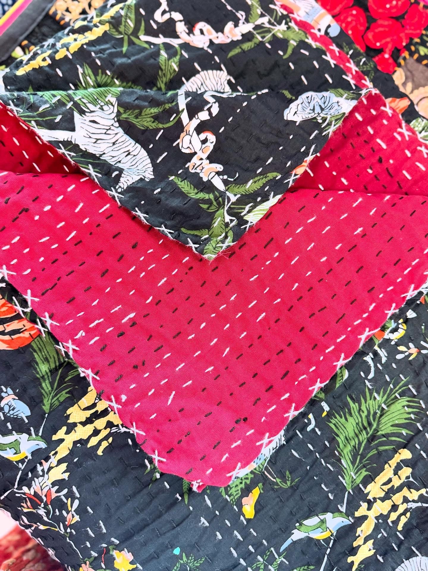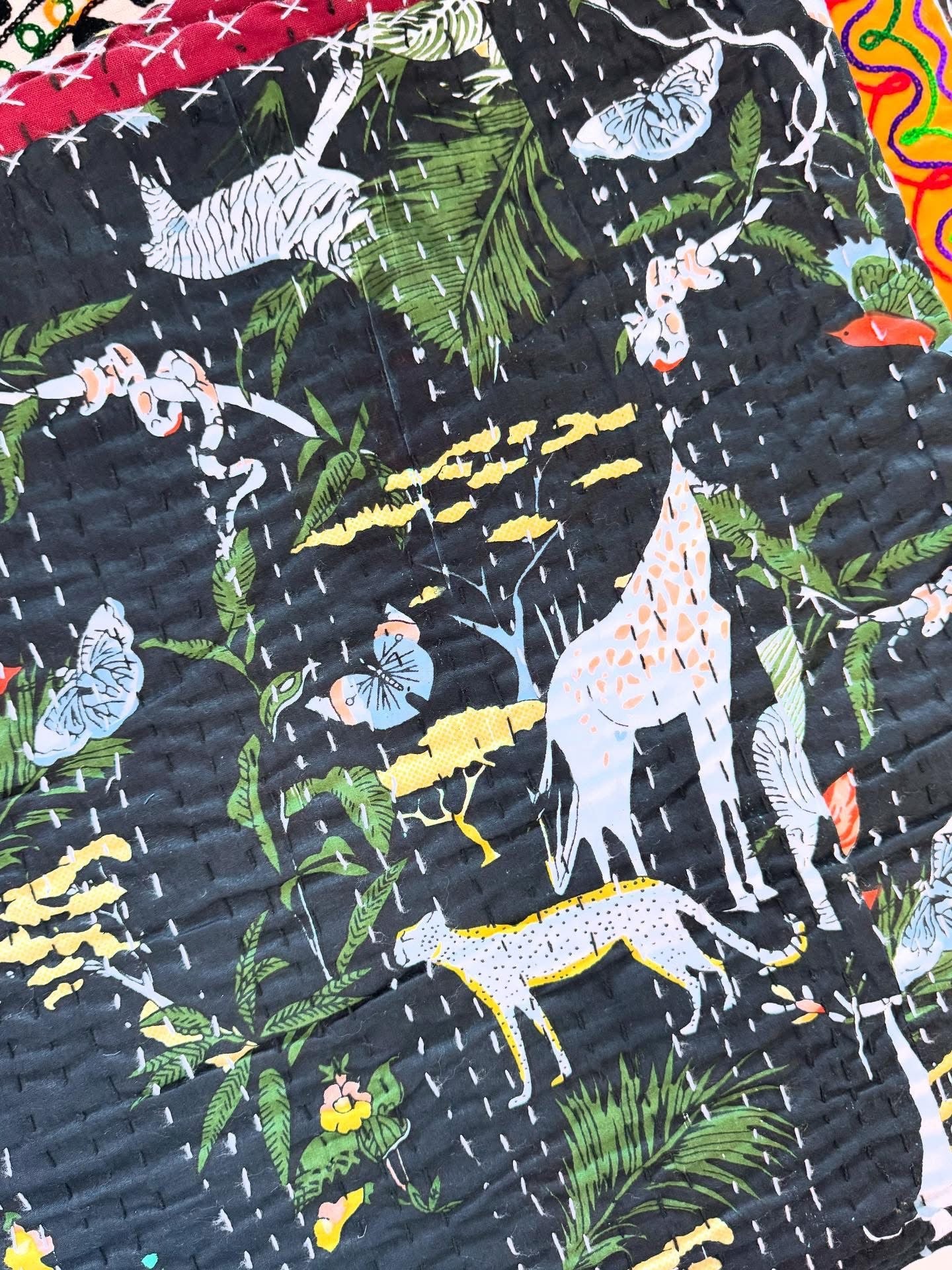This handmade kantha quilt features birds, tigers, butterflies, snakes, and zebras — all hand block printed on soft, 100% cotton with a solid back and finished with traditional kantha stitches. Lightweight, breathable, and perfect for layering.