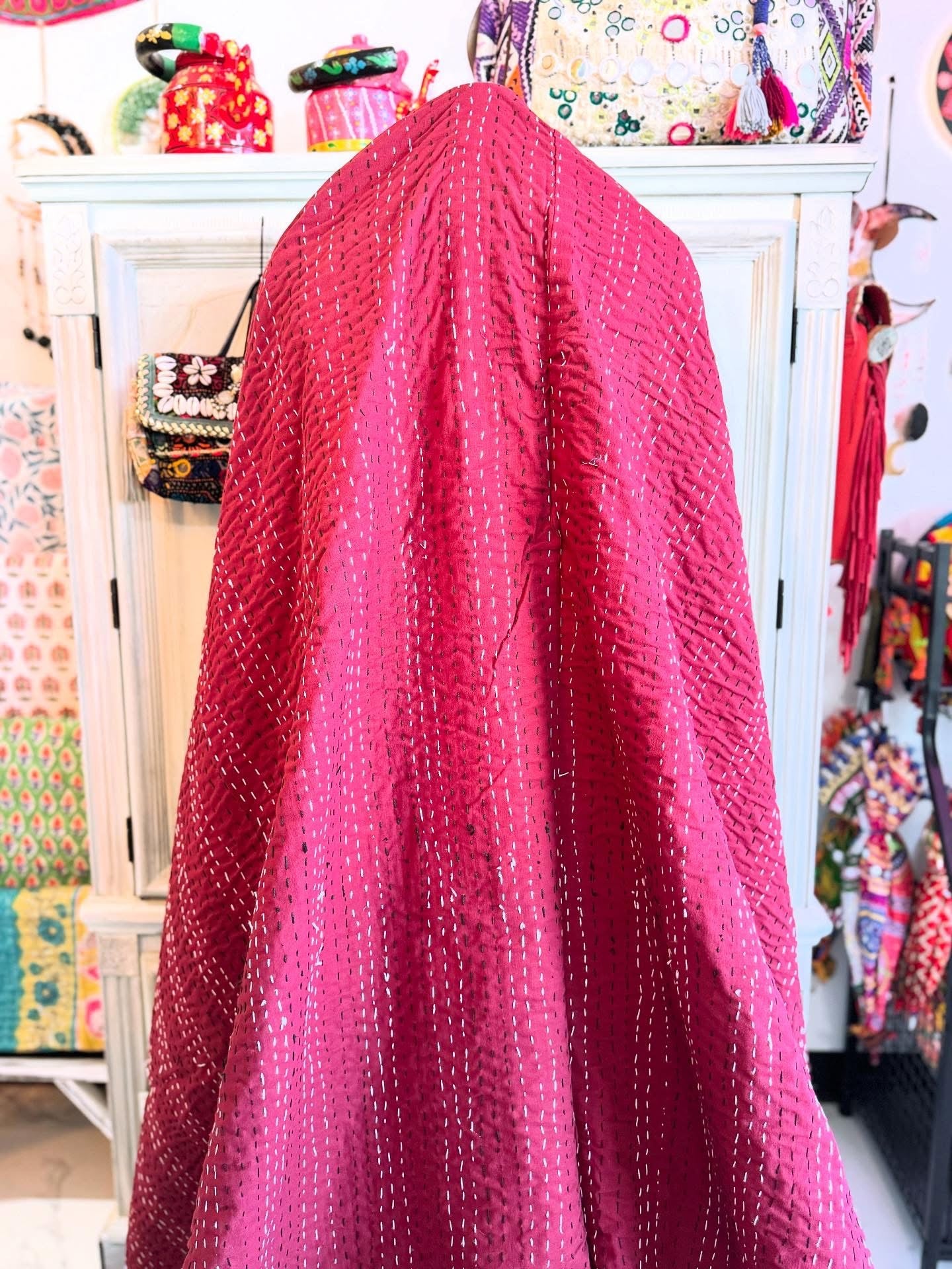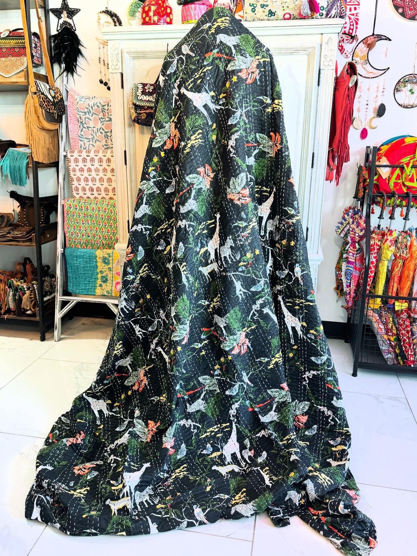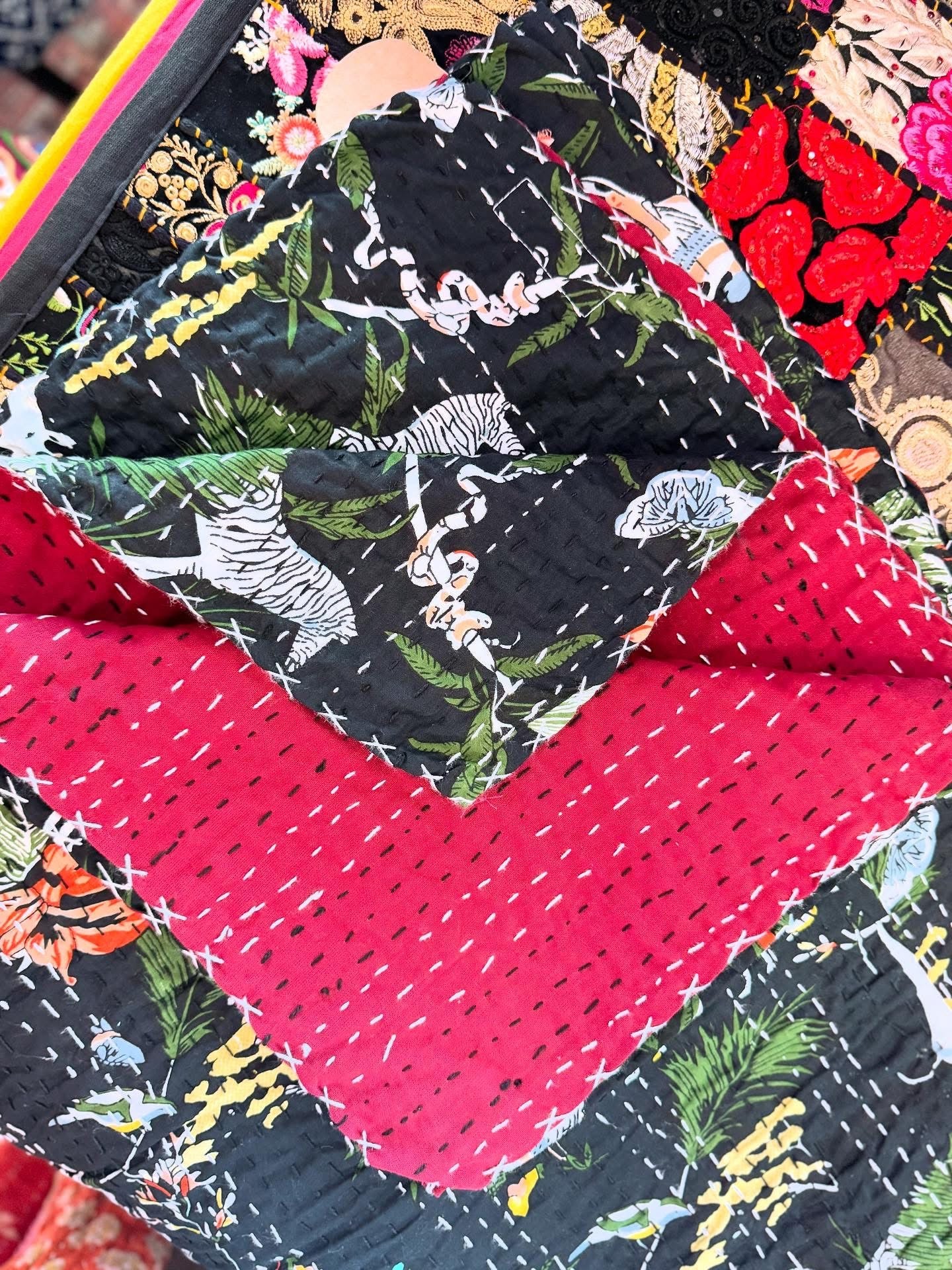 This handmade kantha quilt features birds, tigers, butterflies, snakes, and zebras — all hand block printed on soft, 100% cotton with a solid back and finished with traditional kantha stitches. Lightweight, breathable, and perfect for layering.