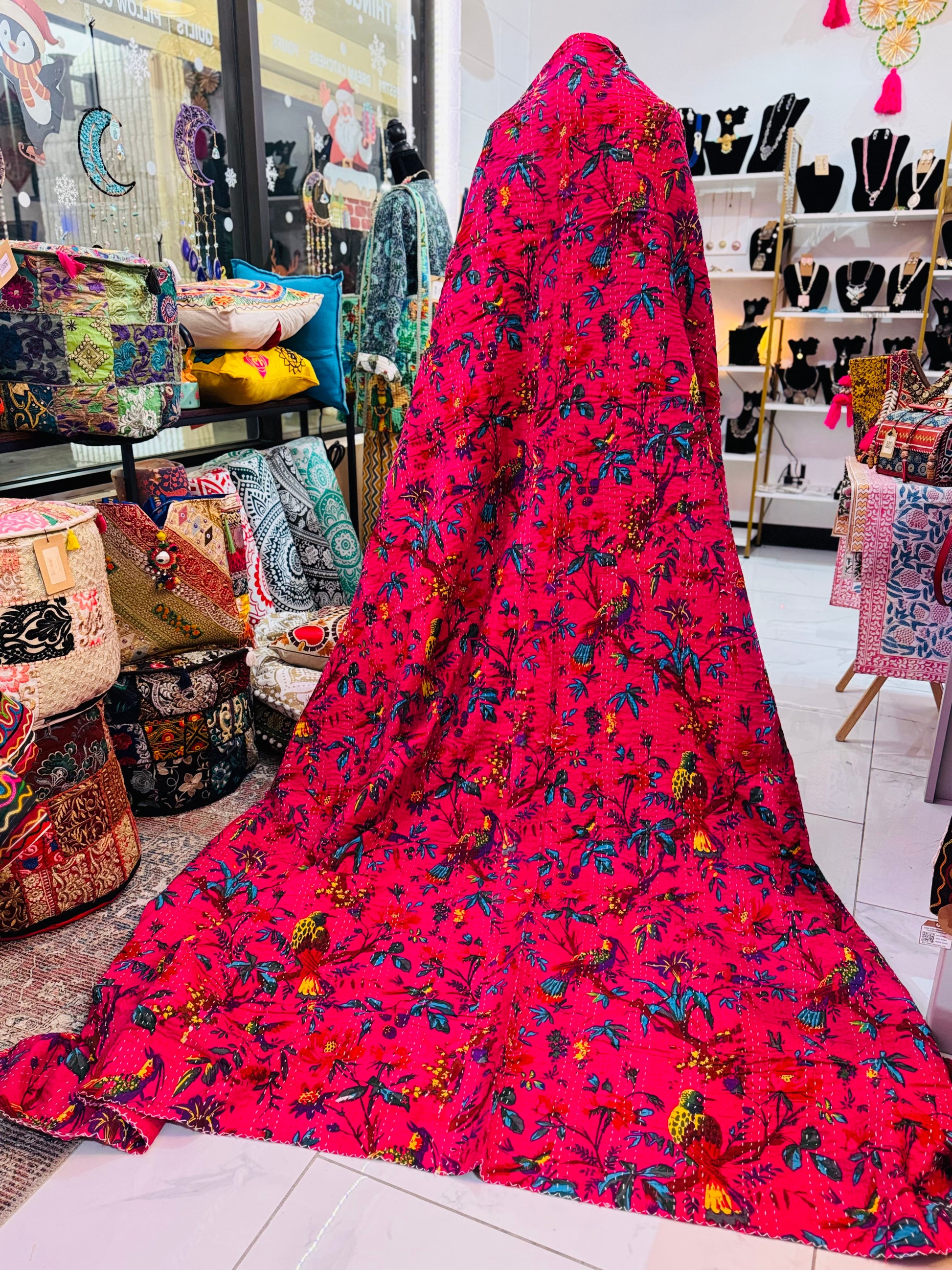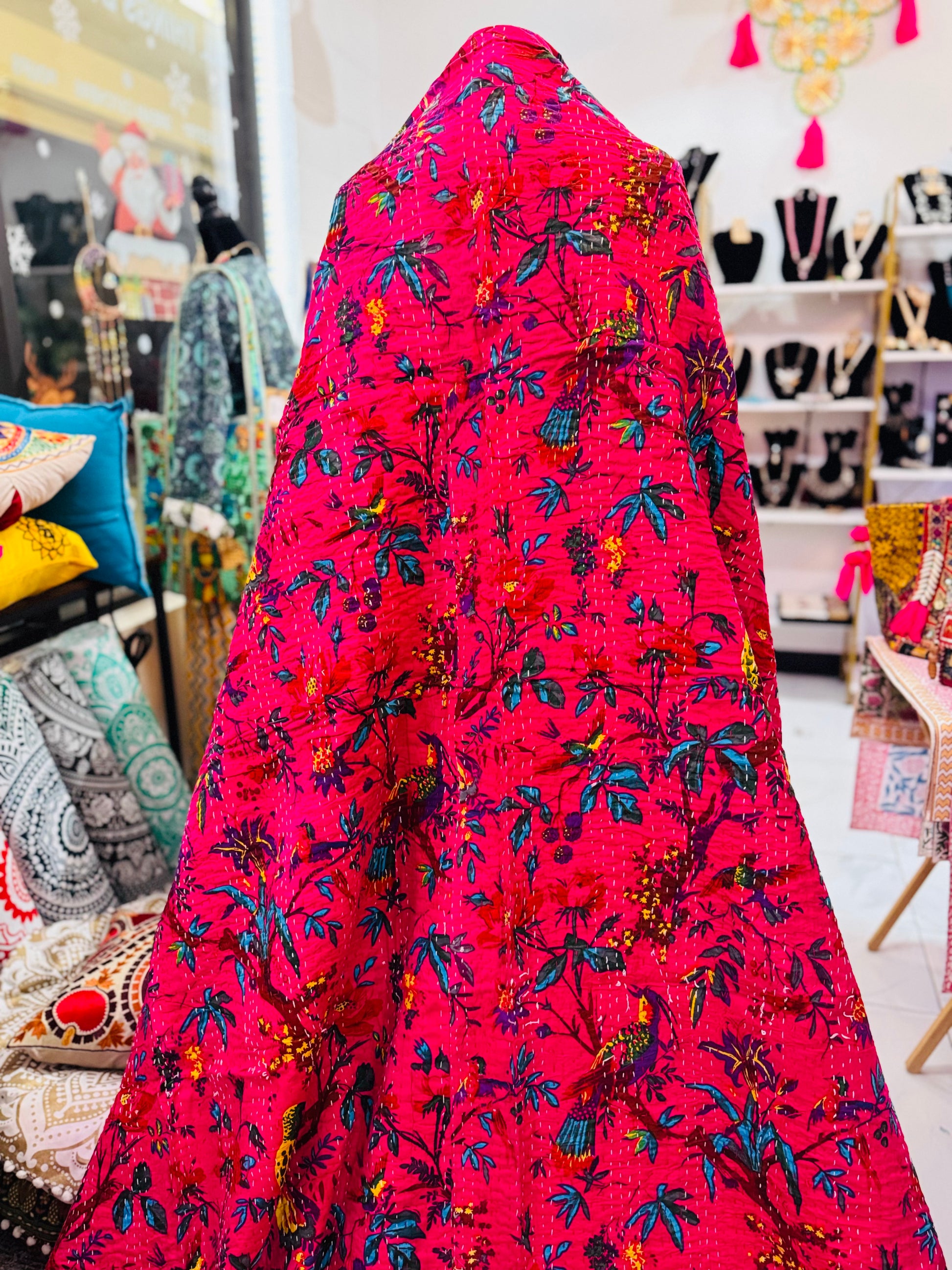 Birdsong Bloom – Hot Pink Handblock Printed Kantha Quilt – 100% Cotton | Handmade