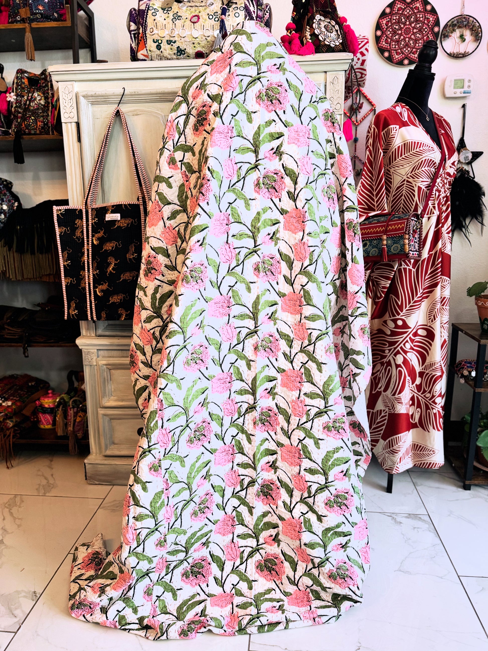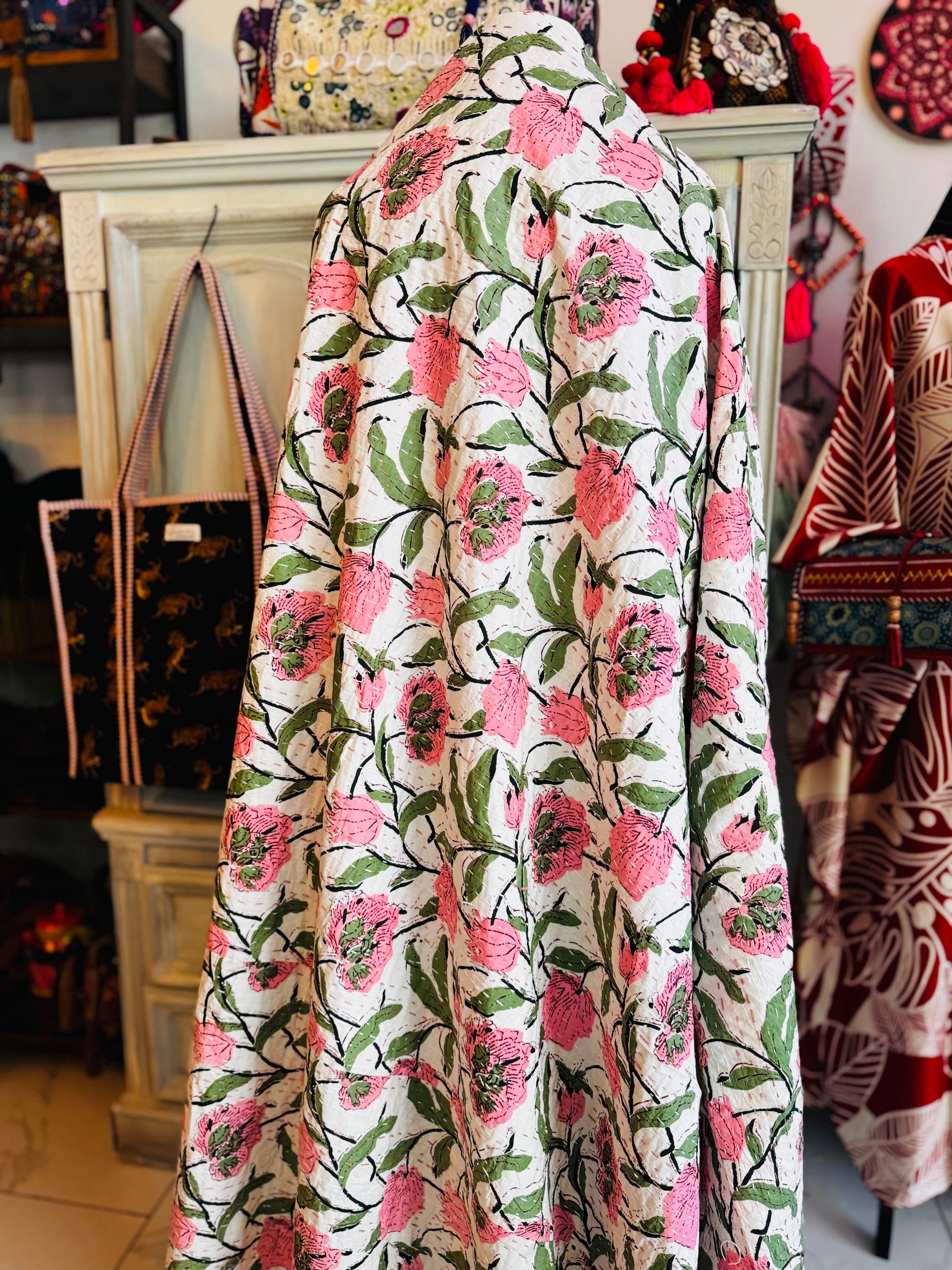 Blush Meadow – Pink Floral Handblock Printed Kantha Quilt | 100% Cotton | Handmade