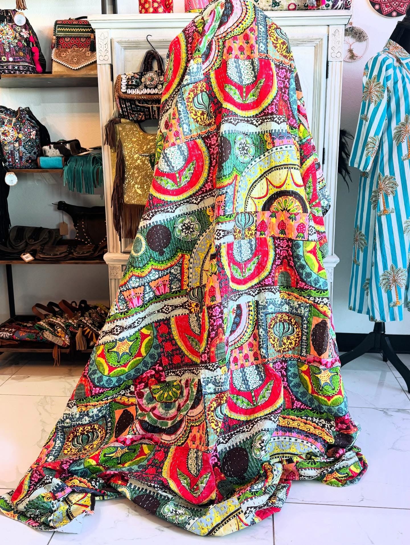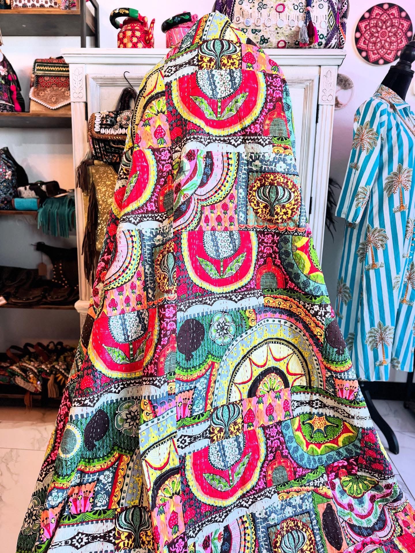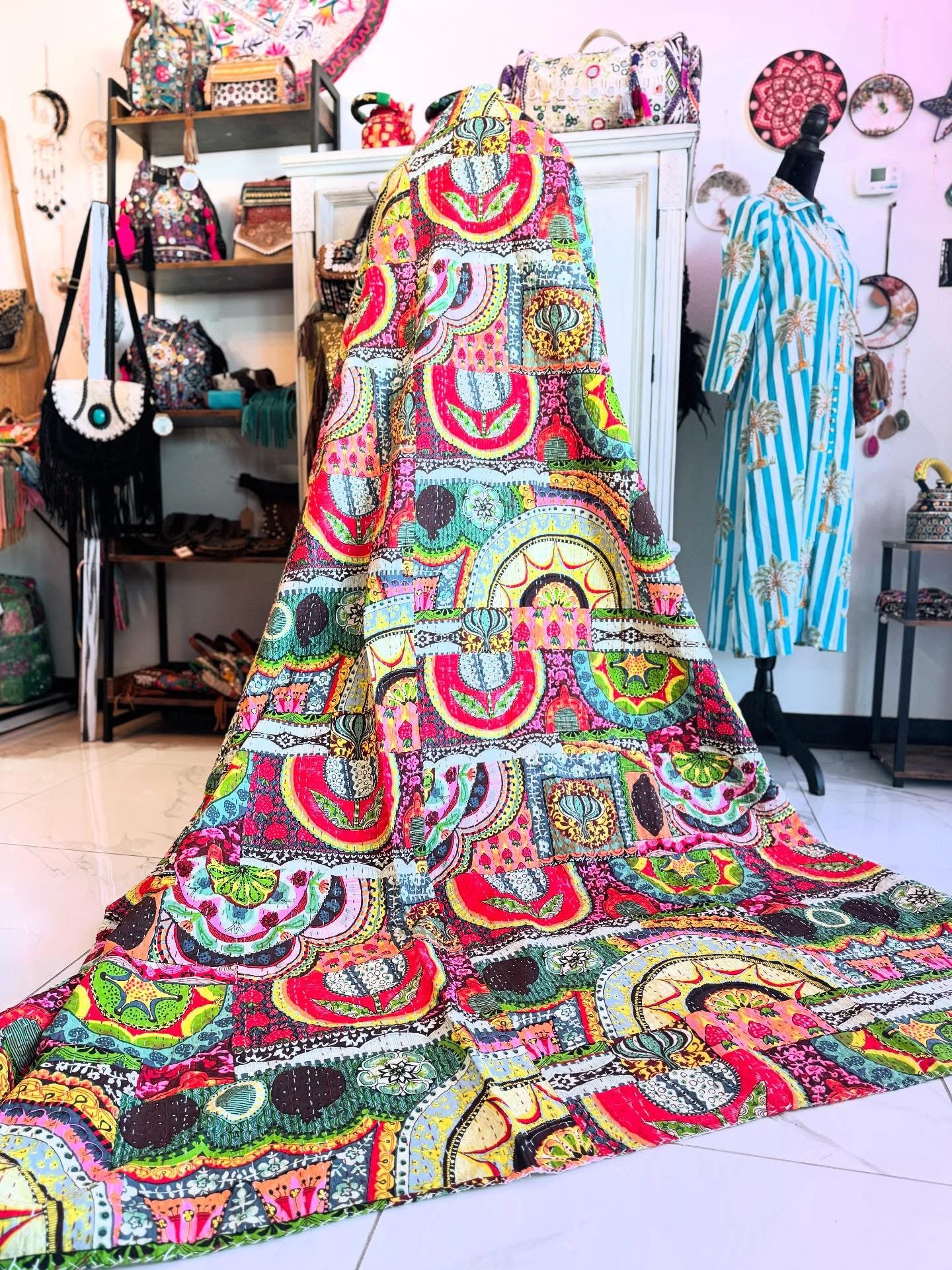 Made from 100% breathable cotton and hand-stitched using traditional kantha techniques, this quilt brings vibrant color and soulful craftsmanship into your home. Use it as a bold bedspread, a cozy layering piece, or a boho-chic gift that speaks volumes.