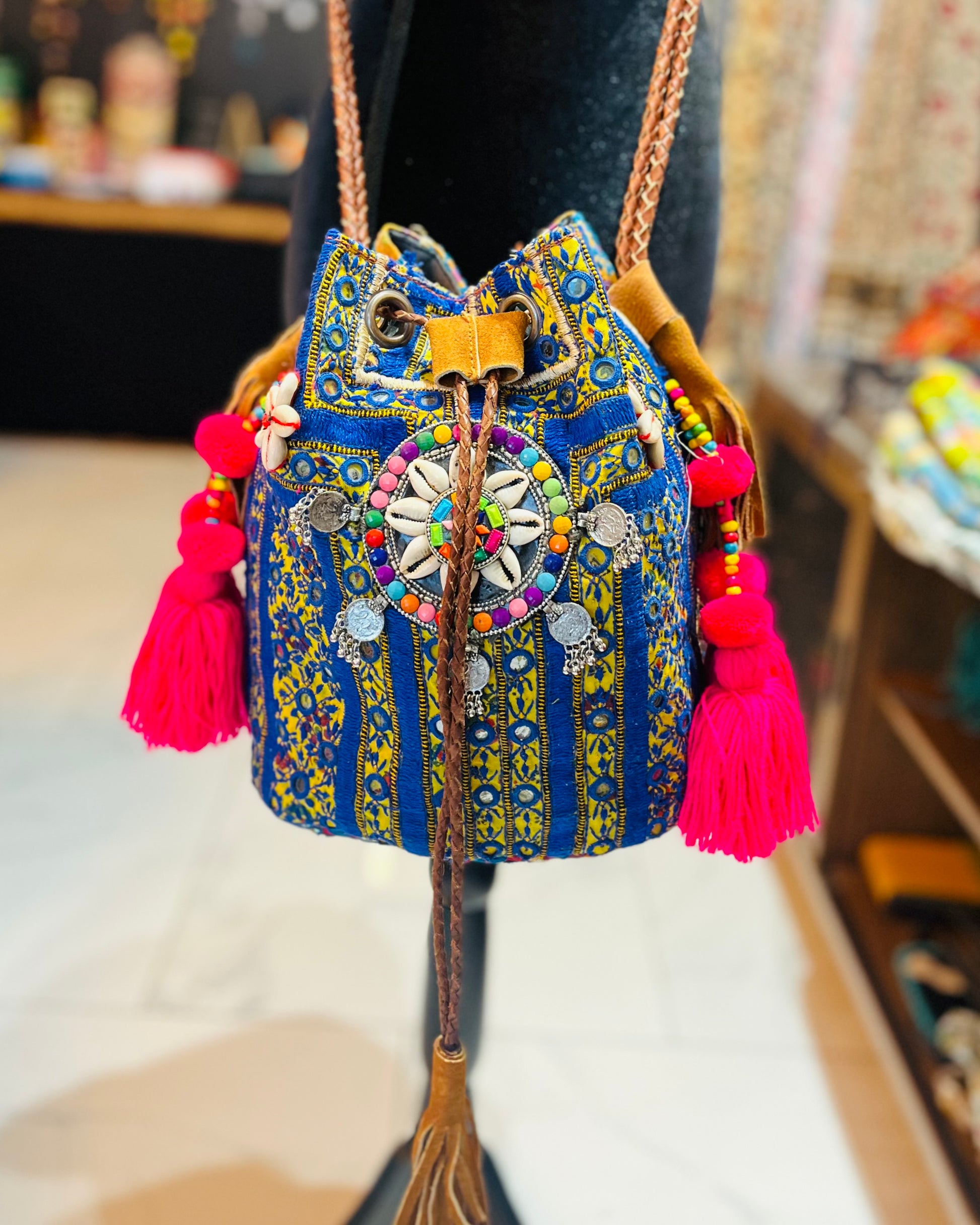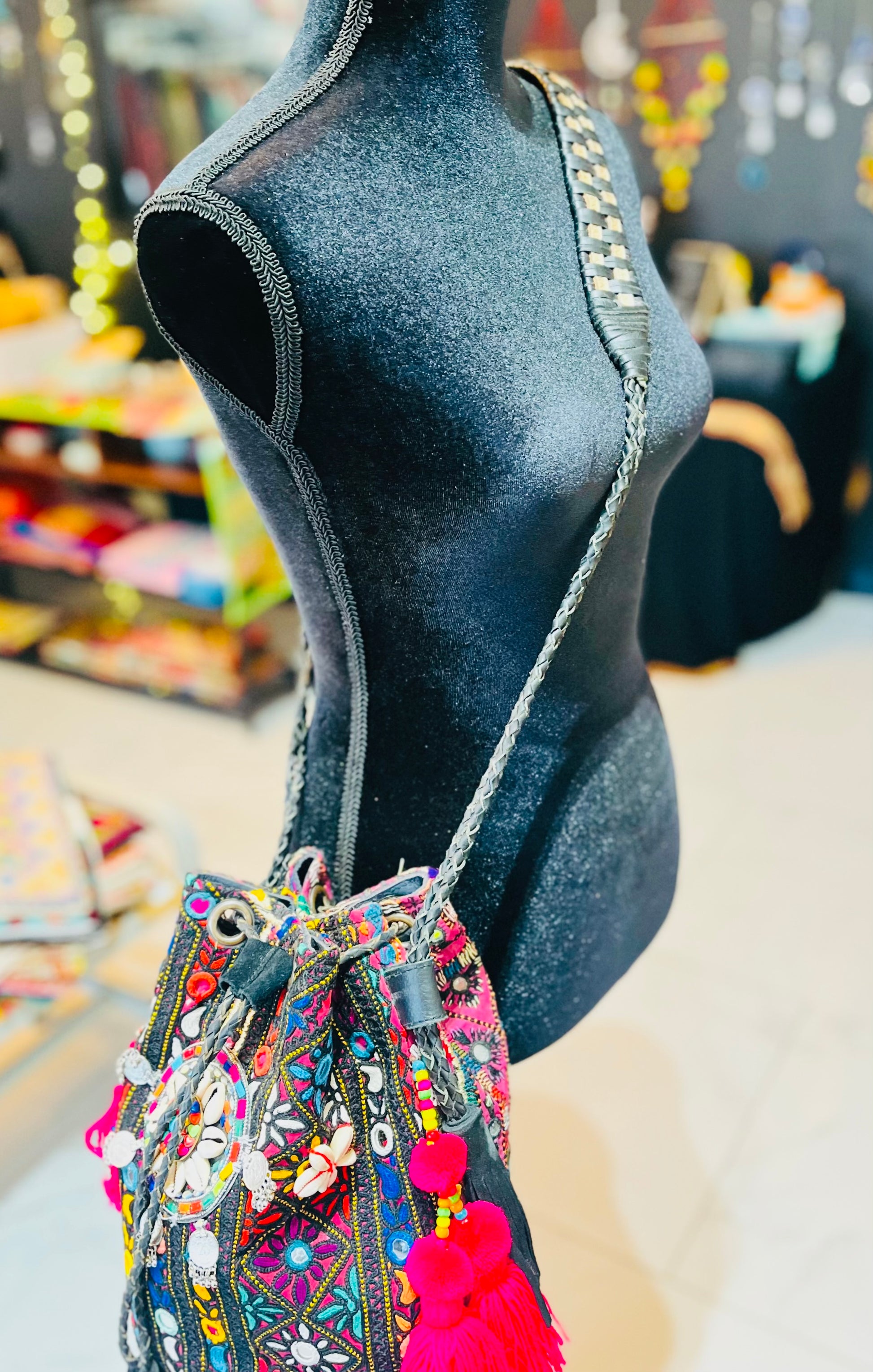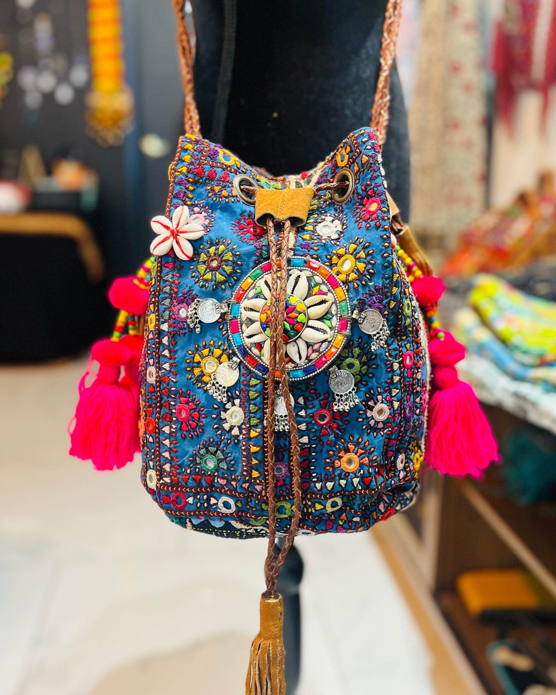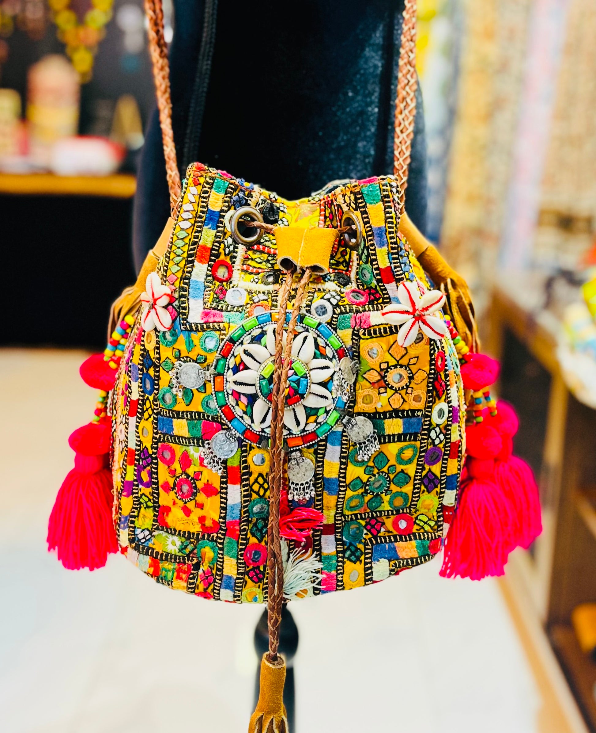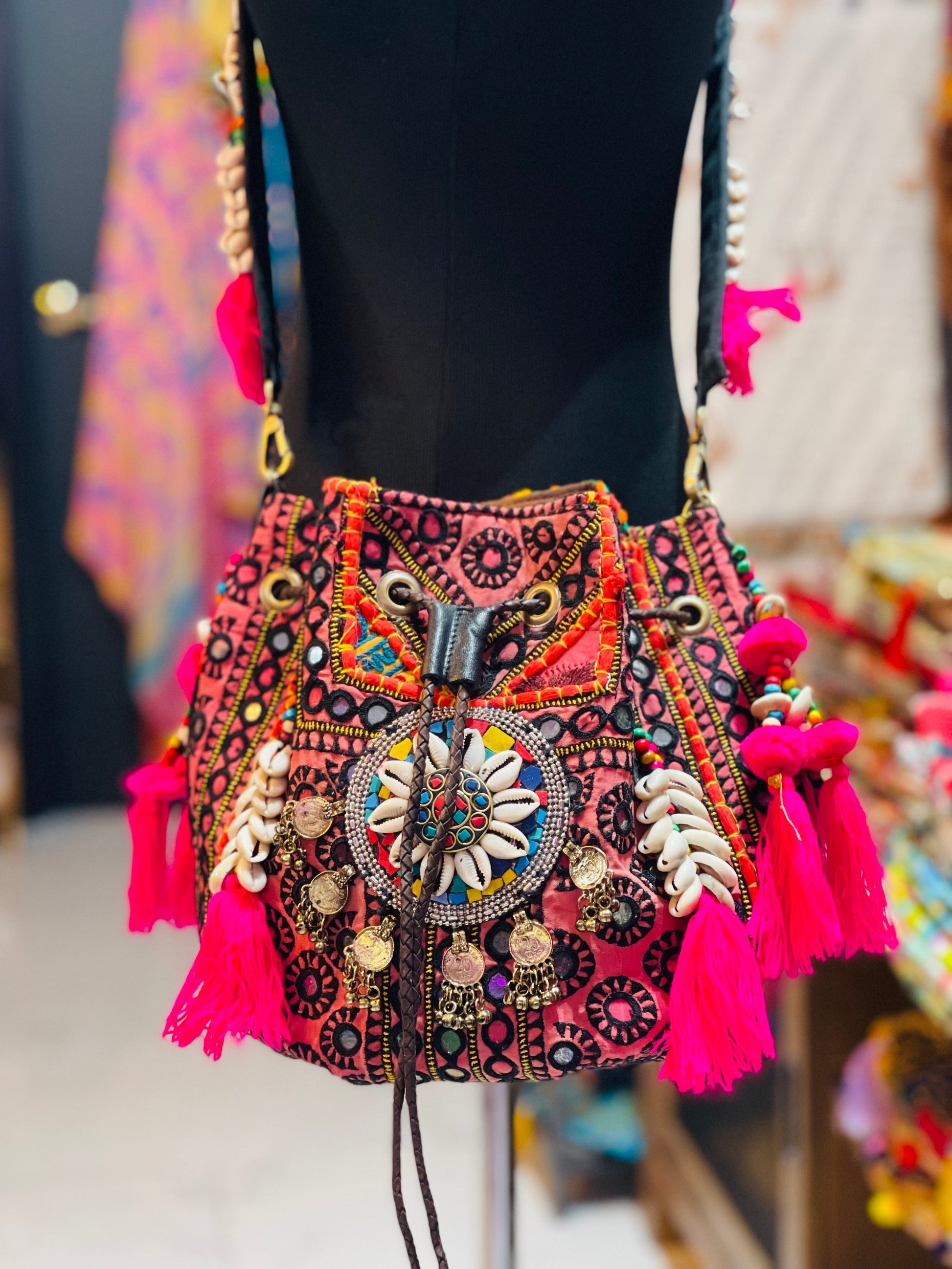 Unveil the allure of bohemian fashion with our enchanting Potli Bag, some bags featuring a strap adorned with shells, mirrors, and bells; and some bags with braided leather strap.