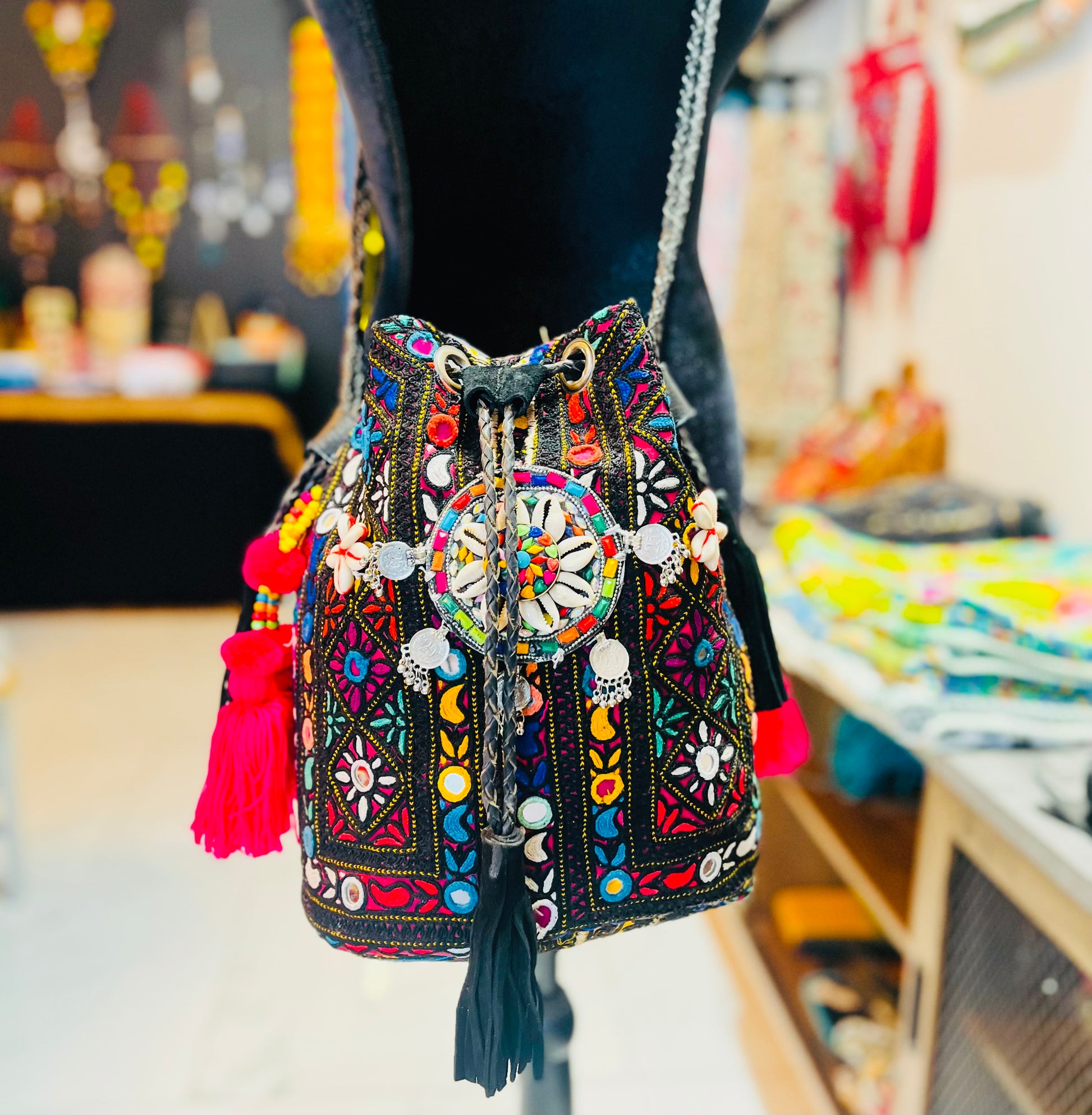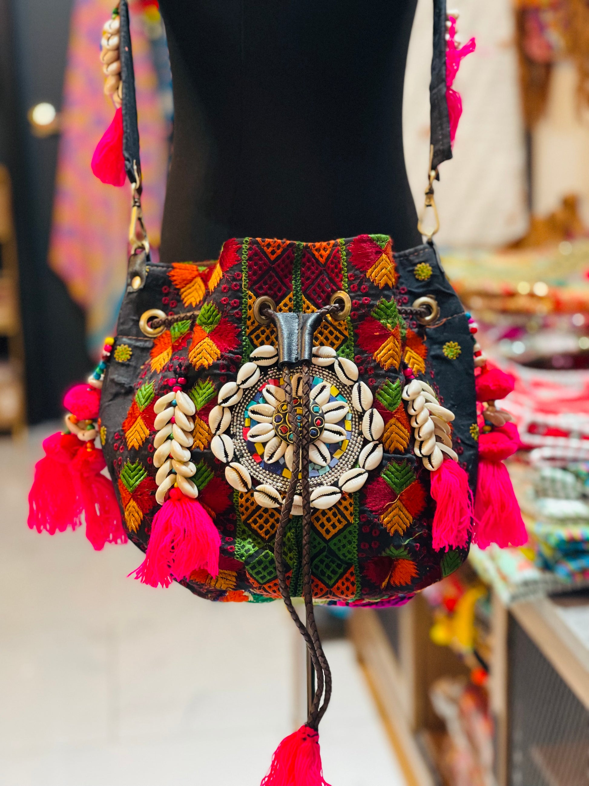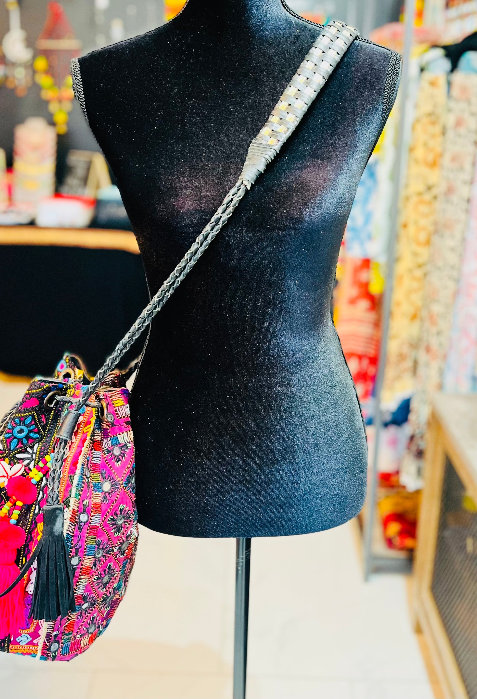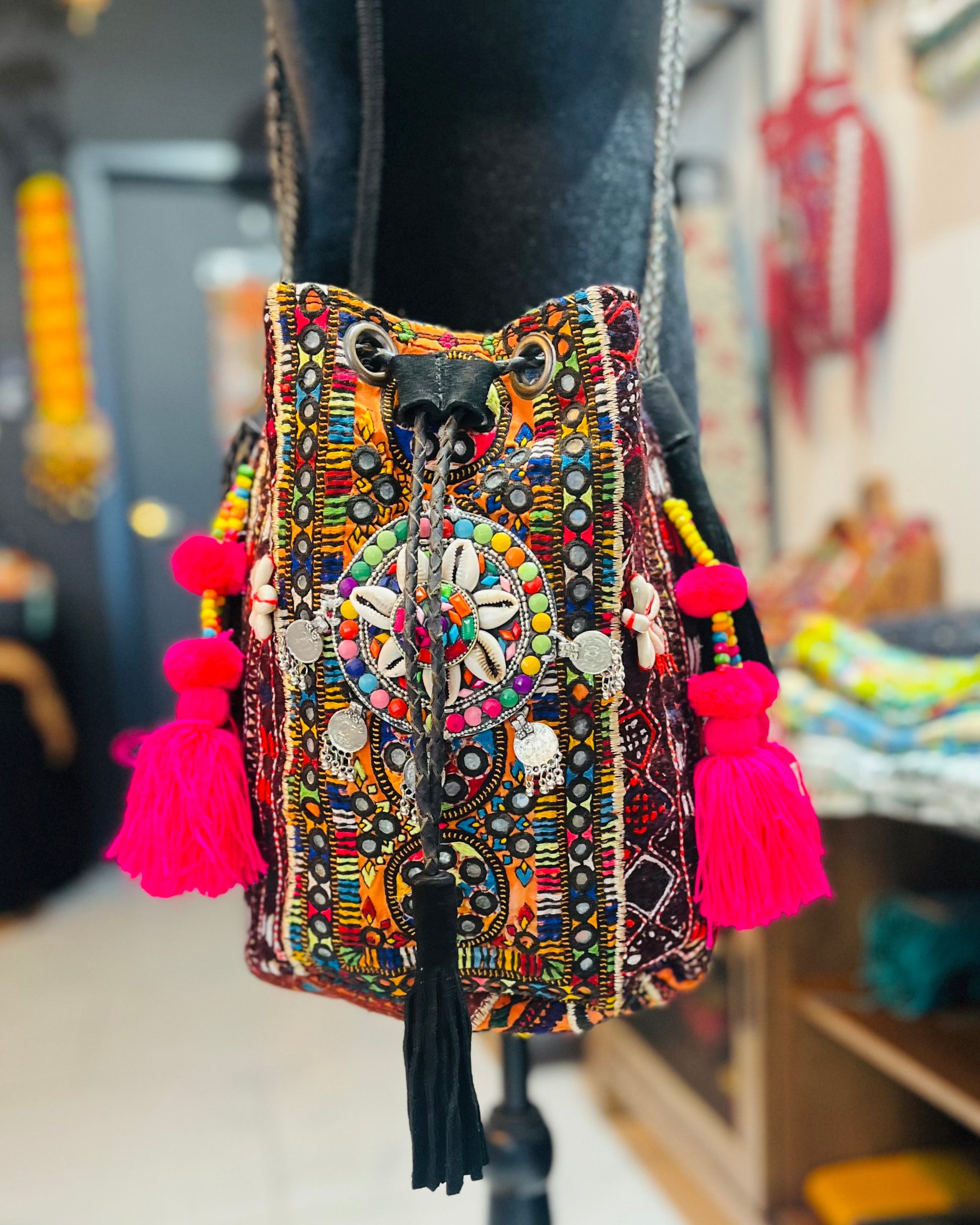 Unveil the allure of bohemian fashion with our enchanting Potli Bag, some bags featuring a strap adorned with shells, mirrors, and bells; and some bags with braided leather strap.