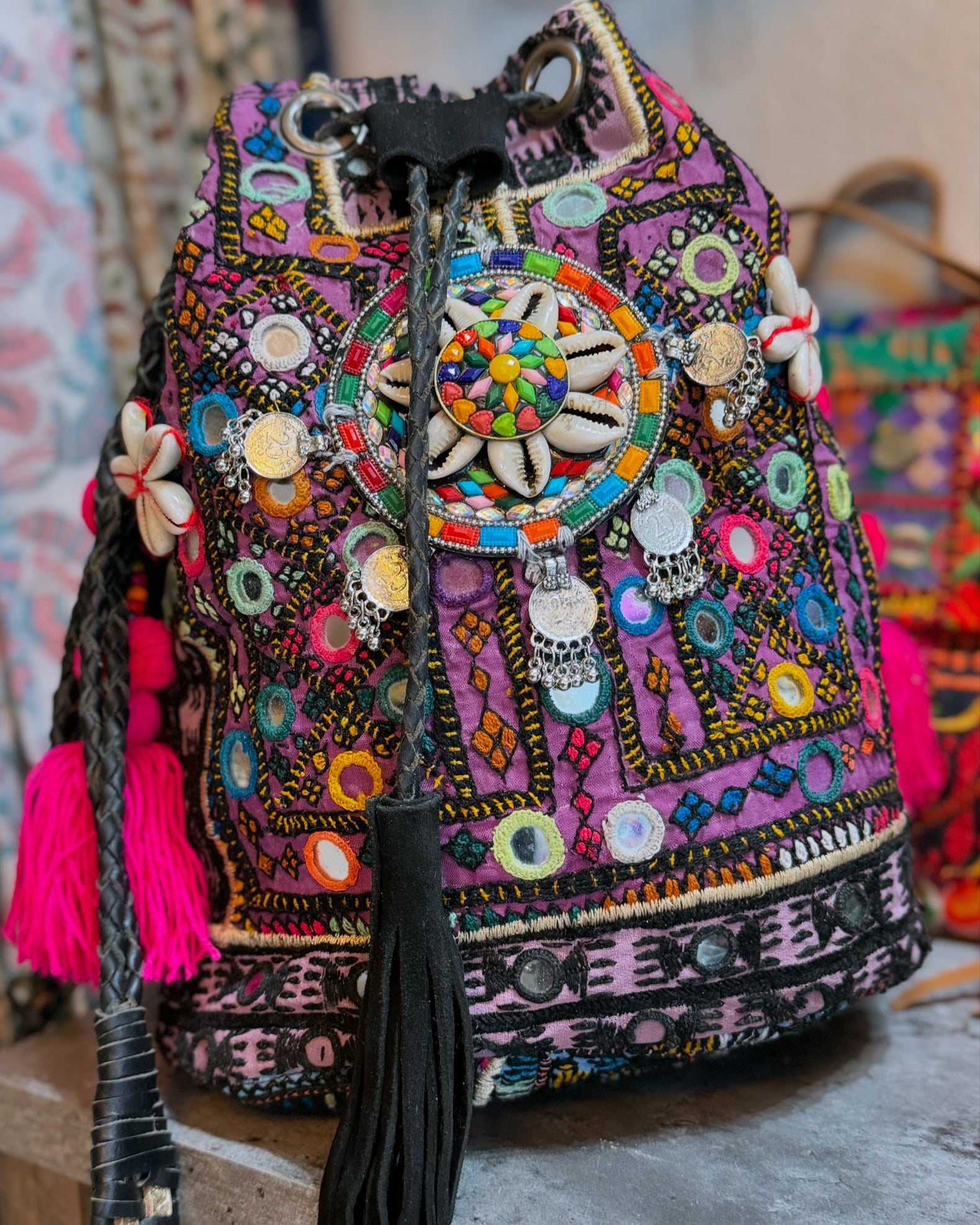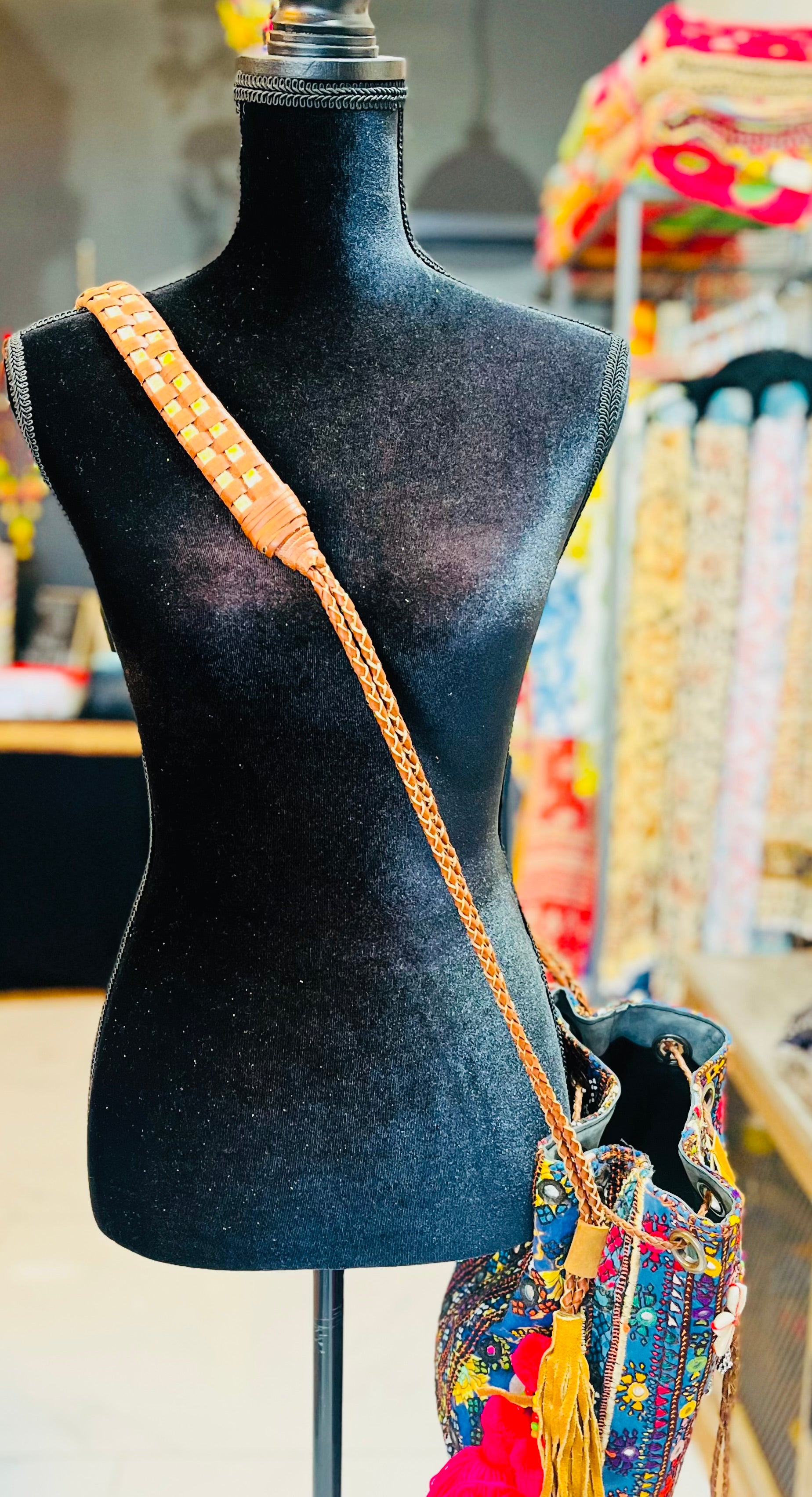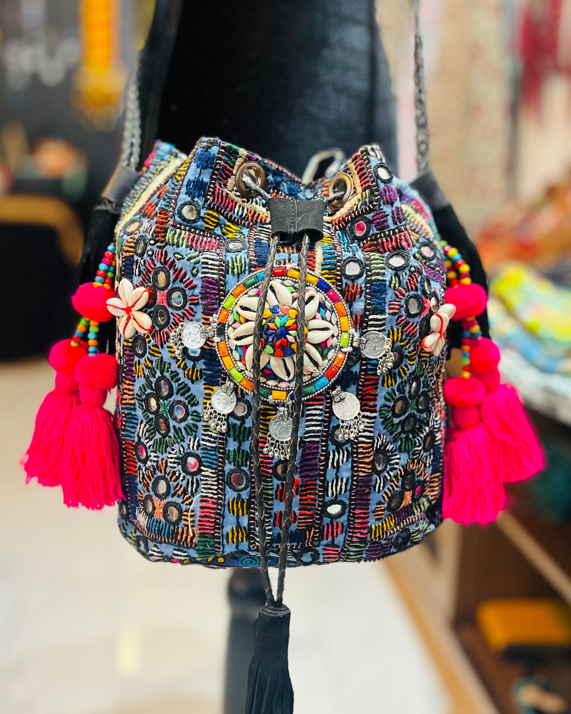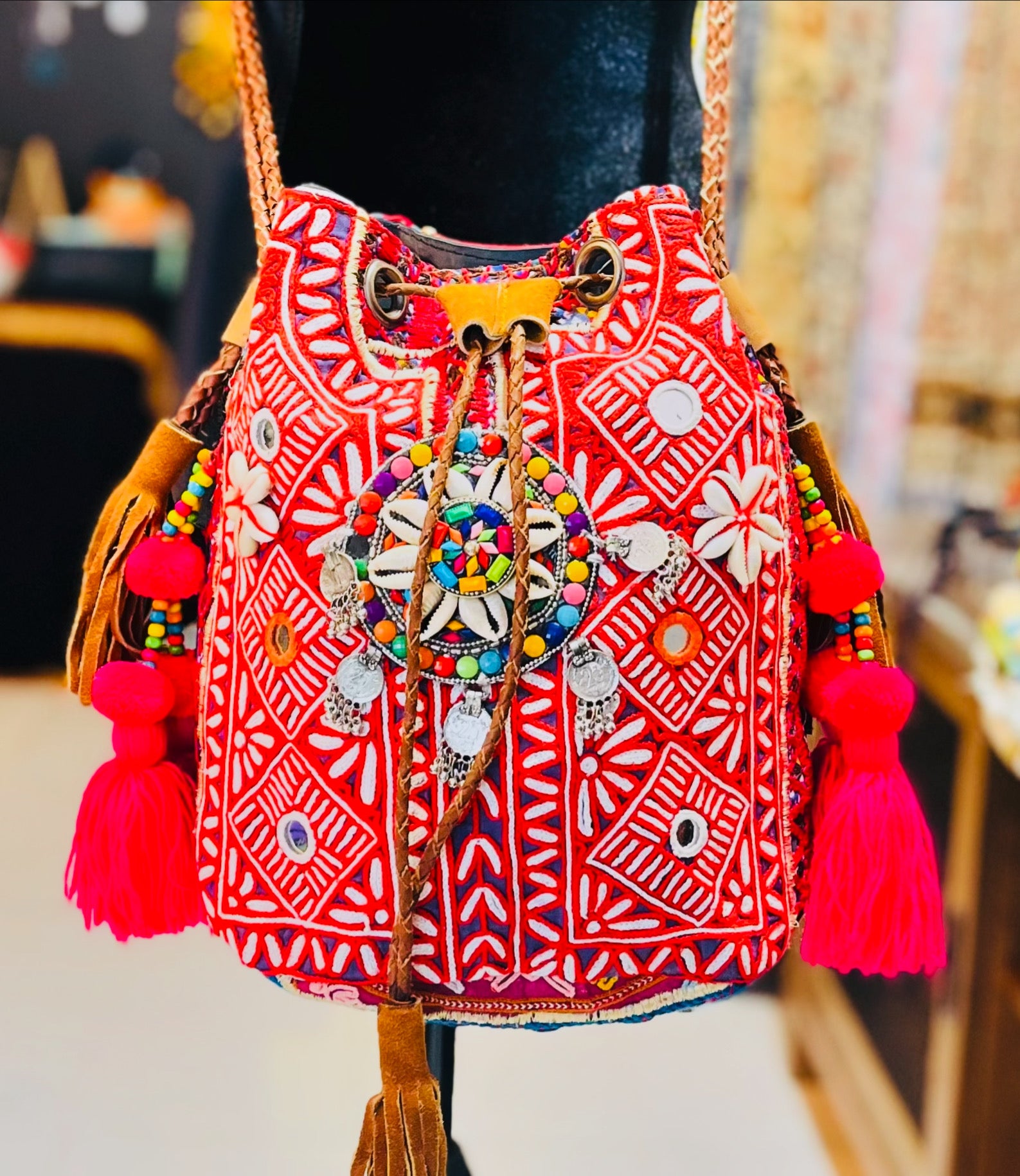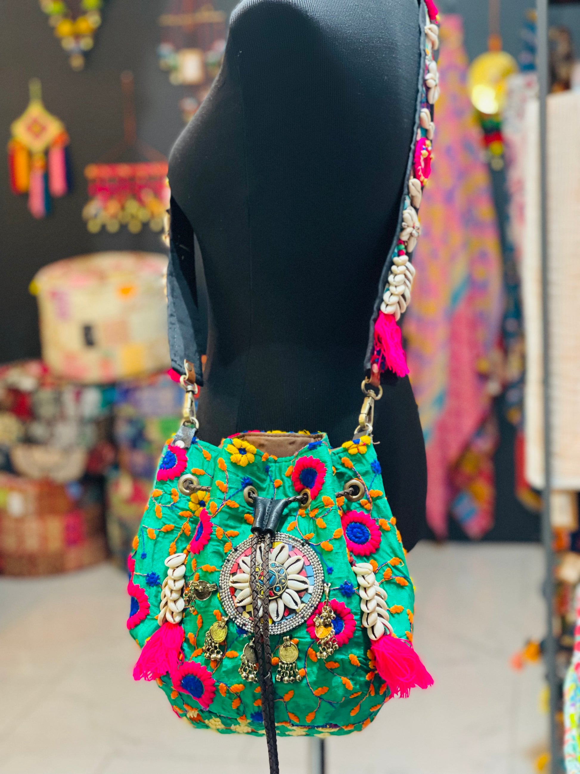 Unveil the allure of bohemian fashion with our enchanting Potli Bag, some bags featuring a strap adorned with shells, mirrors, and bells; and some bags with braided leather strap.