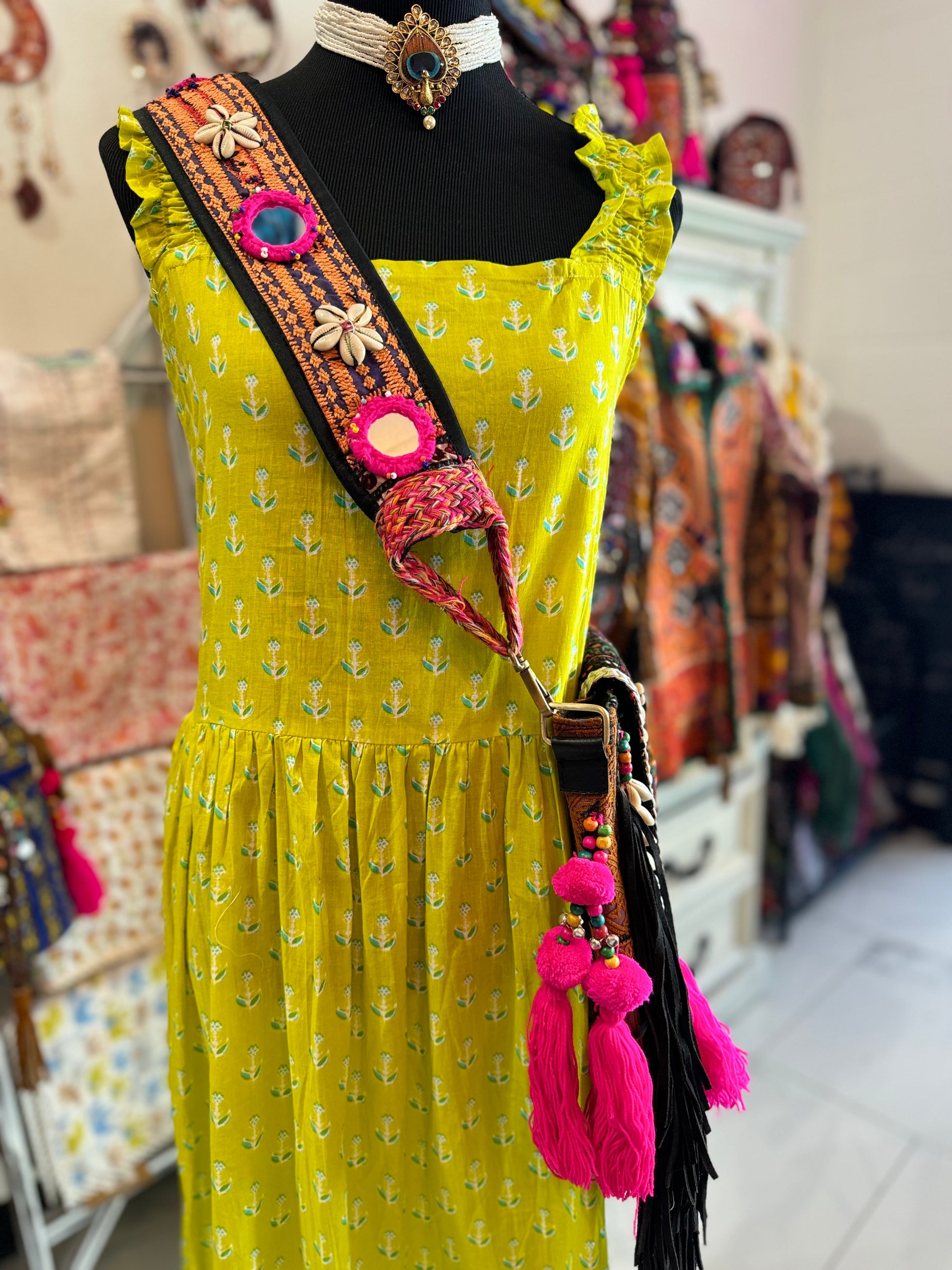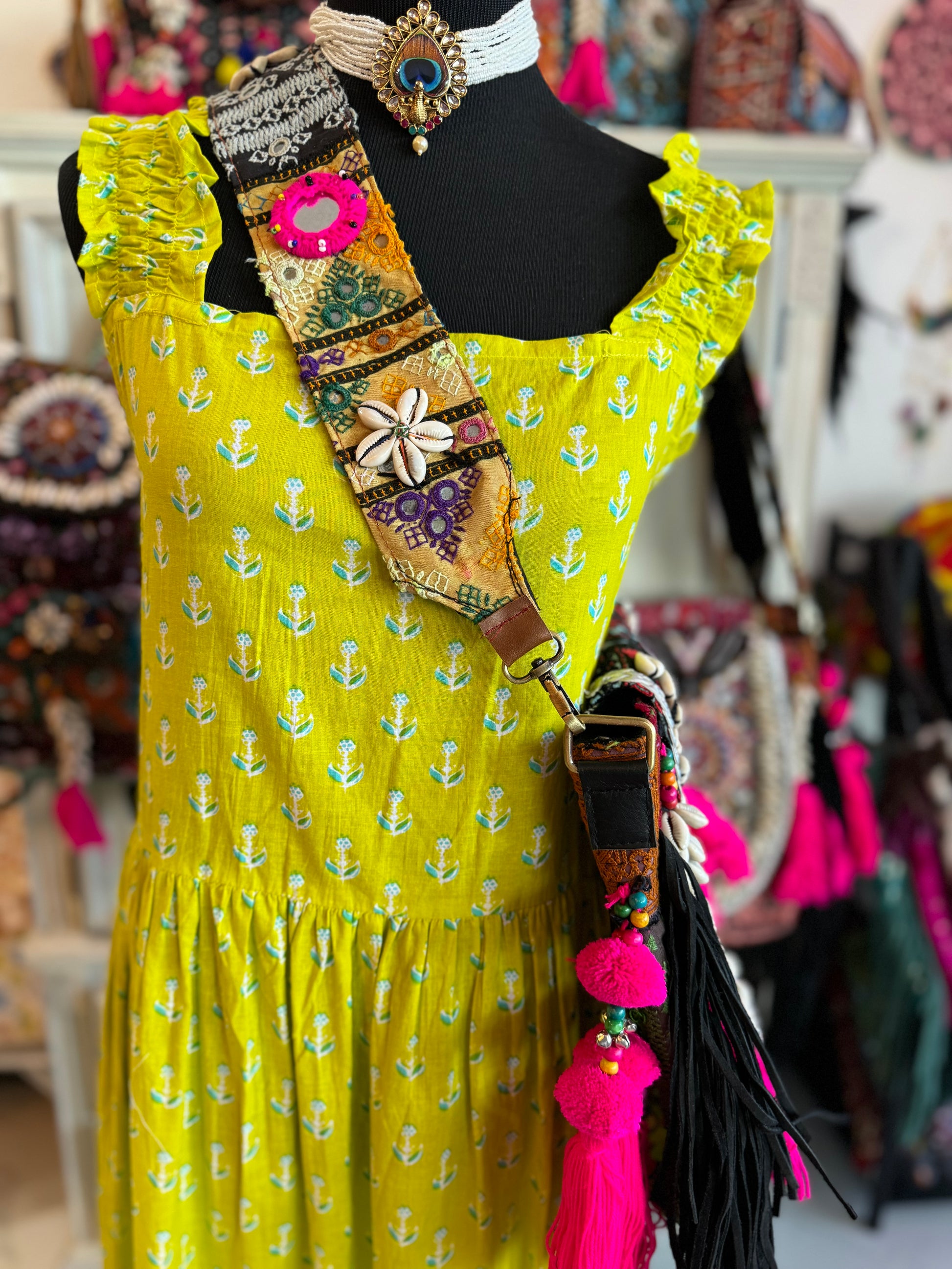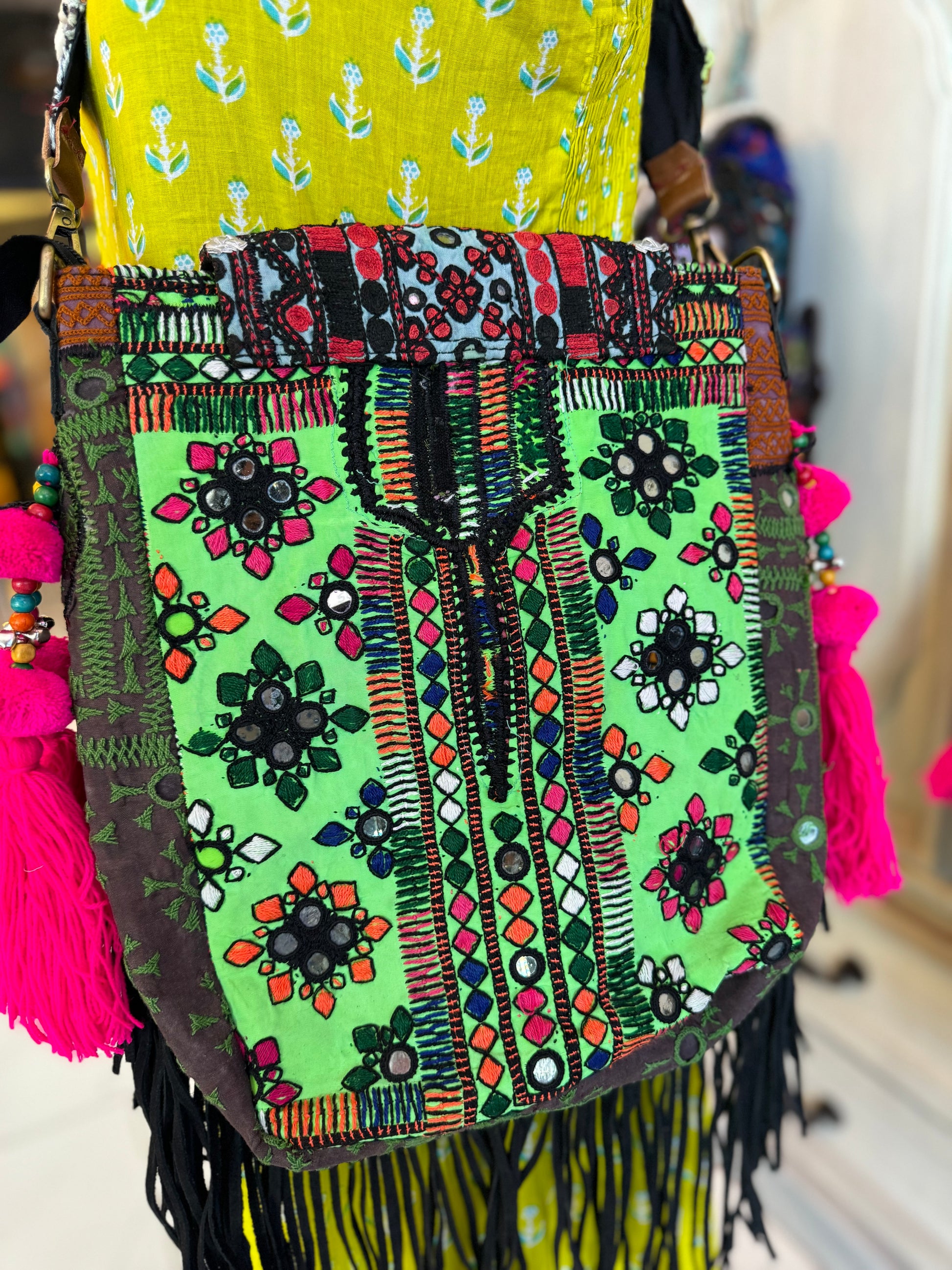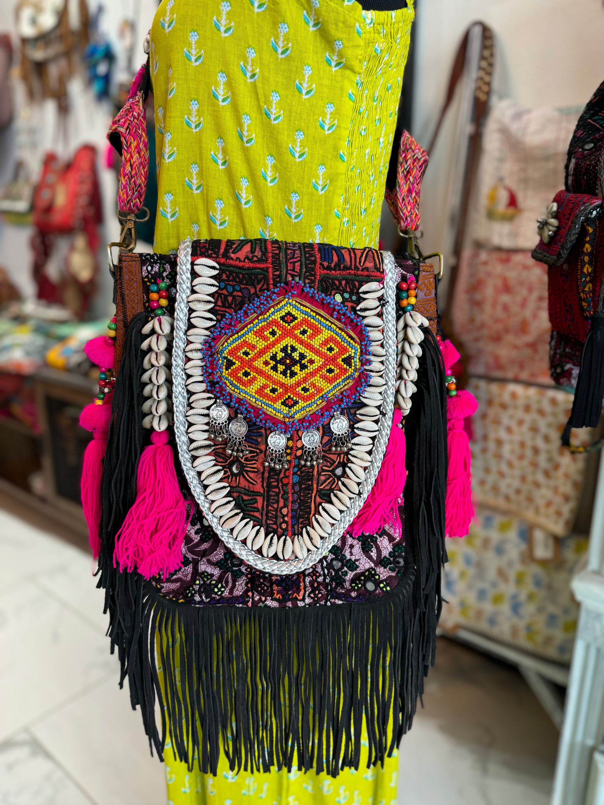 Introducing our Boho Bag, a true work of art handmade from beautifully embroidered patches and lavishly decorated with shells, coins, mirrors, beads, fringes, and tassels. This unique and exclusive bag features deep pockets with a secure zipper enclosure to keep your essentials safe. The detachable leather strap, adorned with mirrors and additional embellishments, adds versatility and extra flair. Perfect for those who love to stand out, this bag is a stunning addition to any wardrobe.