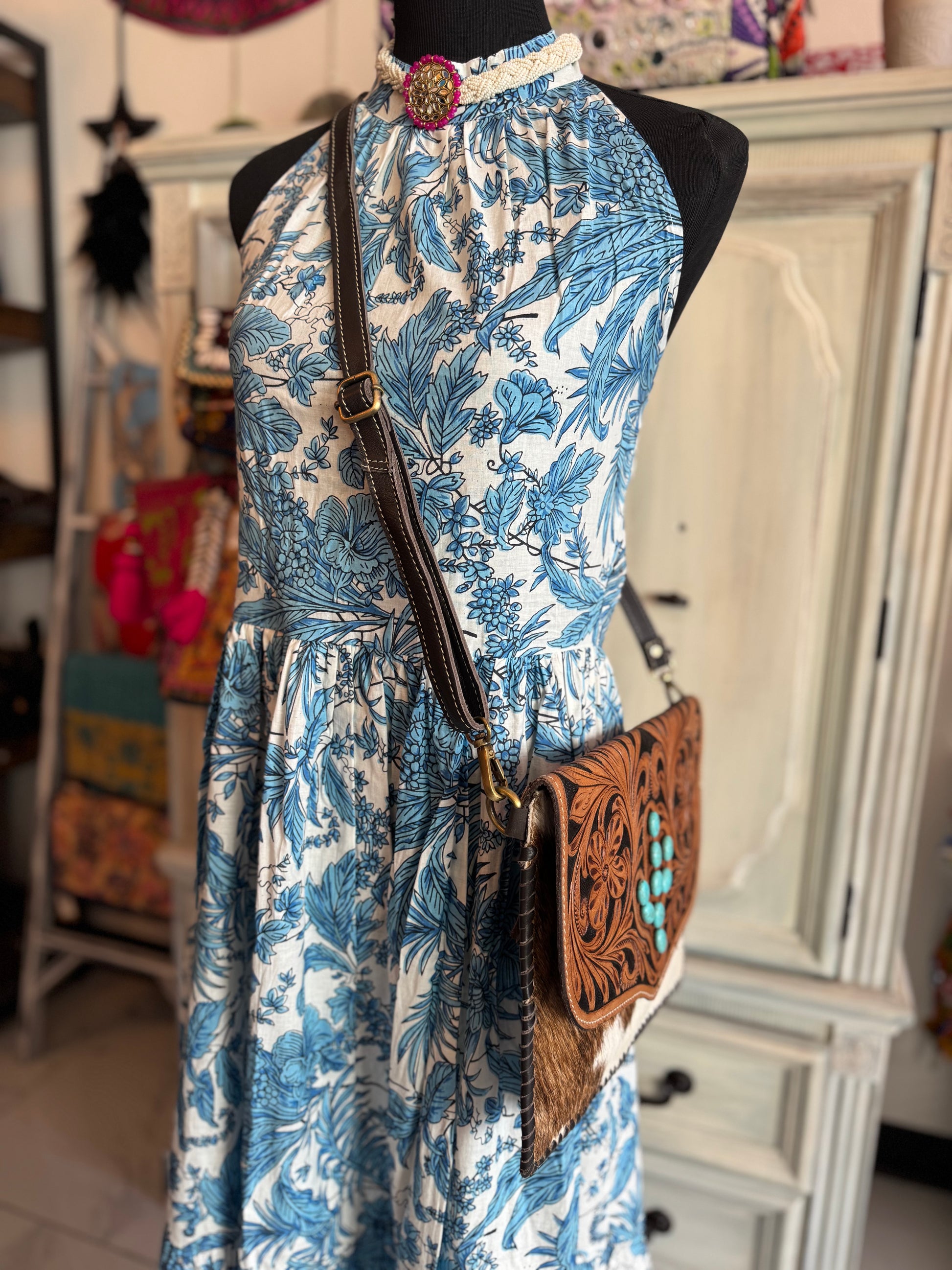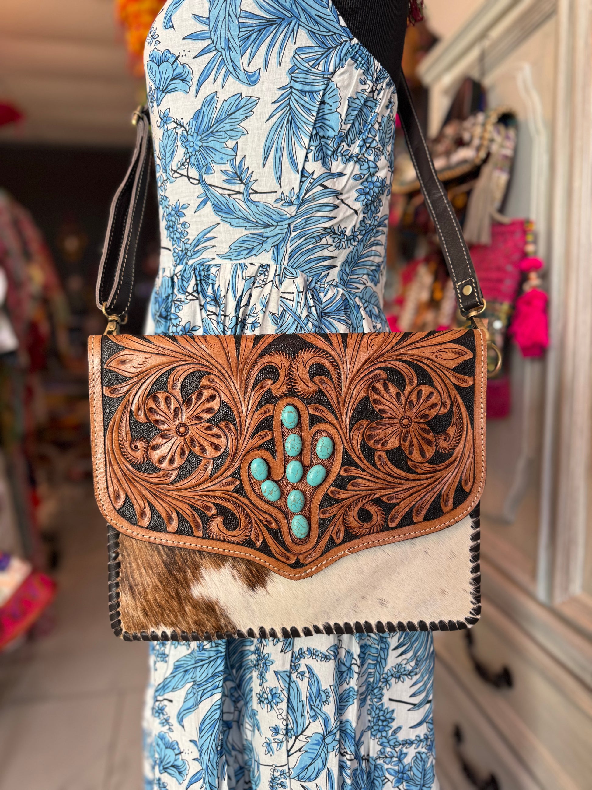 Texas Turquoise Tooled Leather & Cowhide Shoulder Bag