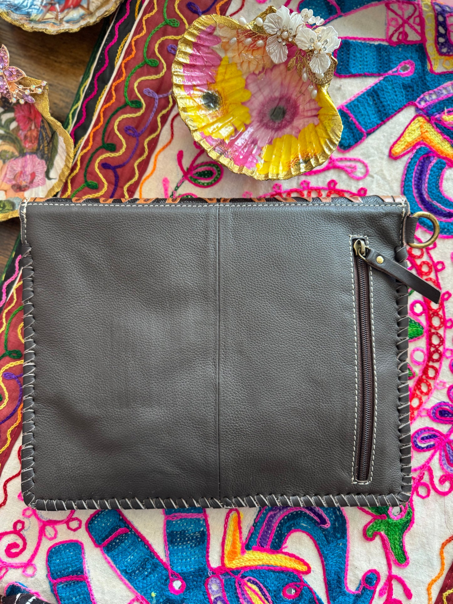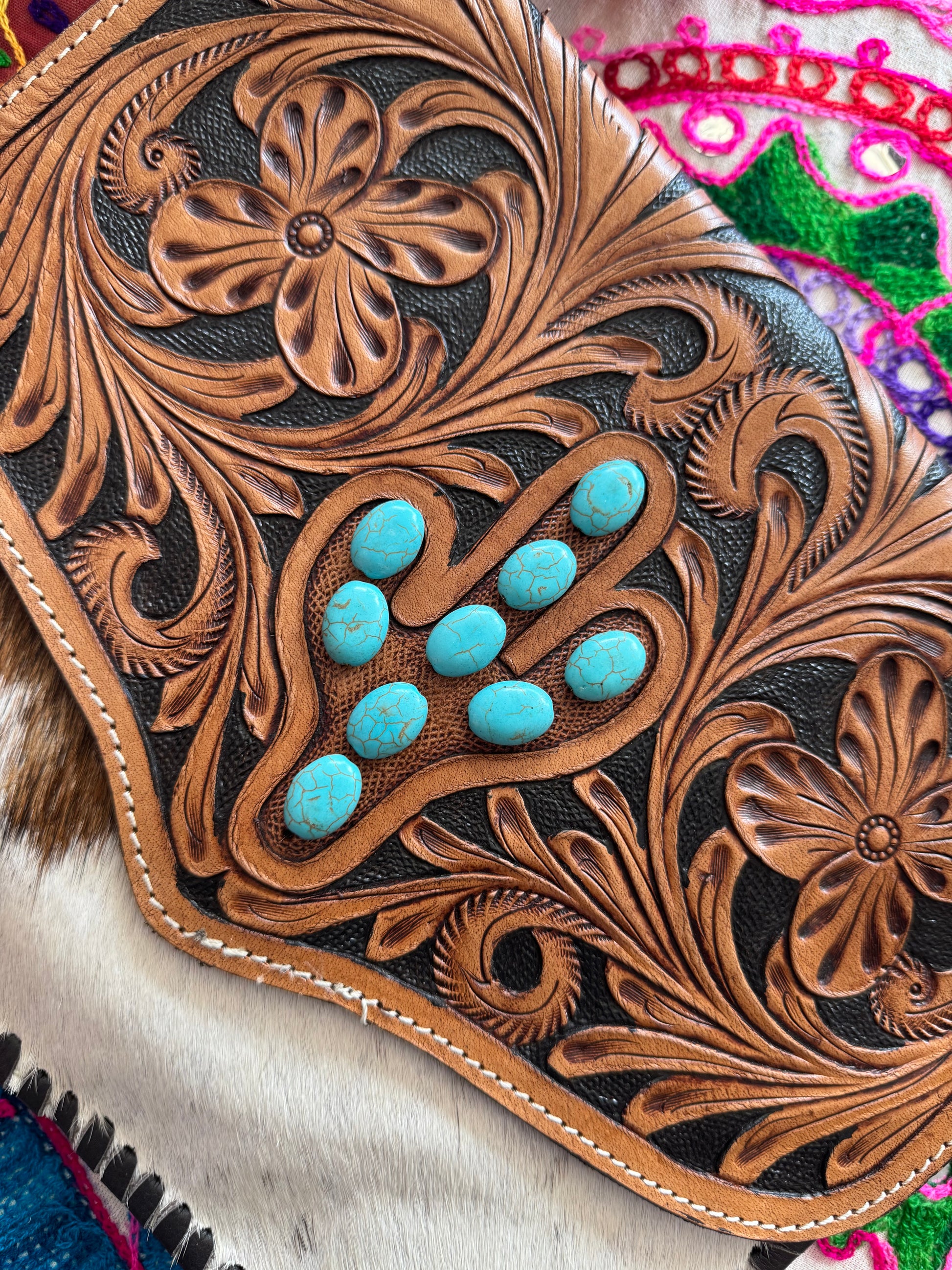 - Hand-tooled floral and cactus design