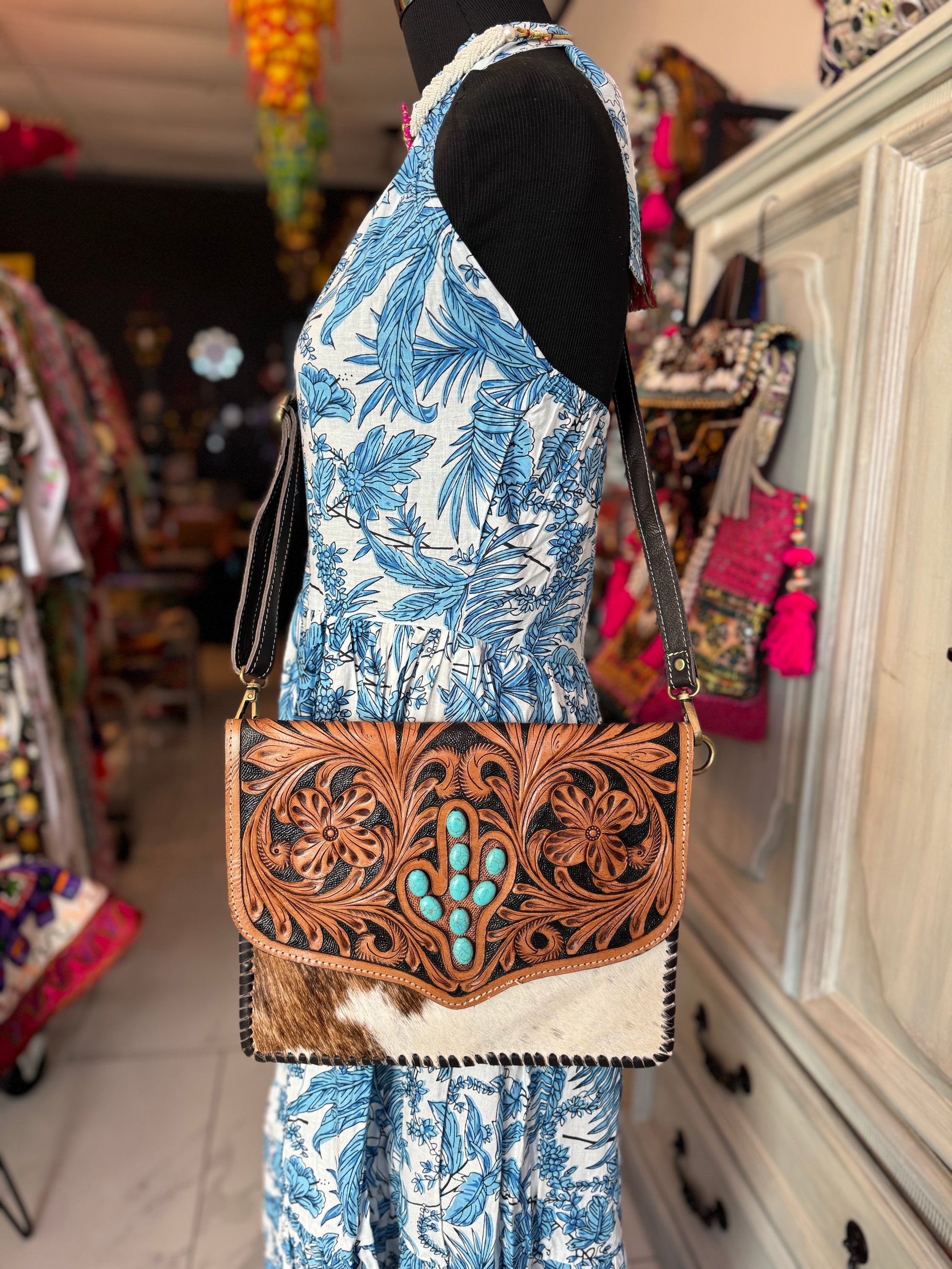 This handcrafted shoulder bag is a tribute to the wild, vibrant spirit of Texas. Made with genuine cowhide and intricately hand-tooled leather, it features a bold floral design and a stunning cactus motif inlaid with turquoise stones.