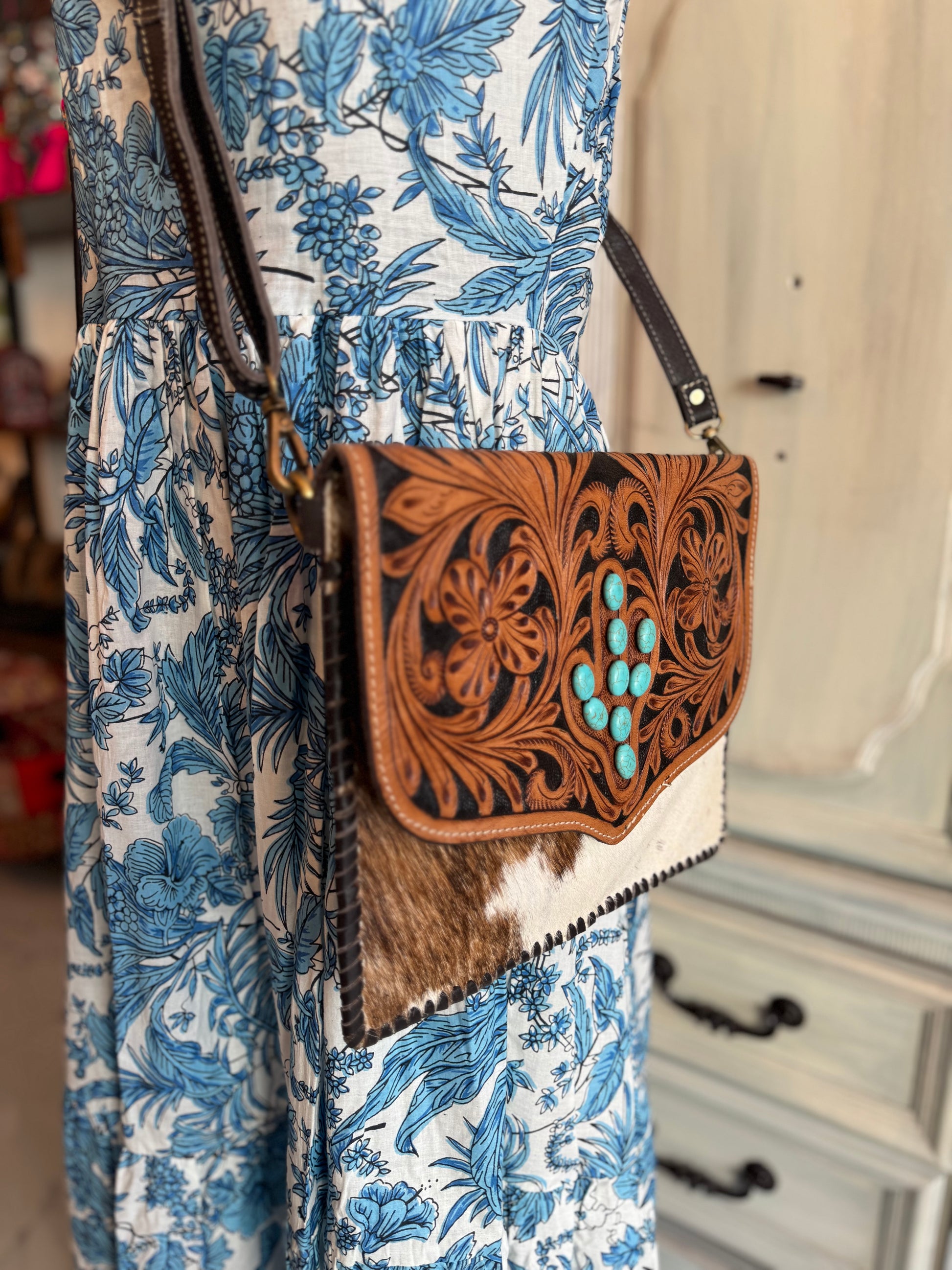 Cactus Bloom Tooled Leather Bag – Western Cowhide Crossbody with Turquoise Stones