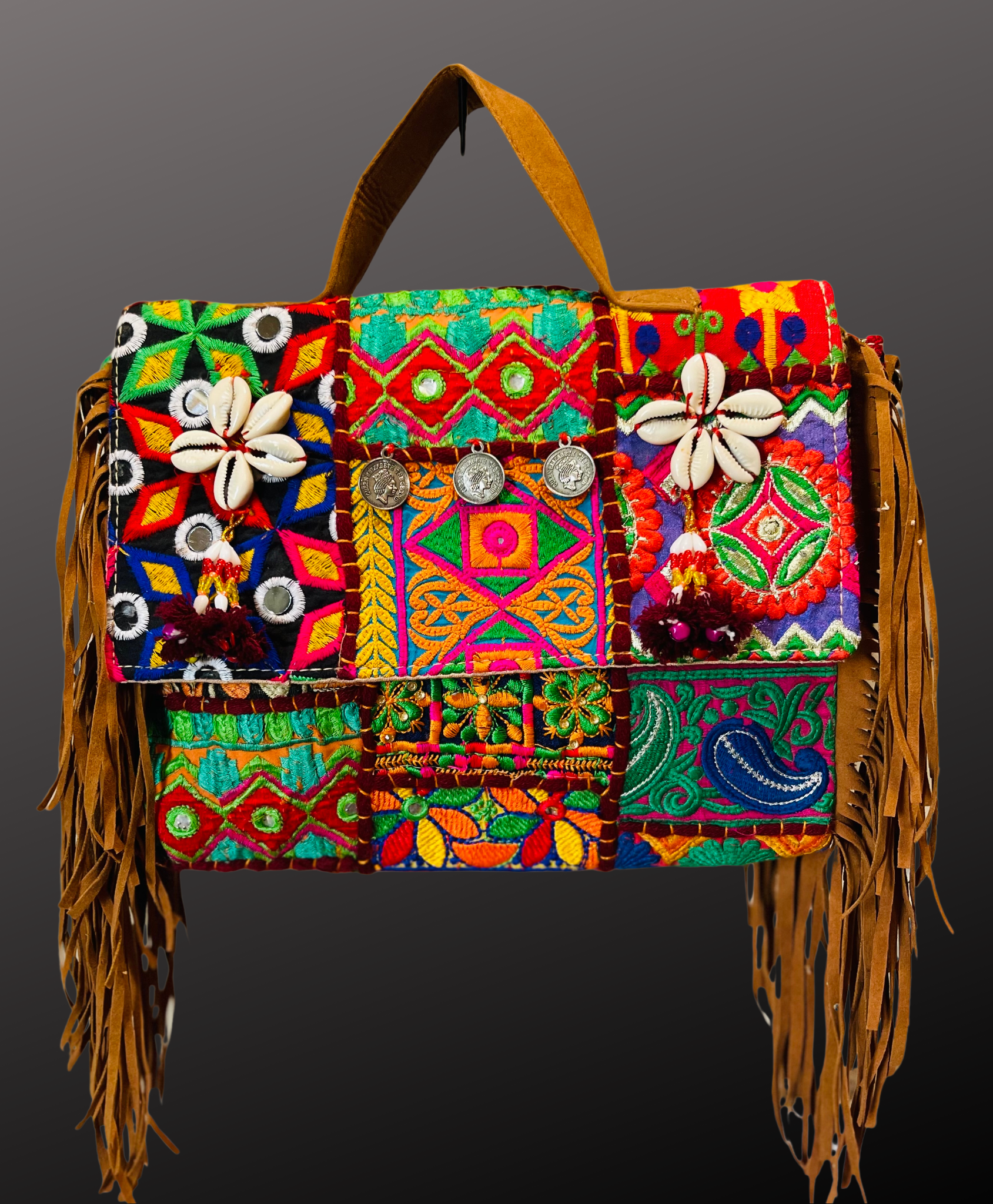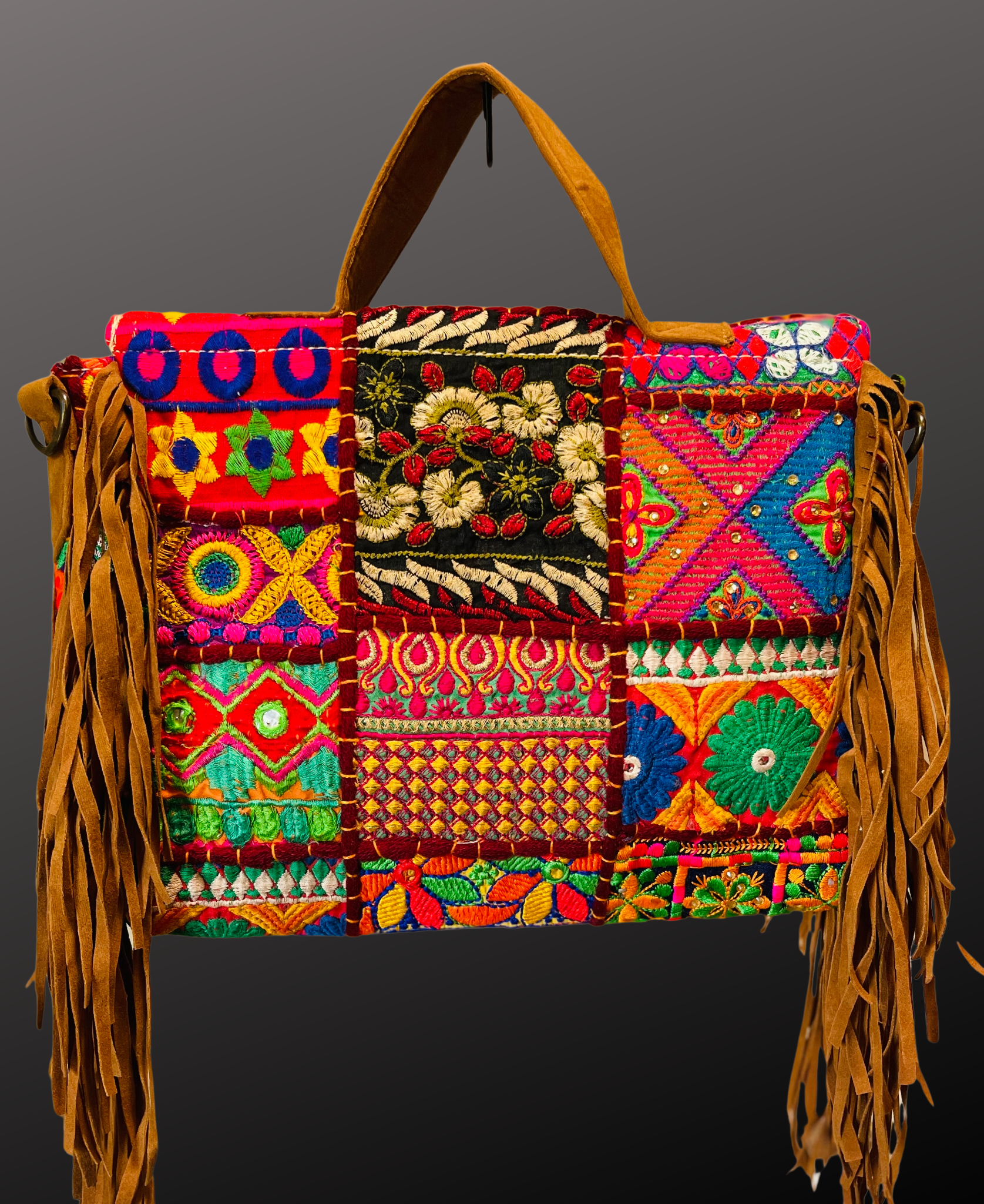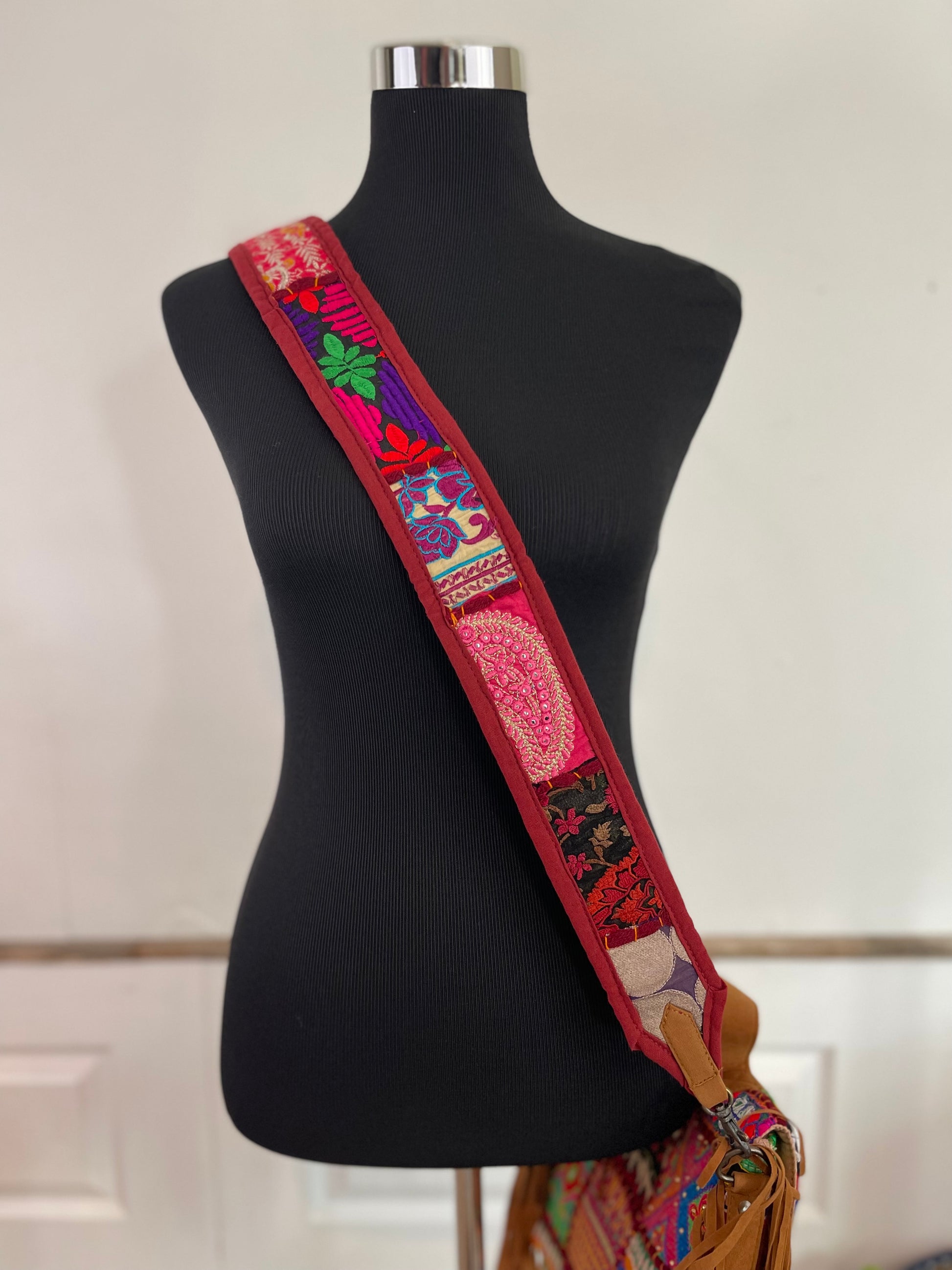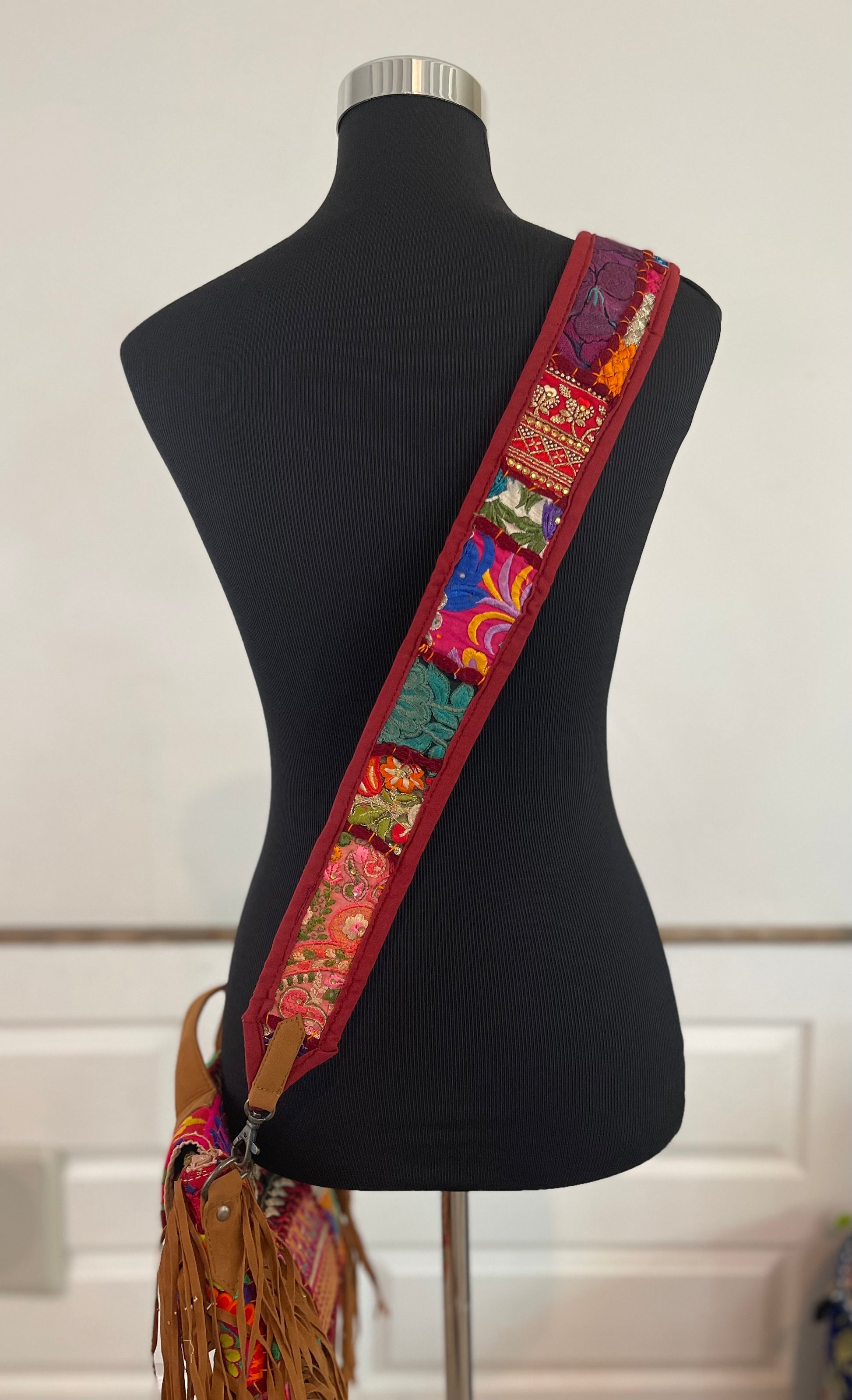 One of a kind Shoulder Bag with long strap, embroided patches decorated with stones, coins, beads and more. Removable long shoulder strap.
