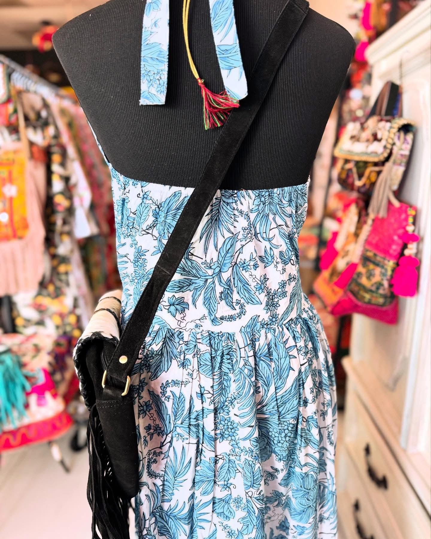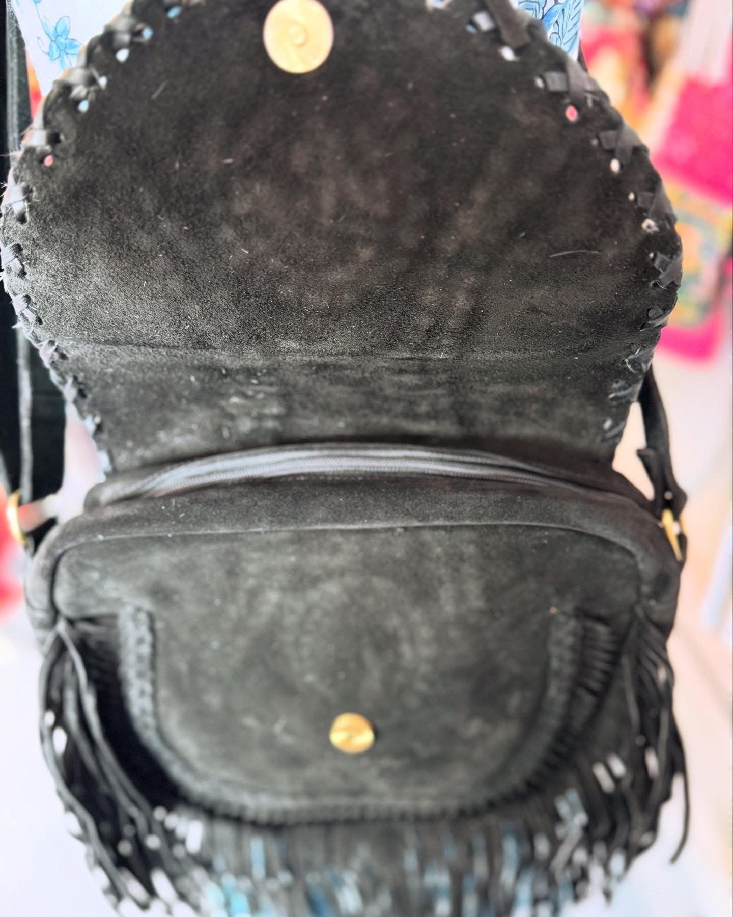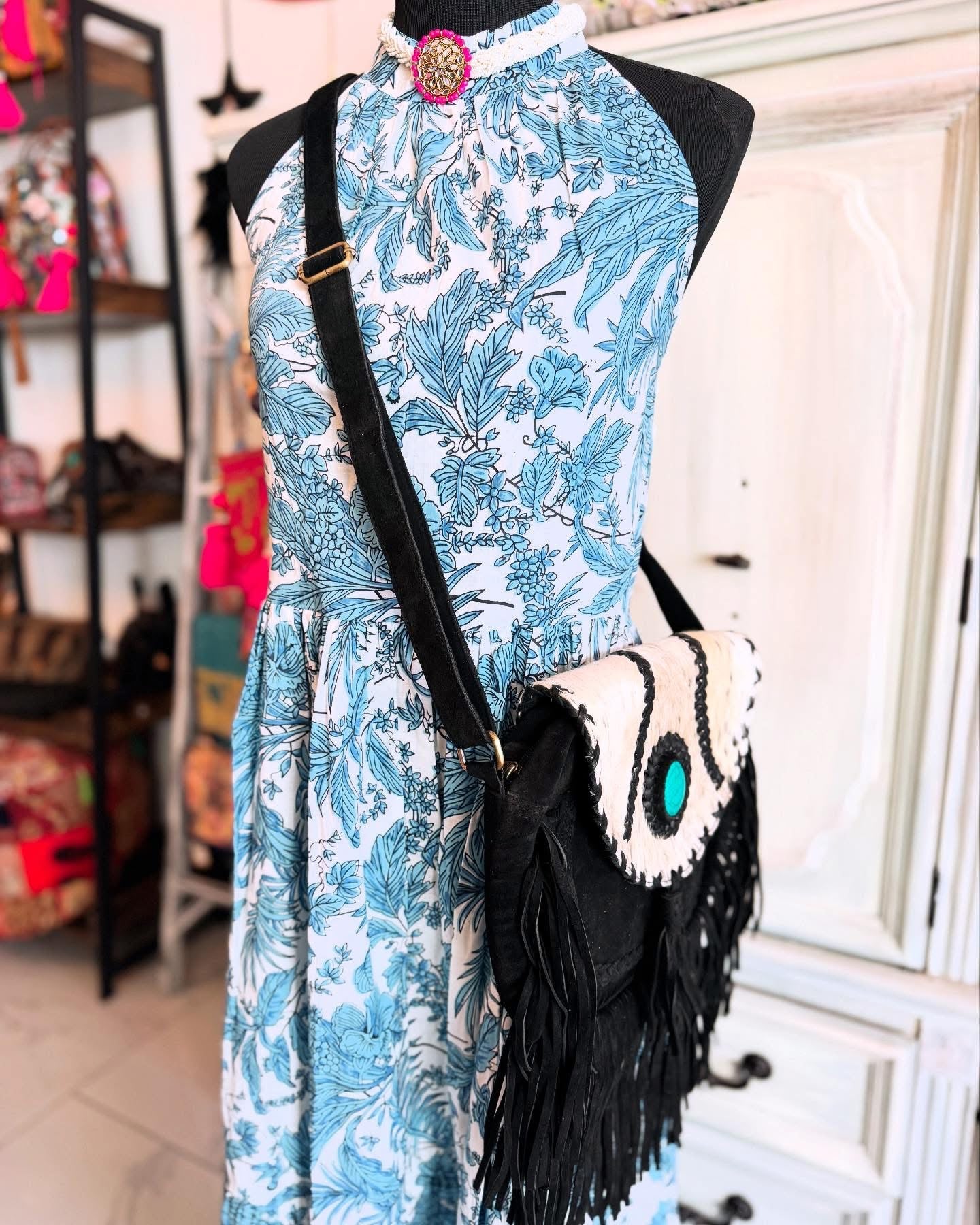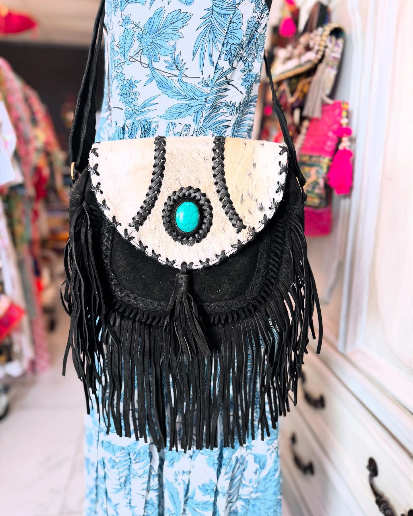 This handmade crossbody bag blends rugged charm with boho elegance. Featuring a mix of genuine leather and cowhide, it’s accented with black leather fringes and a striking turquoise stone at the center.