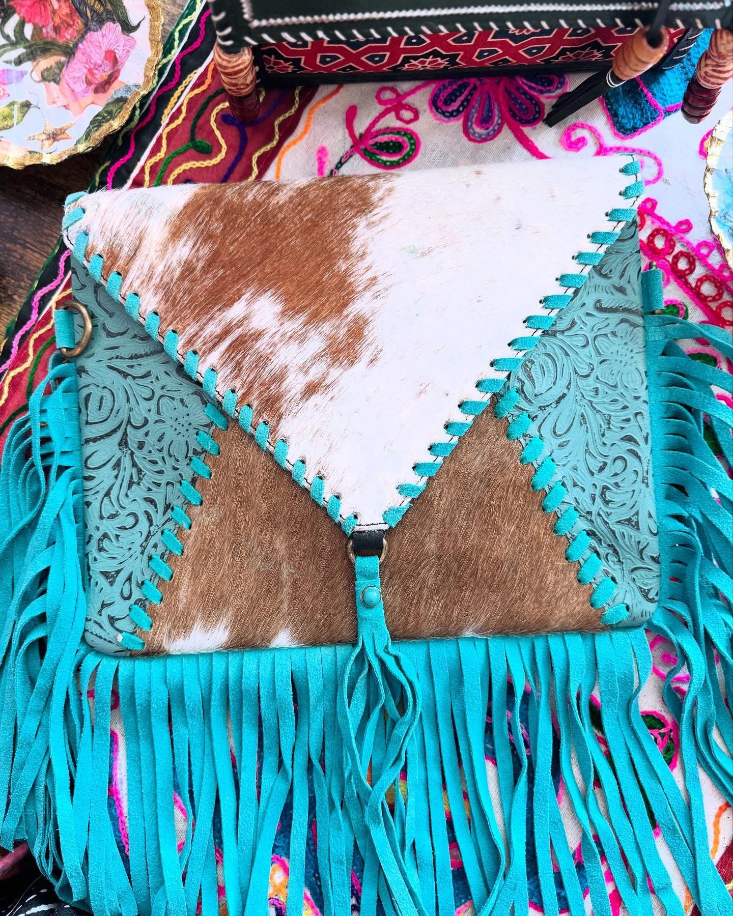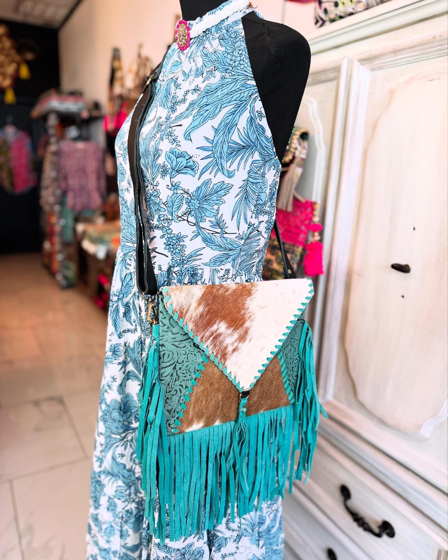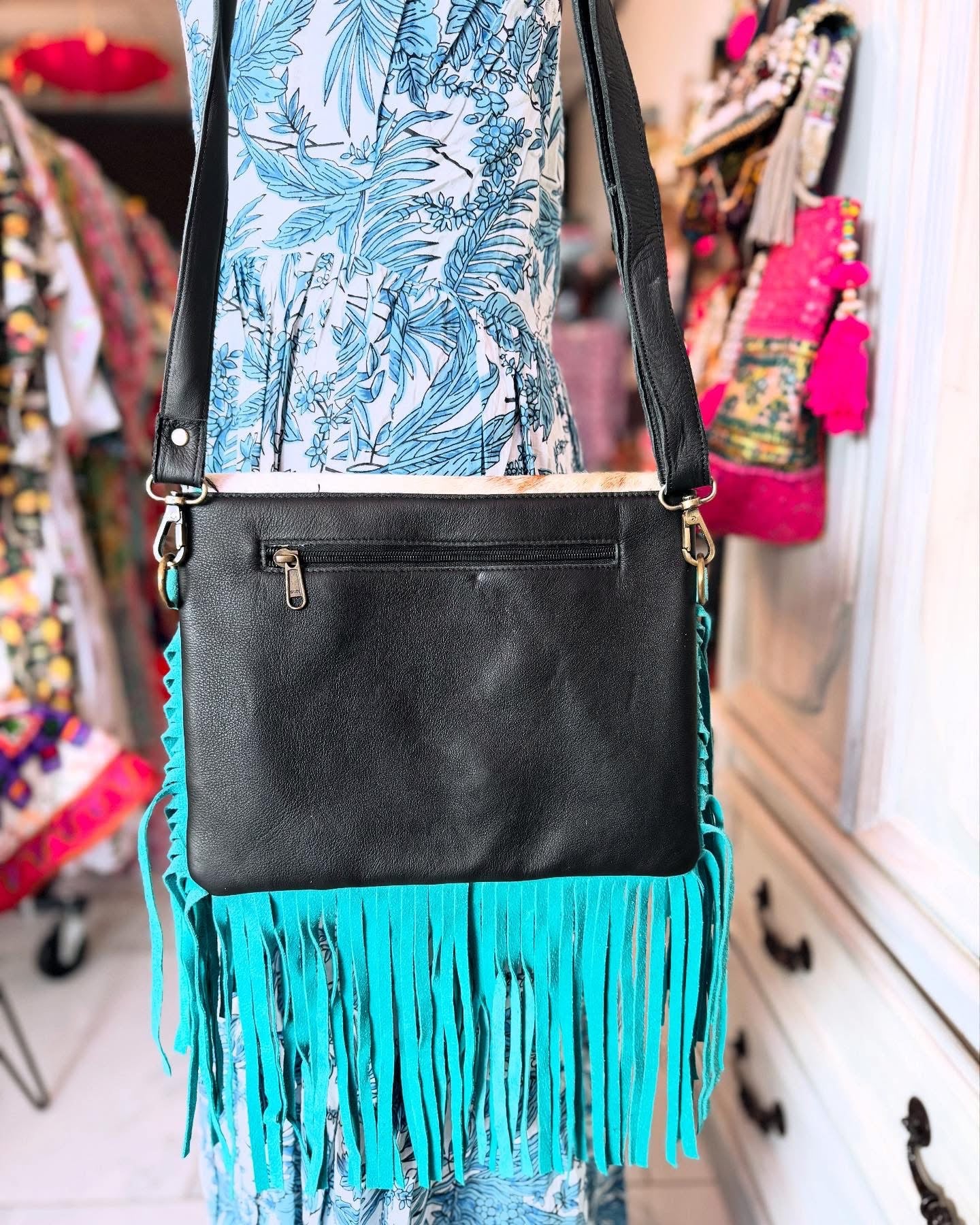 This handmade crossbody bag blends rugged charm with boho elegance. Featuring a mix of genuine leather and cowhide, it’s accented with turquoise leather fringes.