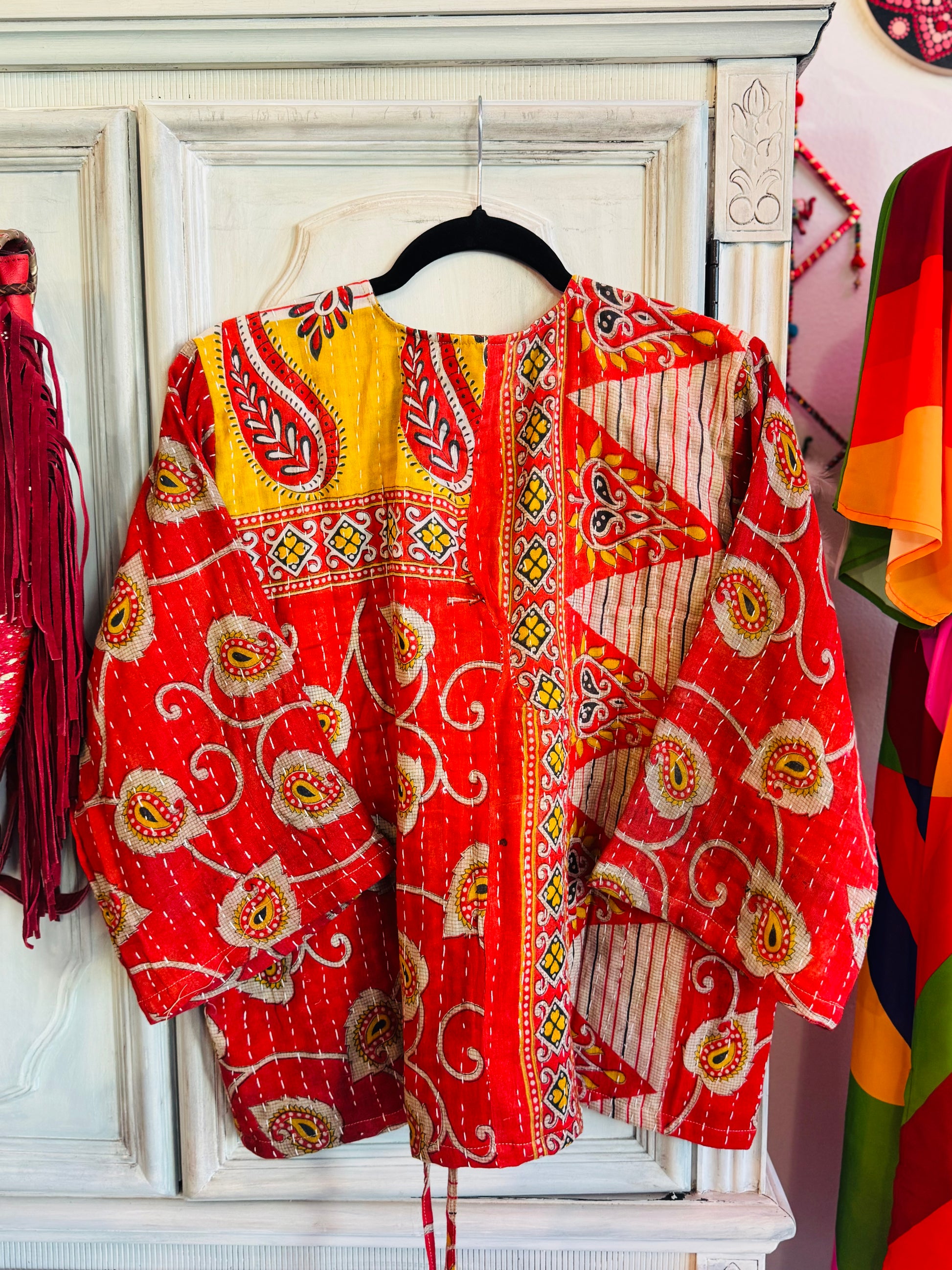 Bold, vibrant, and full of character, the Crimson Mosaic Butterfly 2-Way Top showcases striking geometric motifs layered with golden paisleys and red accents. Made from soft kantha-stitched cotton, it blends heritage artistry with modern boho style.
