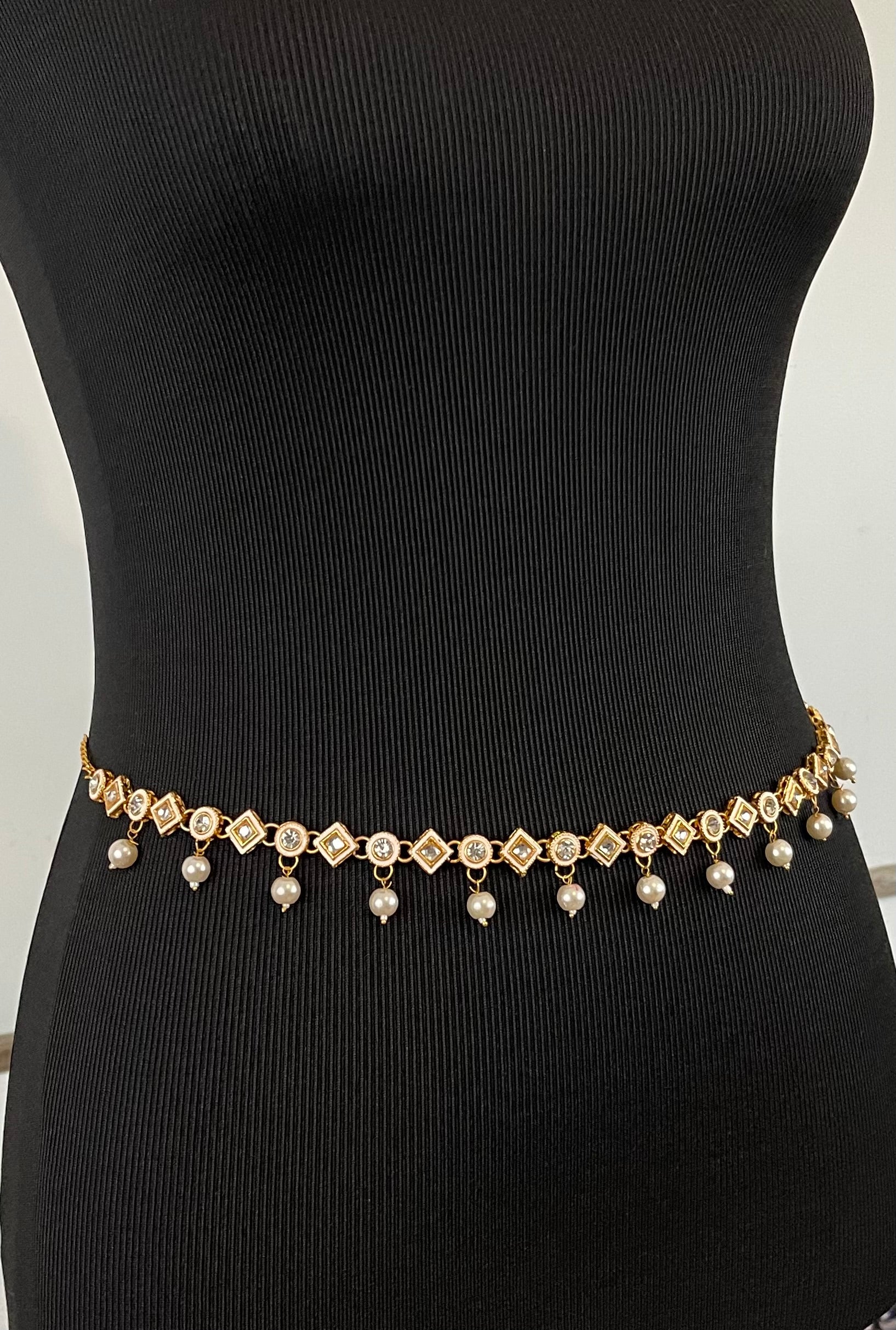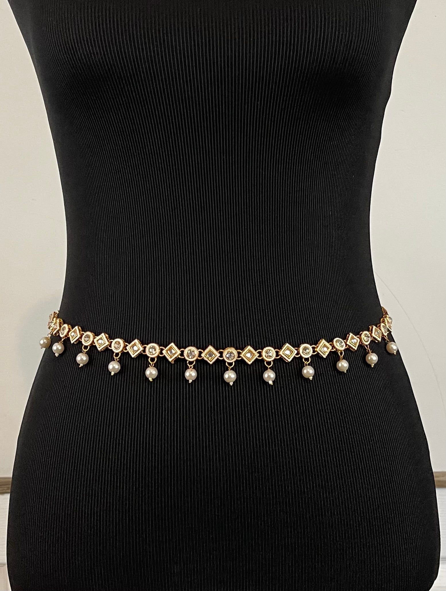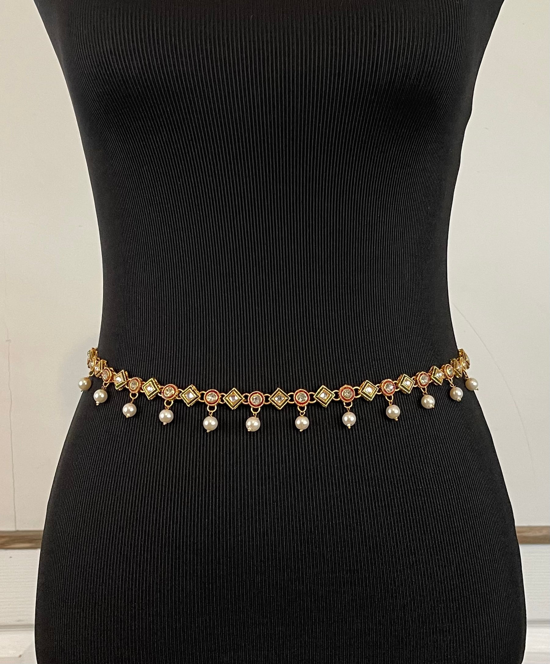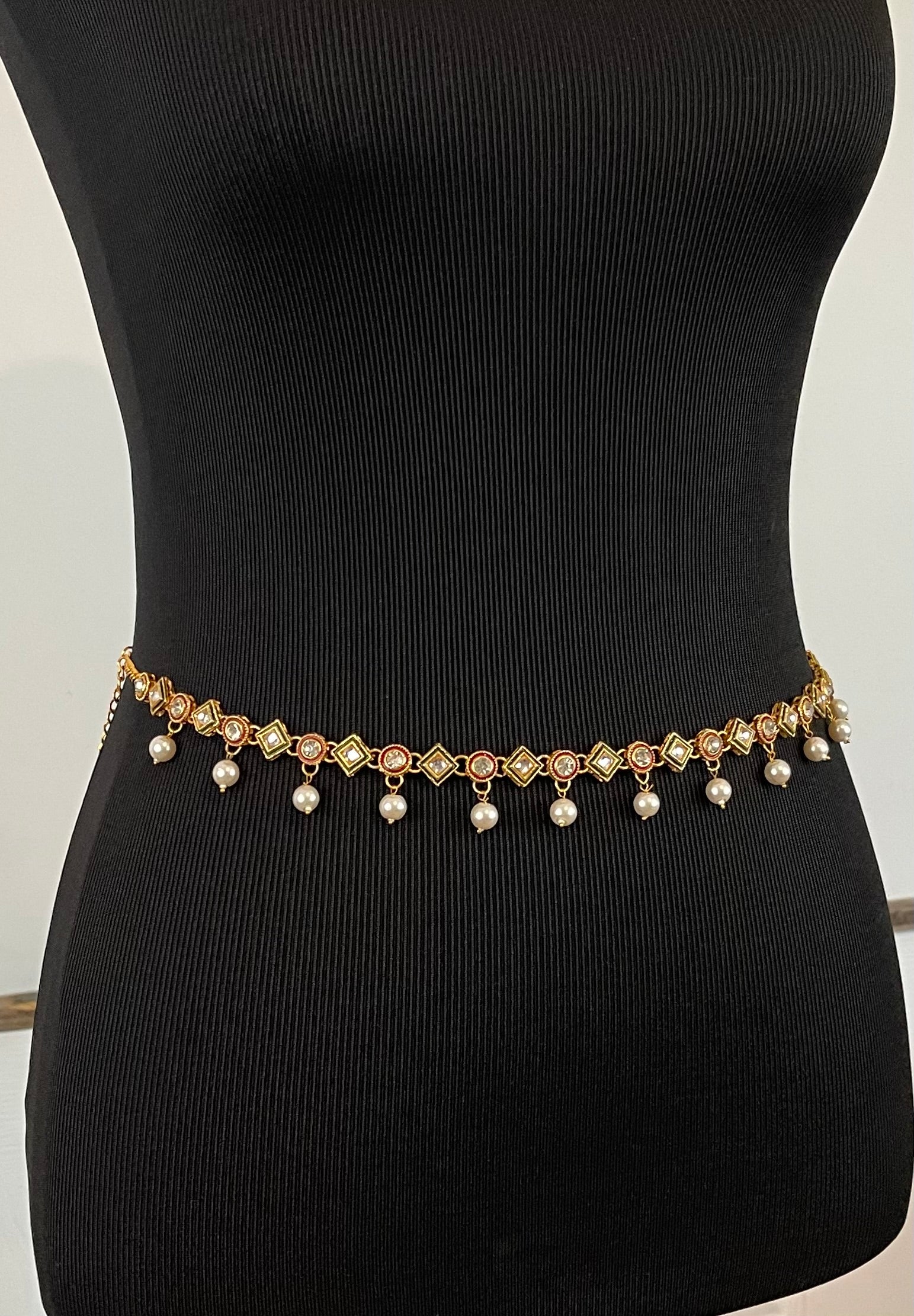 Enamel painted handcrafted slim waist belt with kundans and imitation pearls.