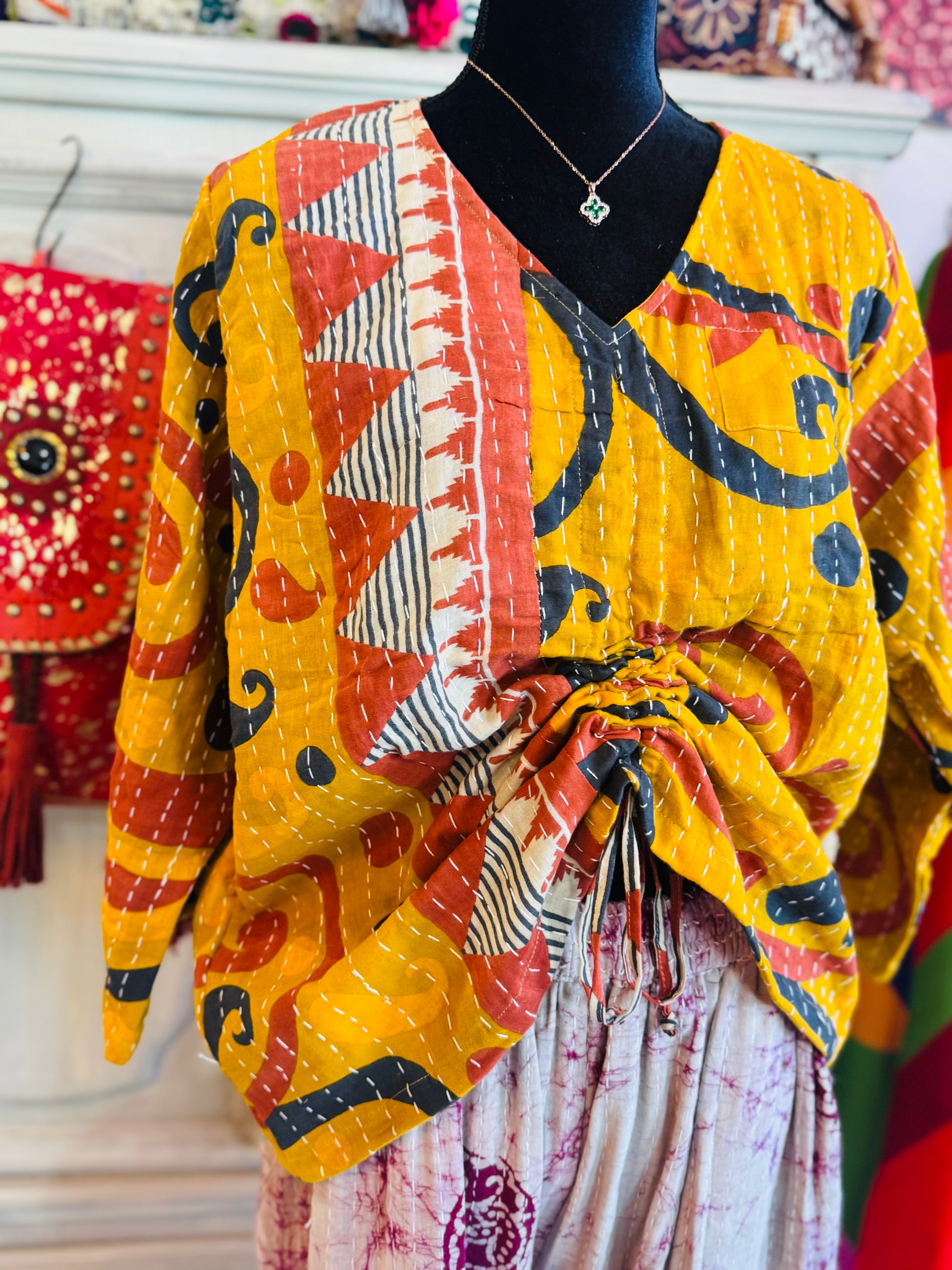 Turn heads with the Ember Glow Butterfly 2-Way Top, a bold and vibrant handmade blouse crafted from soft, 100% cotton saree kantha fabric. Its fiery orange, maroon, and black floral patterns bring warmth and energy to any outfit.