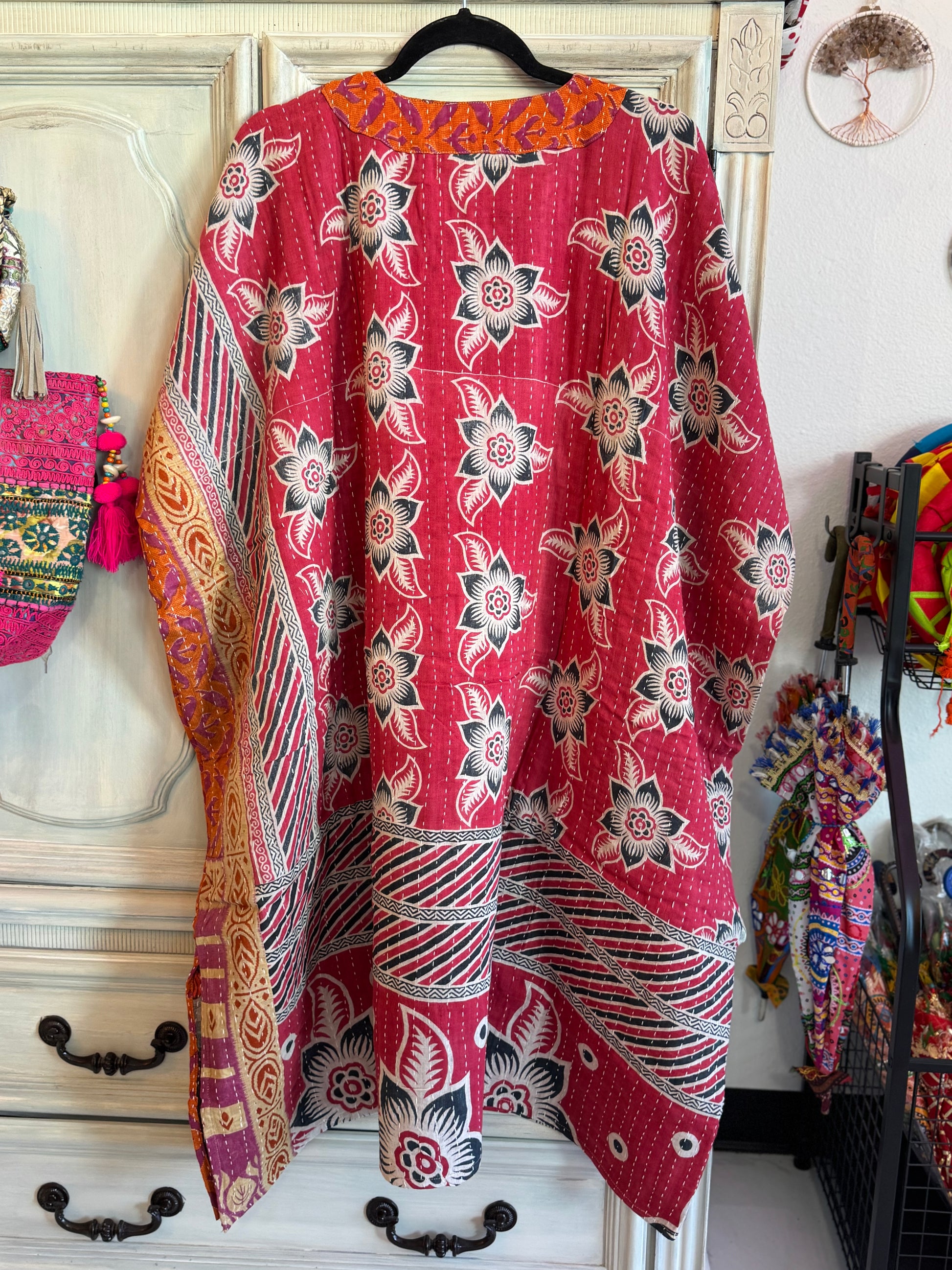 A stunning maroon Kantha dress featuring an all-over floral pattern, handcrafted from 100% cotton saree quilts. Each piece is a wearable work of art, blending traditional stitching with everyday comfort.