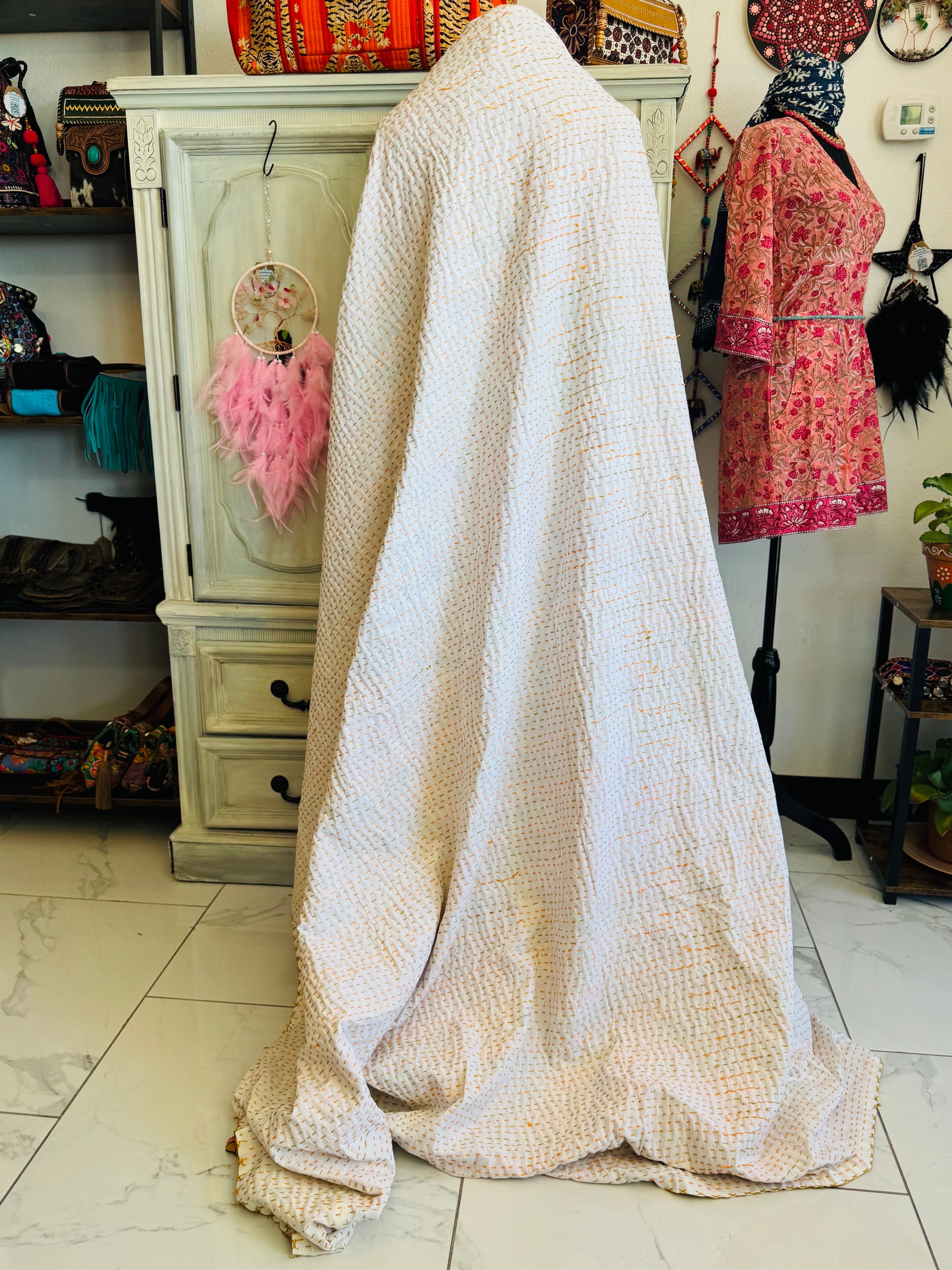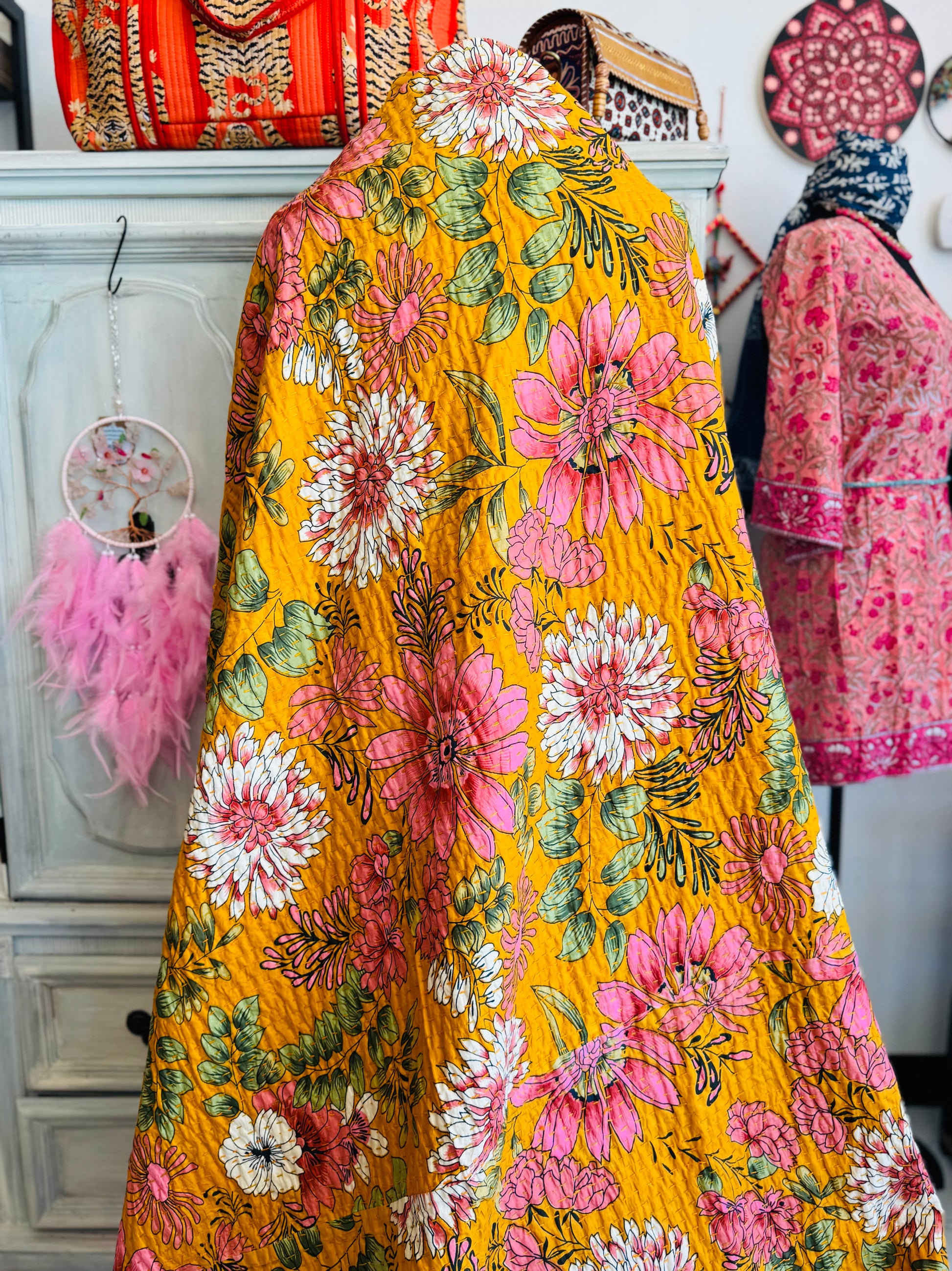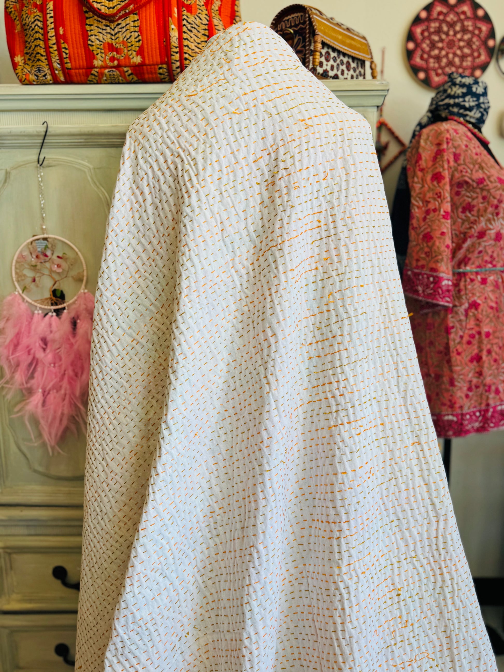 Add warmth and charm with the Golden Flora Kantha Quilt, showcasing golden floral prints on a soft cotton base. Each quilt is handblock printed and hand-sewn with thousands of Kantha stitches, making it a lightweight, breathable, and reversible piece that brings traditional elegance to any bedroom.
