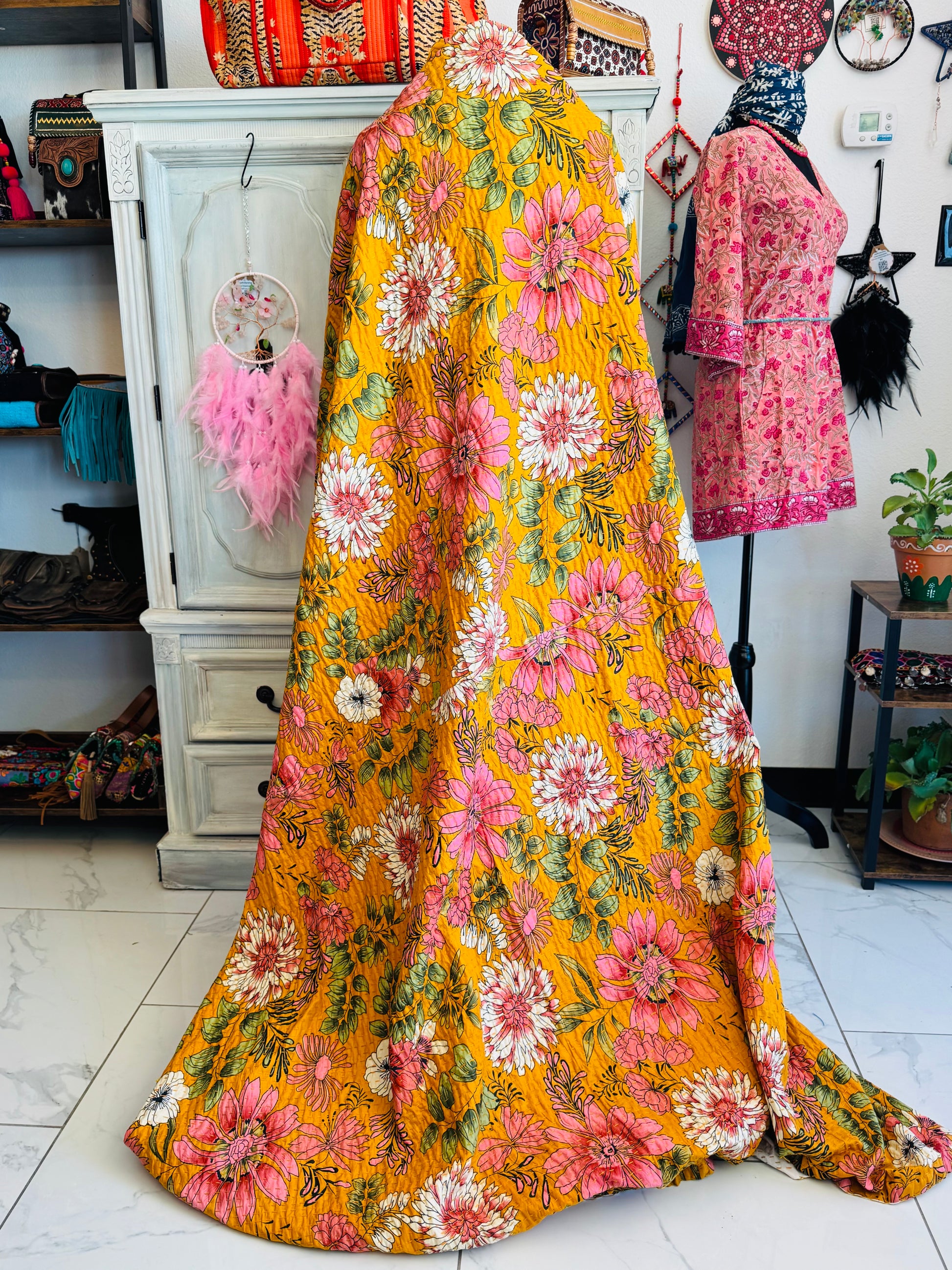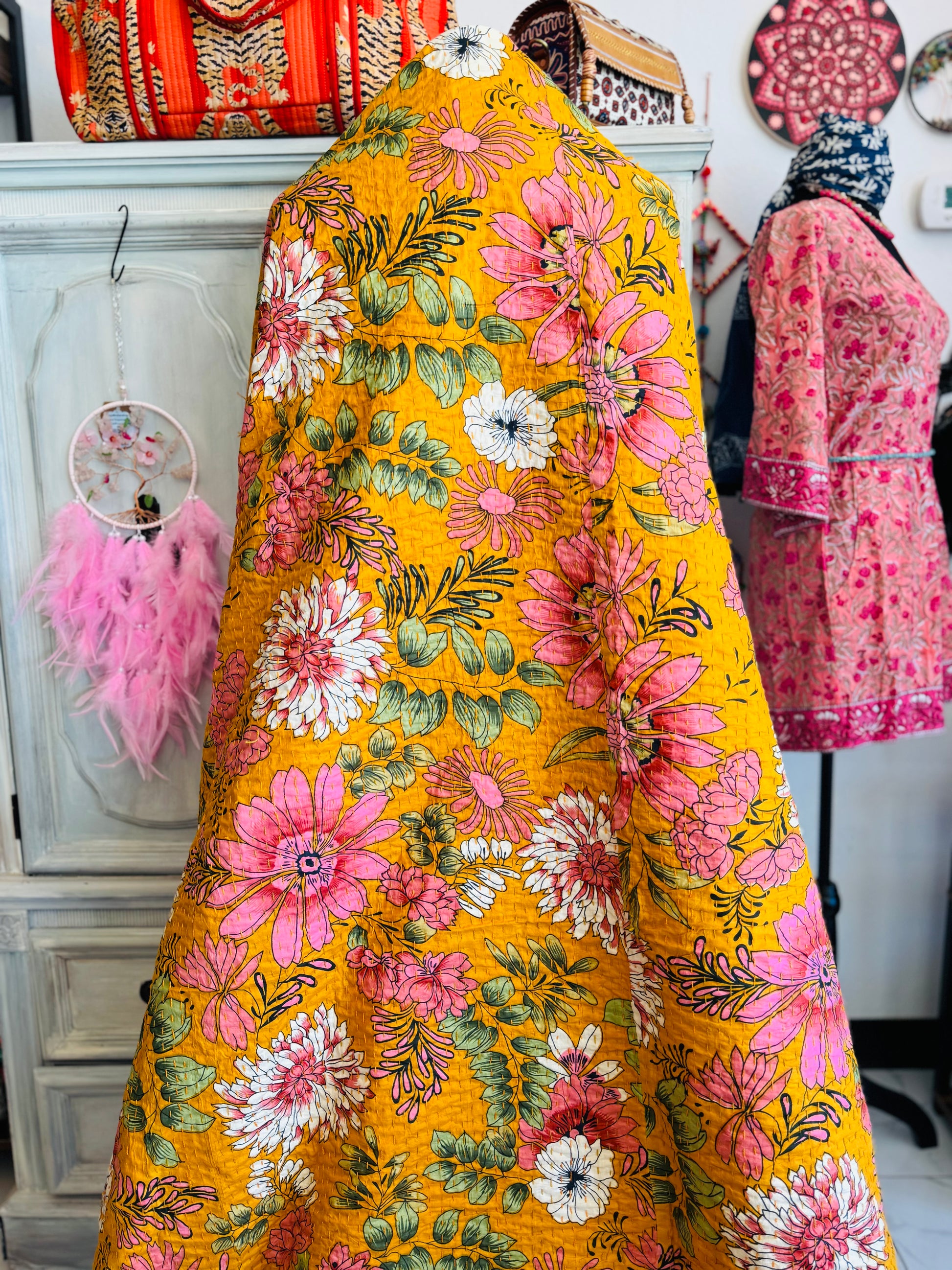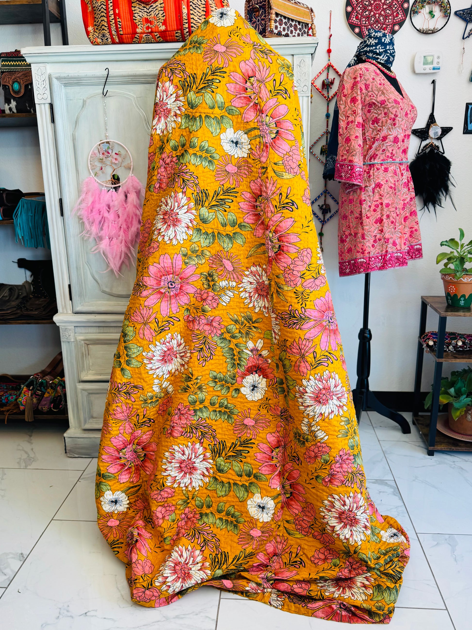 Golden Flora – Handblock Printed Kantha Quilt | Cotton | Handmade | Full Size
