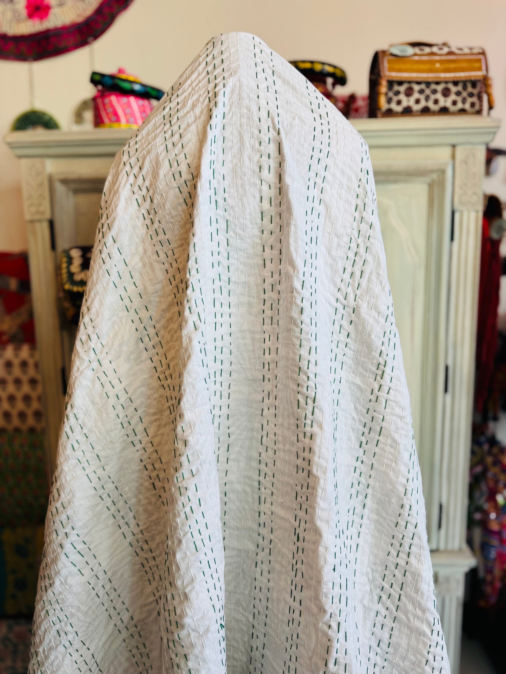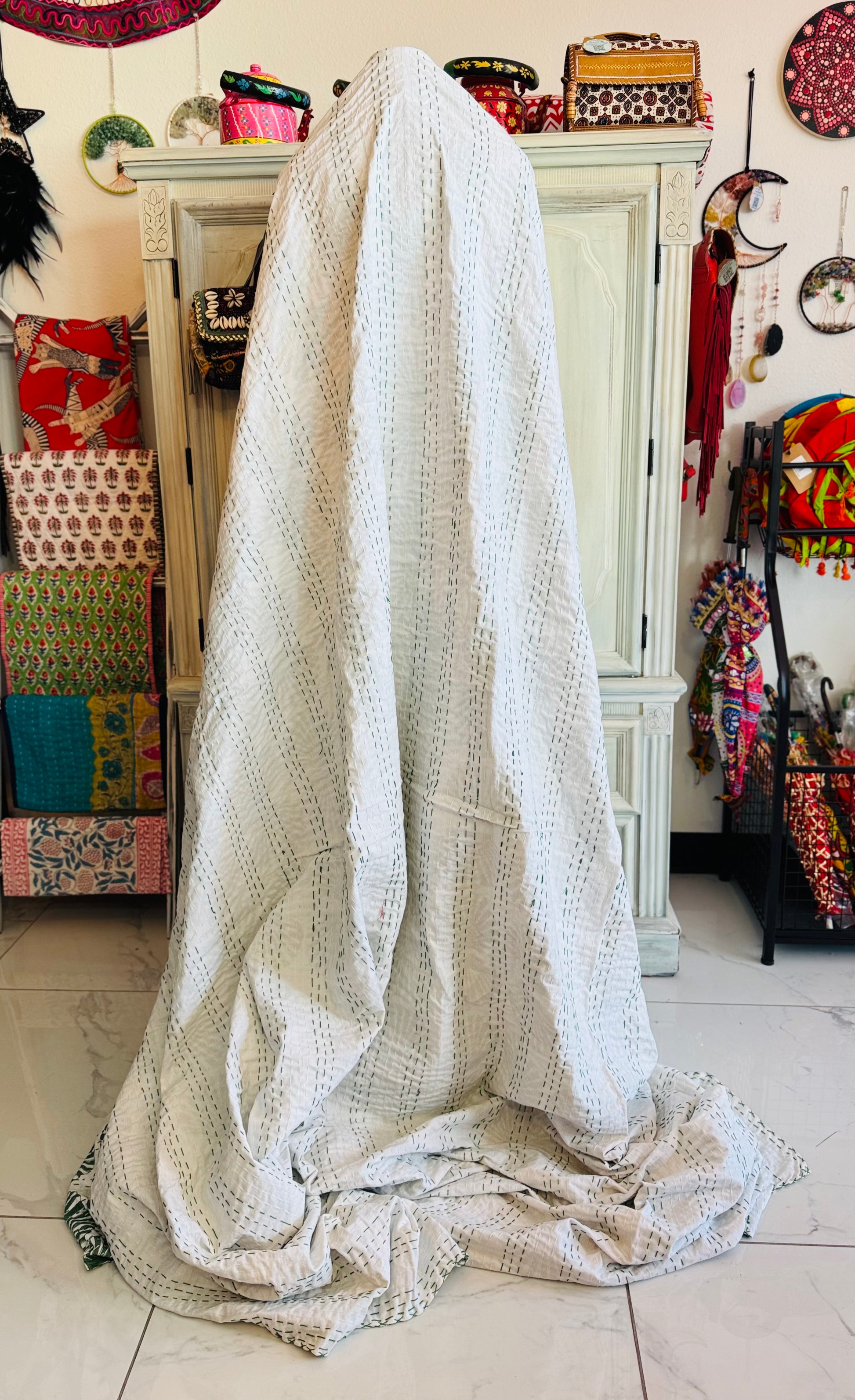 This Kantha quilt is 100% cotton, stitched with thousands of running Kantha lines, and crafted without any stuffing or batting, making it lightweight, breathable, and easy to layer. Whether you’re adding calm to your bedroom, dressing up a guest room, or looking for a soft cover for your sofa or daybed, Green Tide brings nature’s quiet beauty into your space.