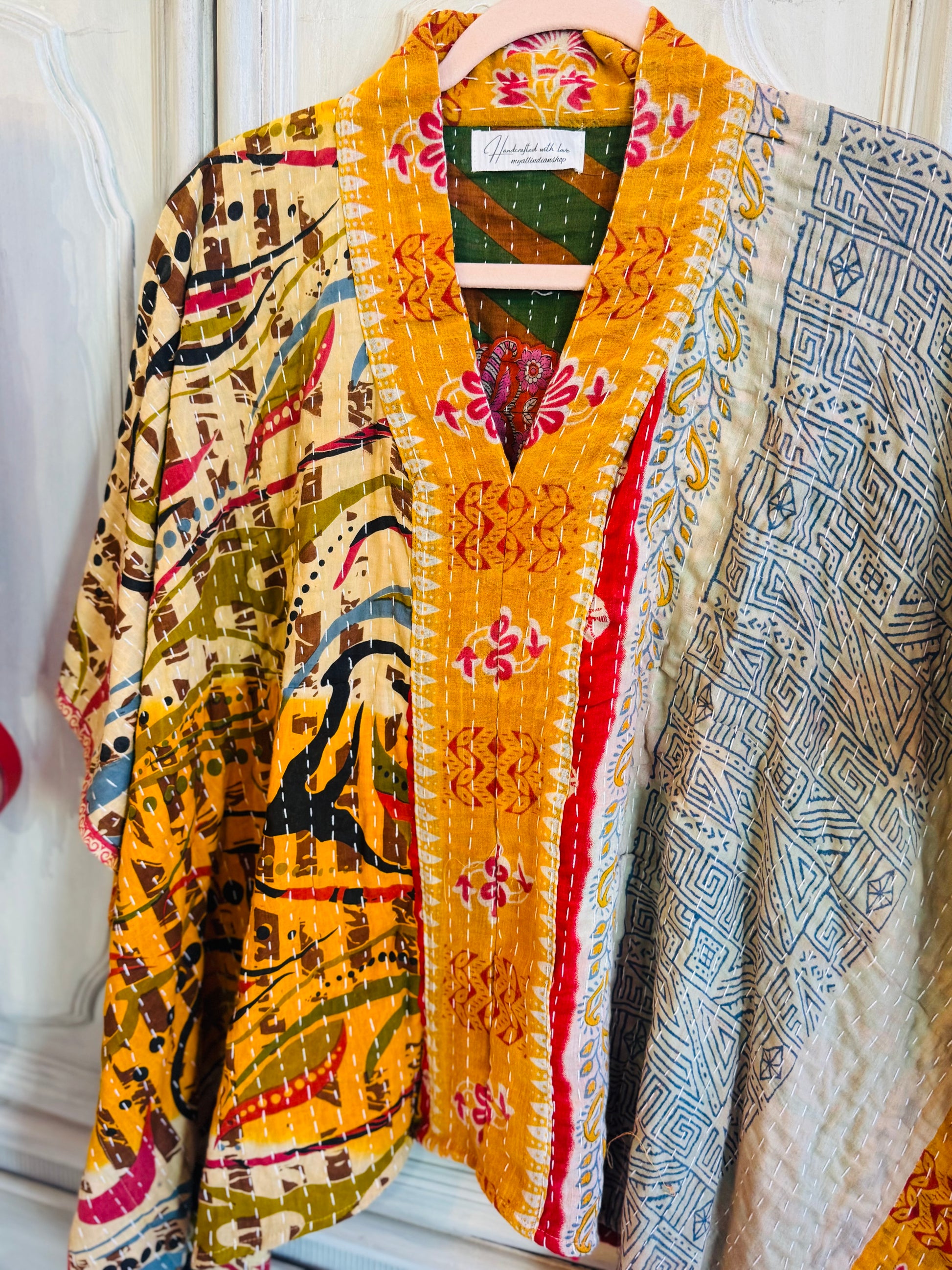 Inspired by the golden tones of the desert, Desert Muse tells a story of earthy calm and bold contrast. Crafted from repurposed Kantha quilts, it blends amber, tan, and soft maroon in a design that celebrates art, sustainability, and individuality.