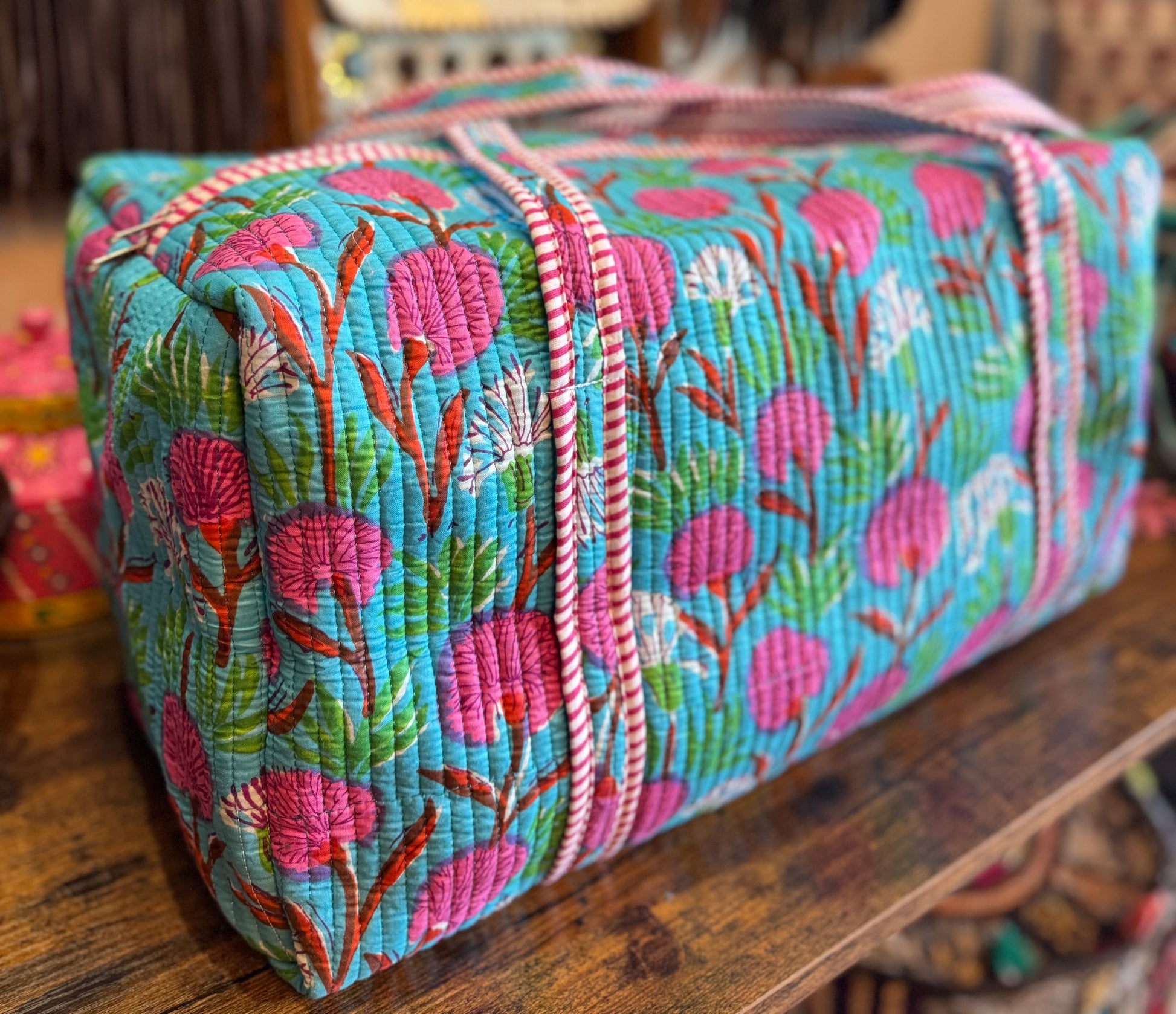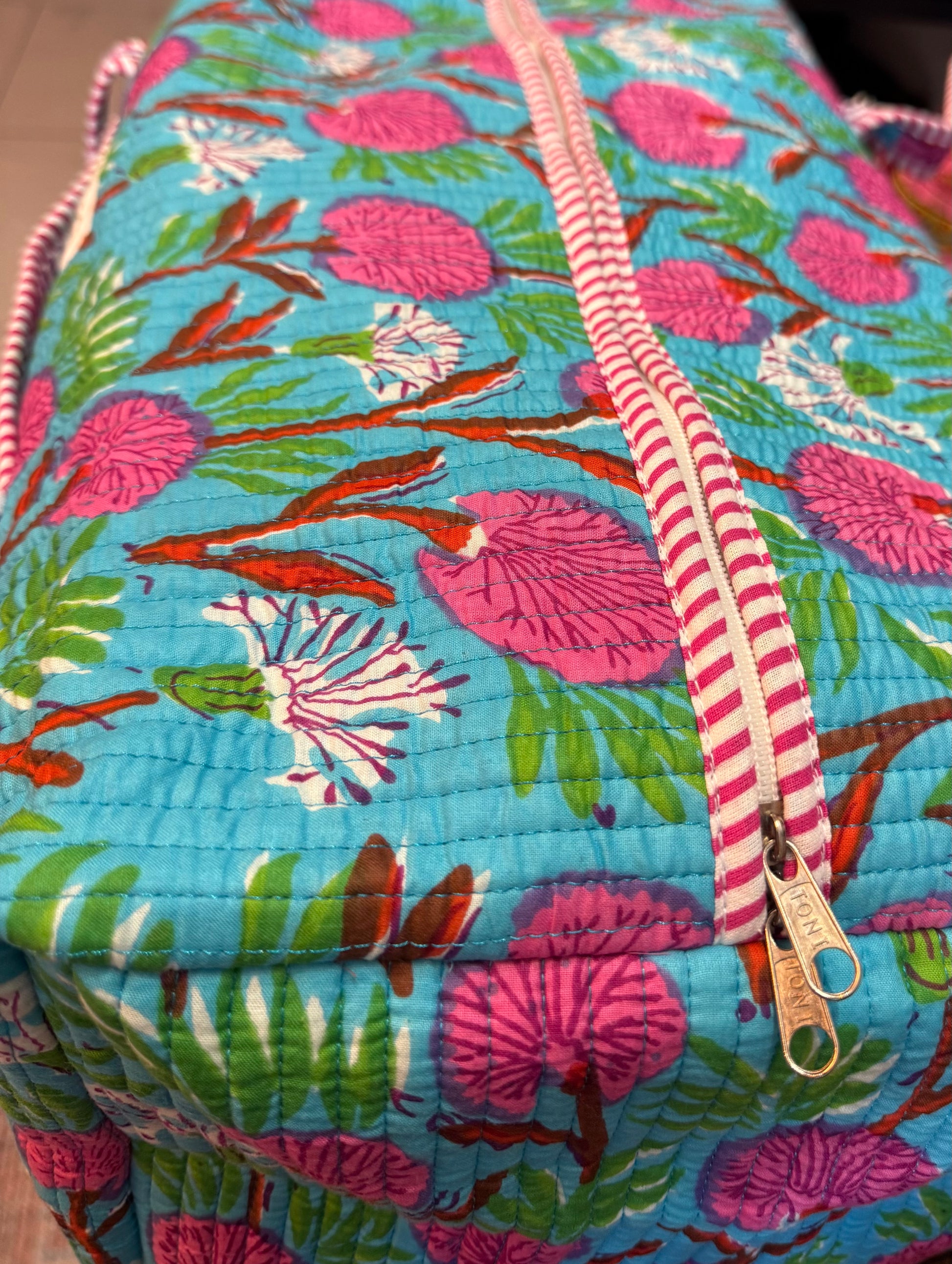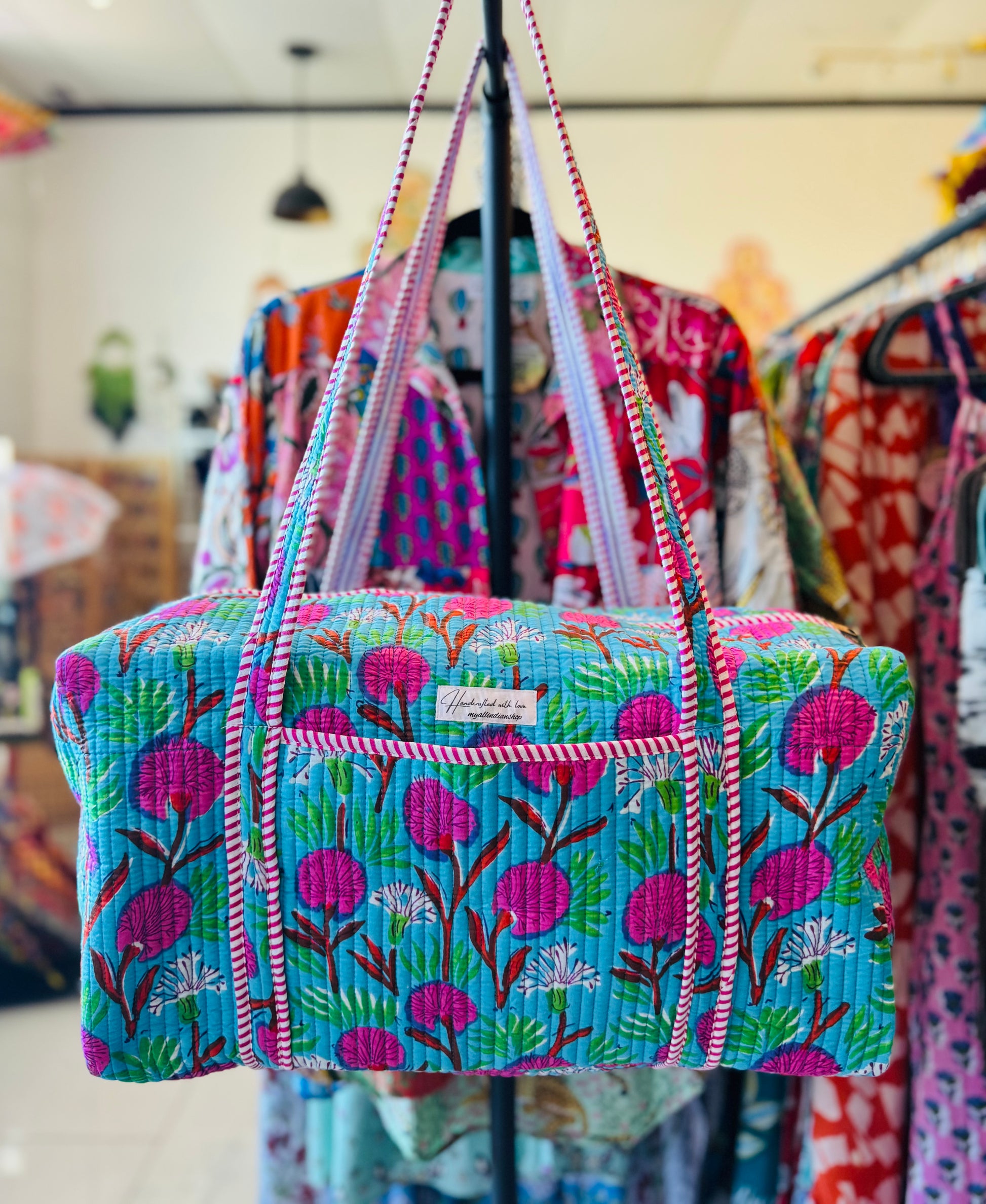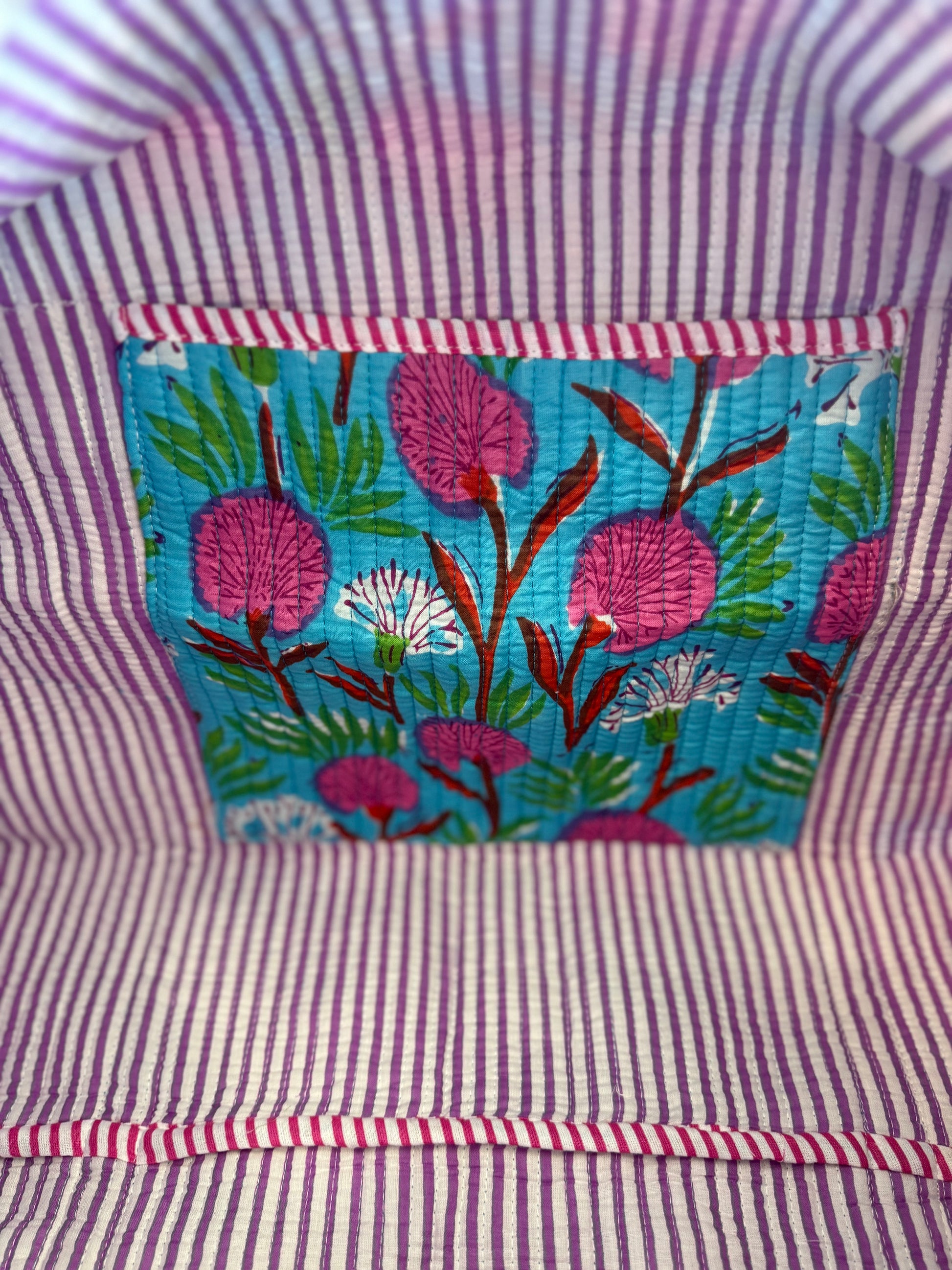 Bring joy to your travels with this bright and bold blue floral quilted weekender bag. Handmade with layered cotton and detailed kantha stitching, it’s roomy, lightweight, and built to last. With its playful floral design, it’s the perfect mix of function and fashion for any adventure.