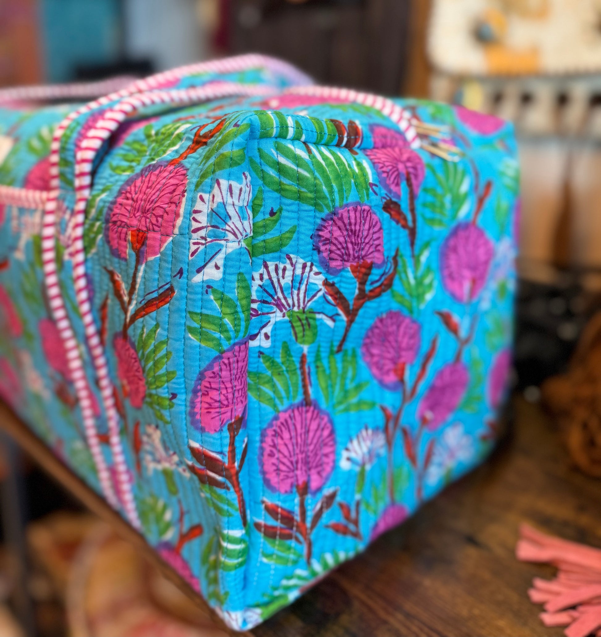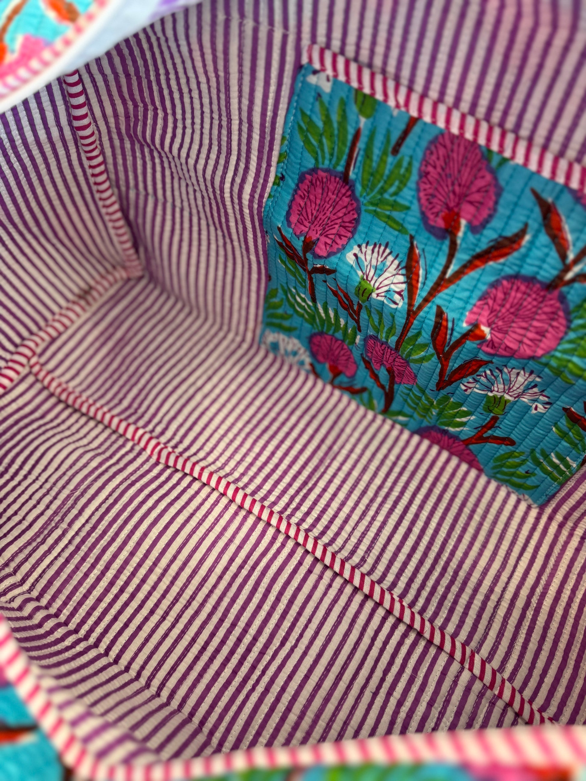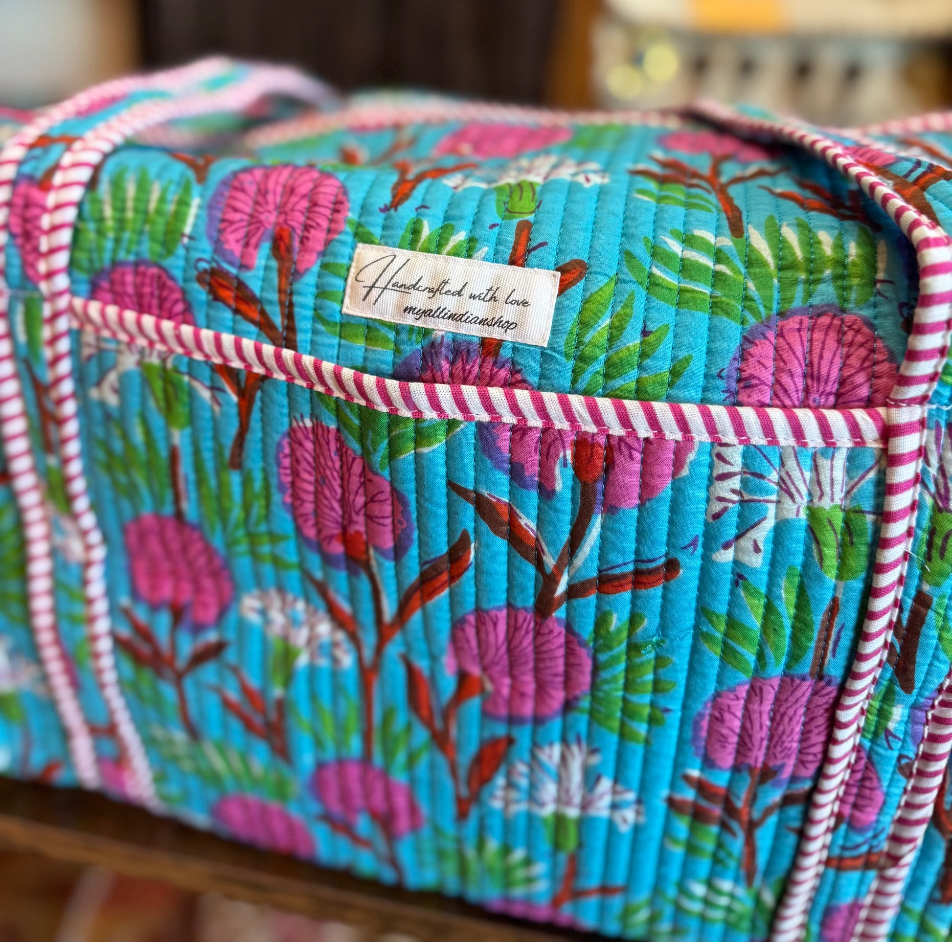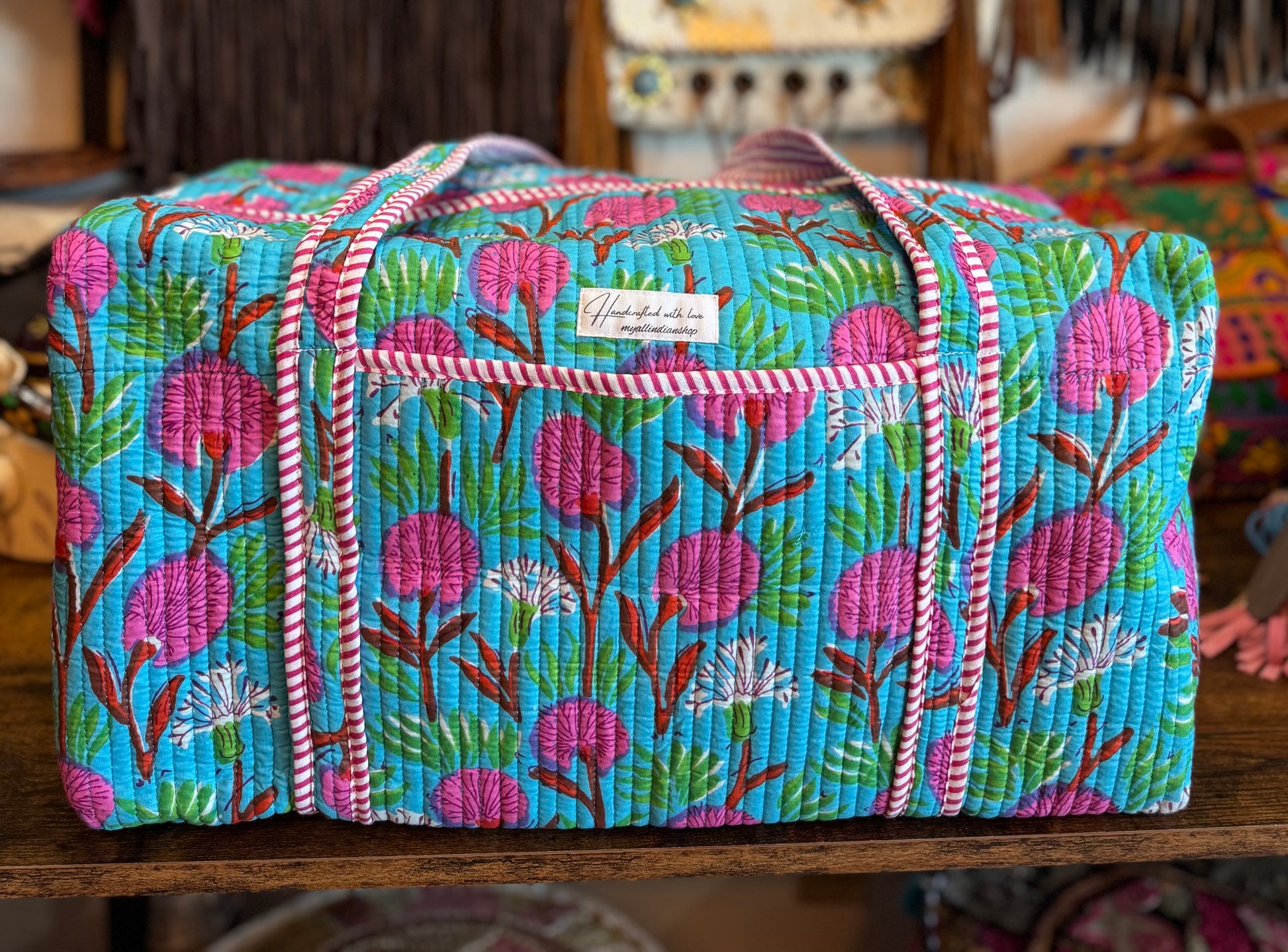 Bring joy to your travels with this bright and bold blue floral quilted weekender bag. Handmade with layered cotton and detailed kantha stitching, it’s roomy, lightweight, and built to last. With its playful floral design, it’s the perfect mix of function and fashion for any adventure.
