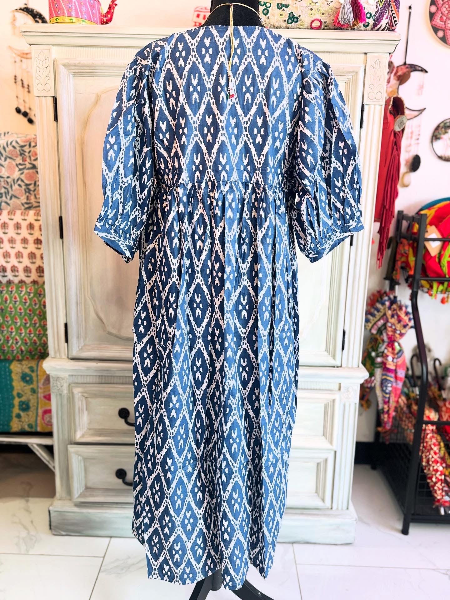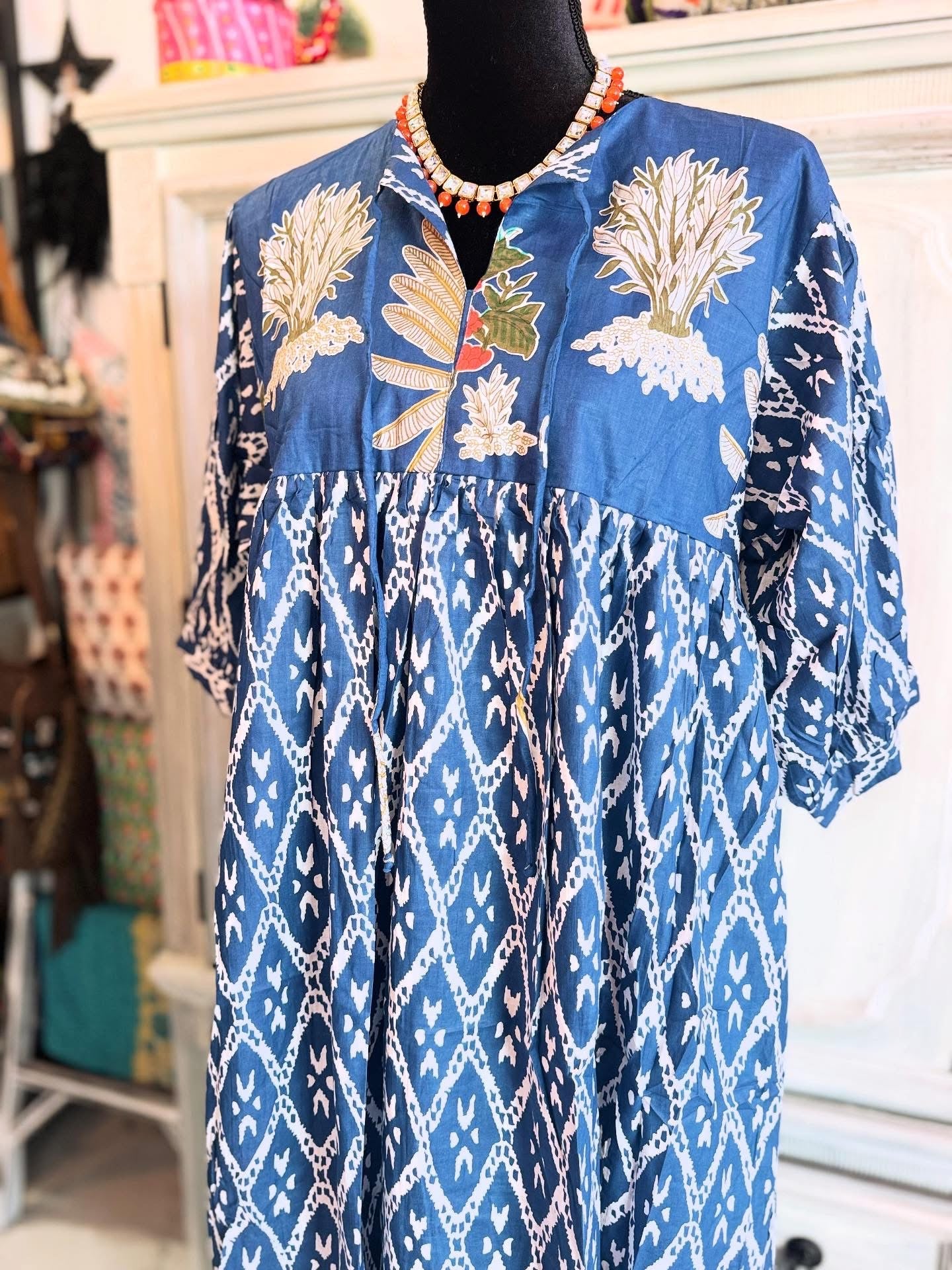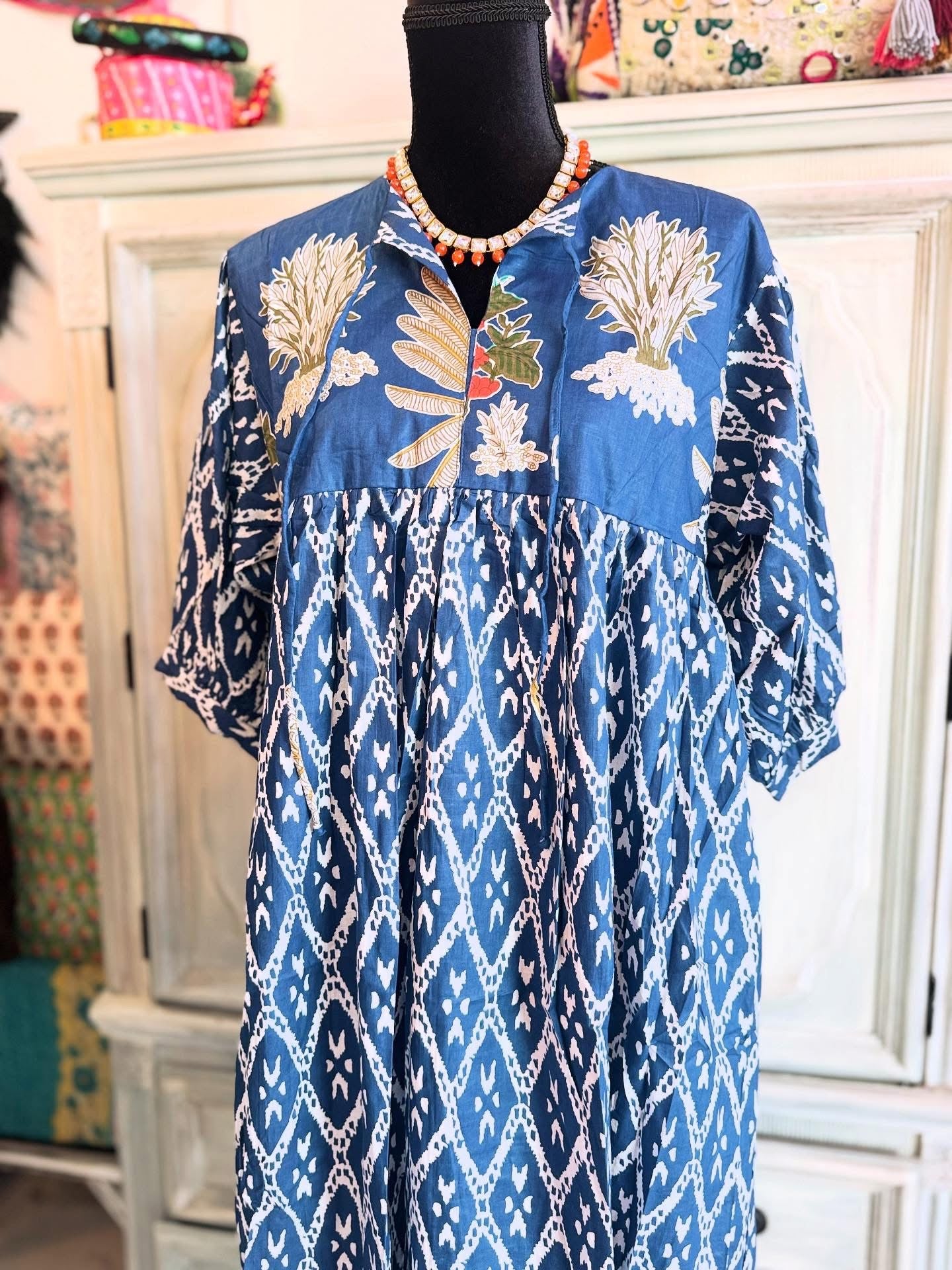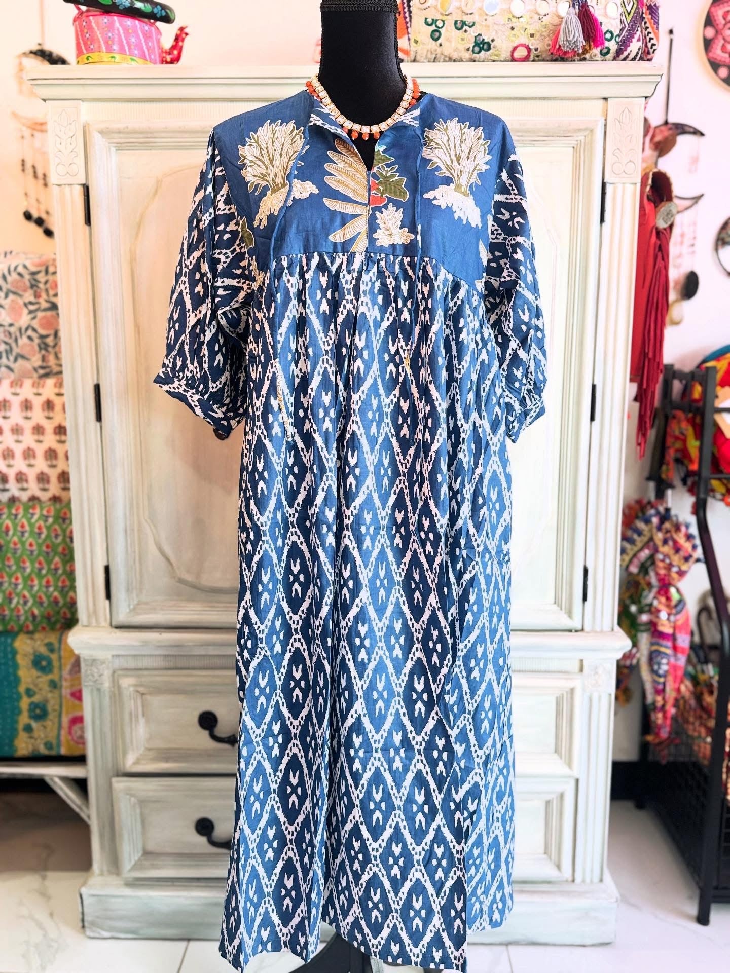 Traditional ikat meets nature-inspired embroidery in Indigo Grove, a soft cotton dress that’s made for movement and style. Featuring an all-over indigo ikat body and a beautifully block-printed floral yoke, this dress is easy to wear, yet impossible to forget.