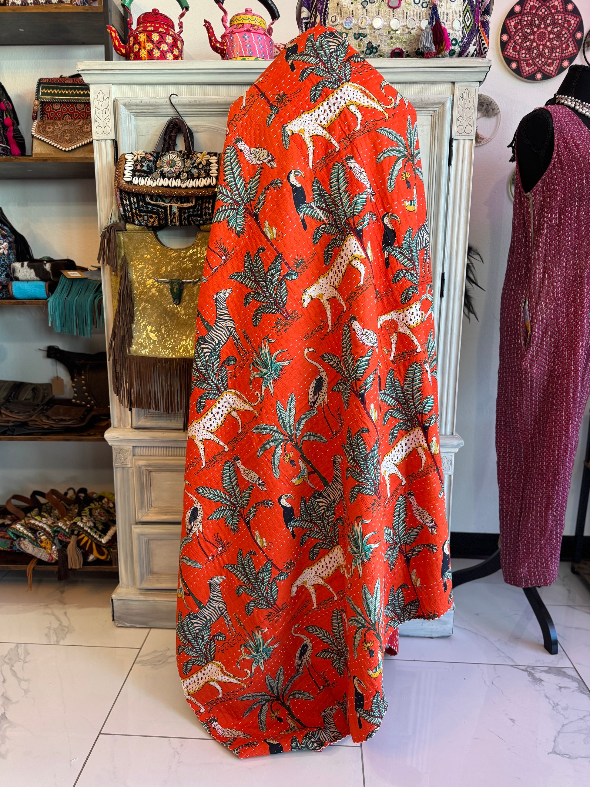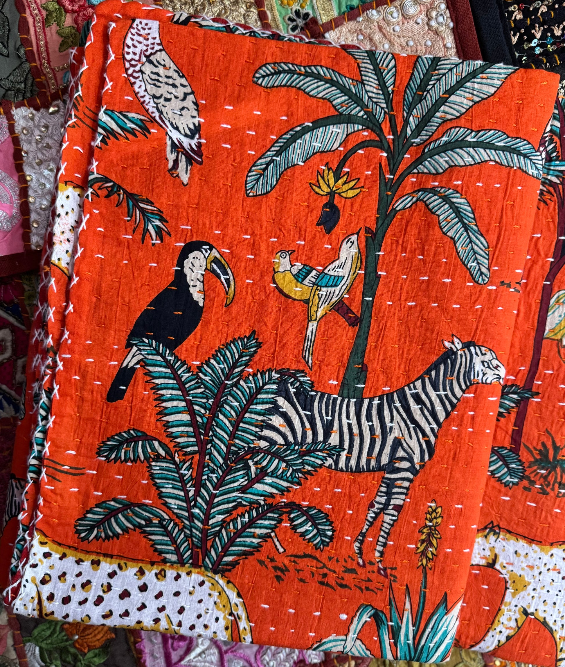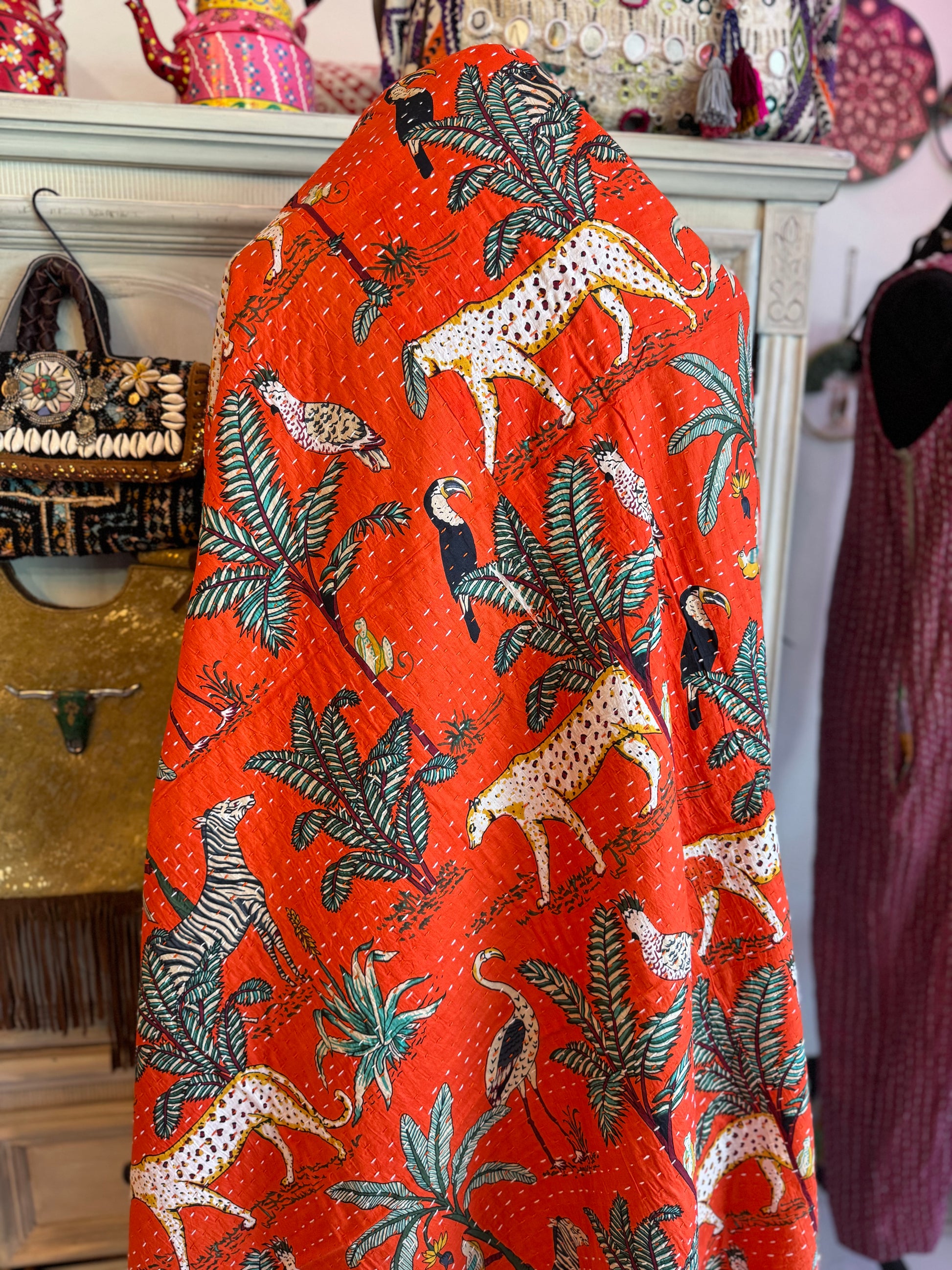 Jungle Print- Orange- Handblock Printed Kantha Quilt | Cotton | Handmade