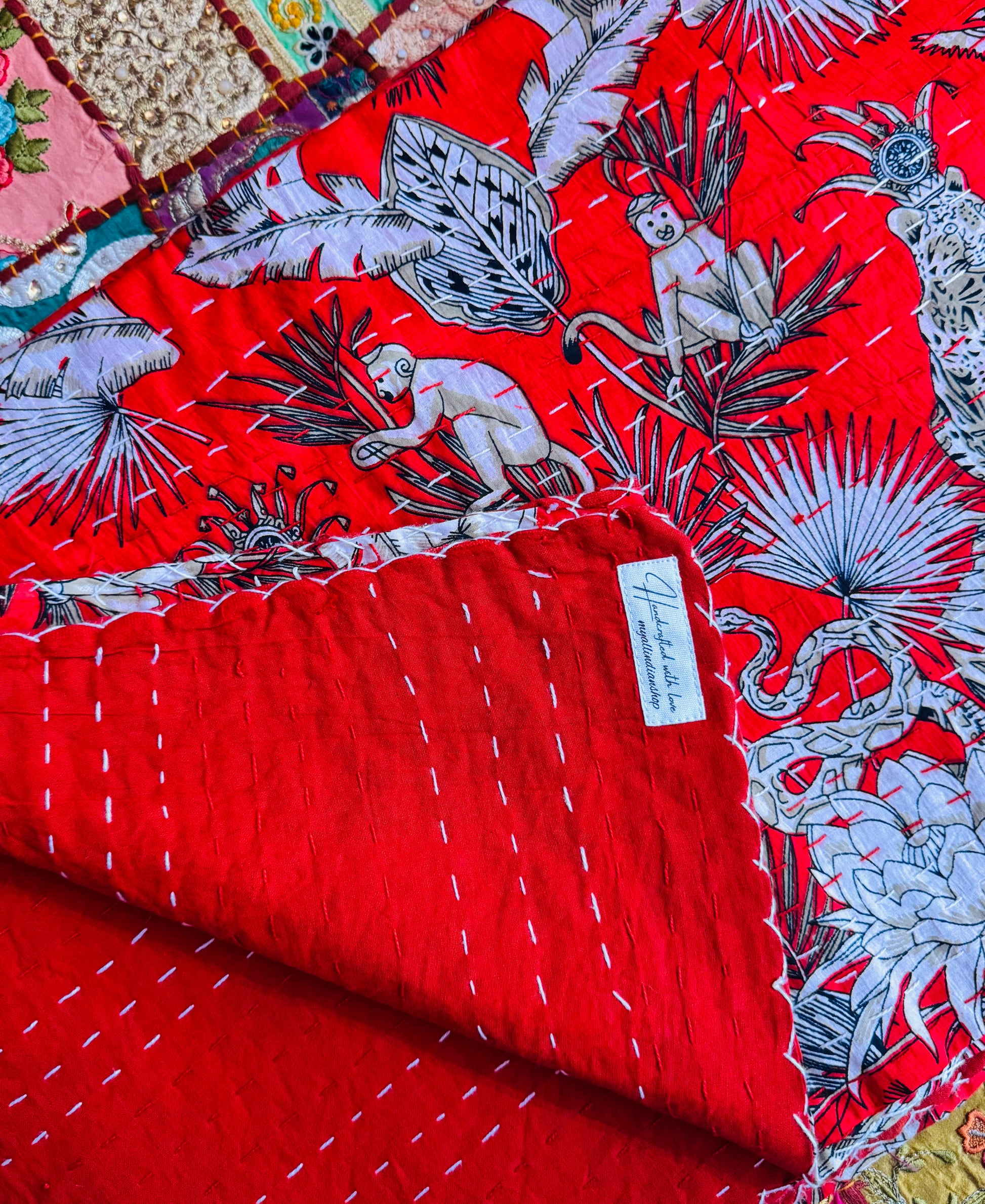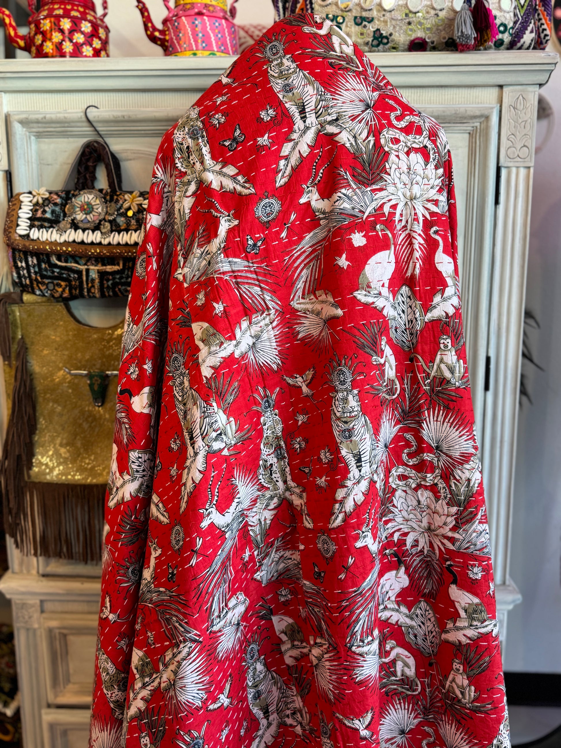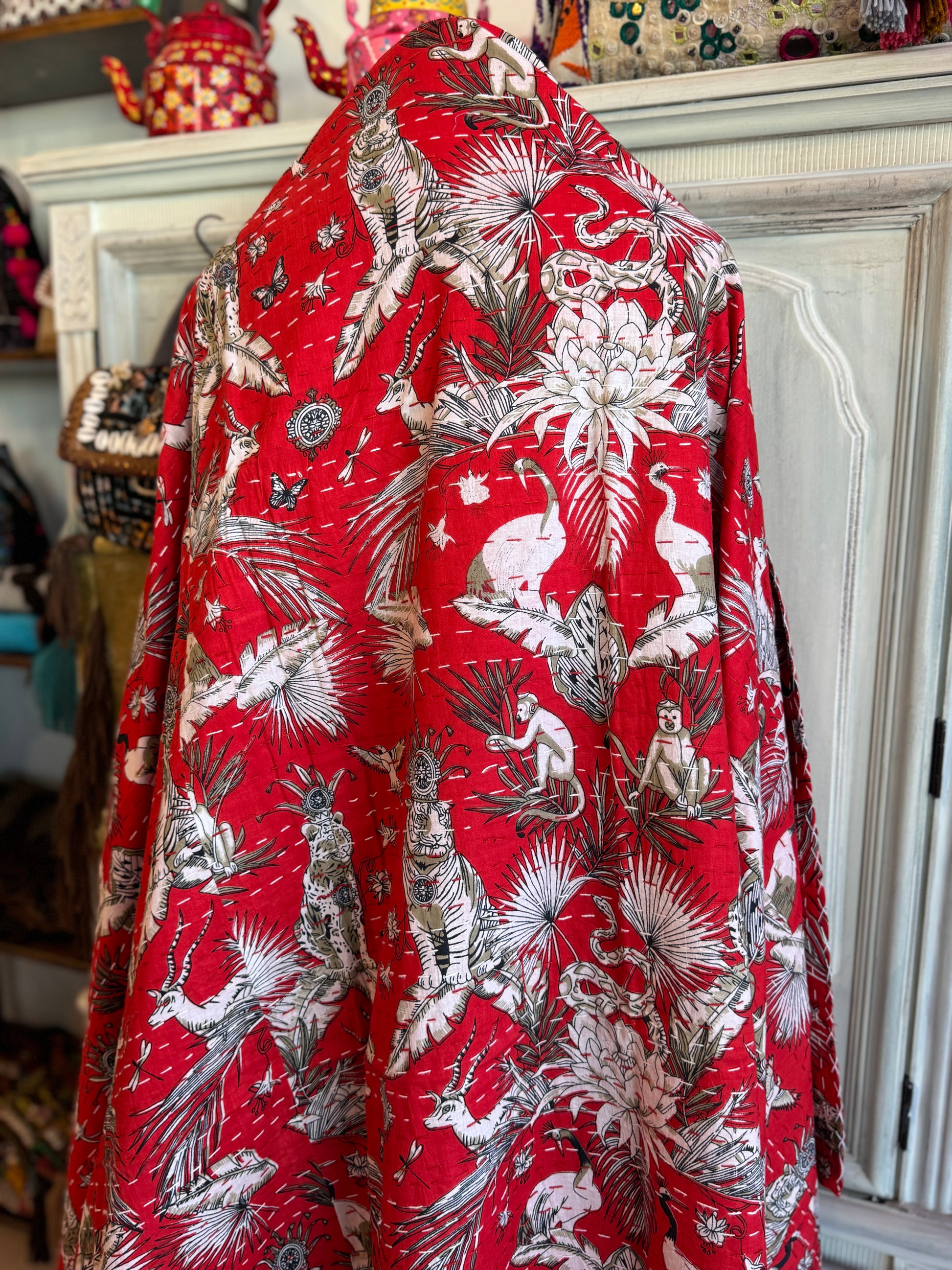 Jungle Print- Red- Handblock Printed Kantha Quilt | Cotton | Handmade