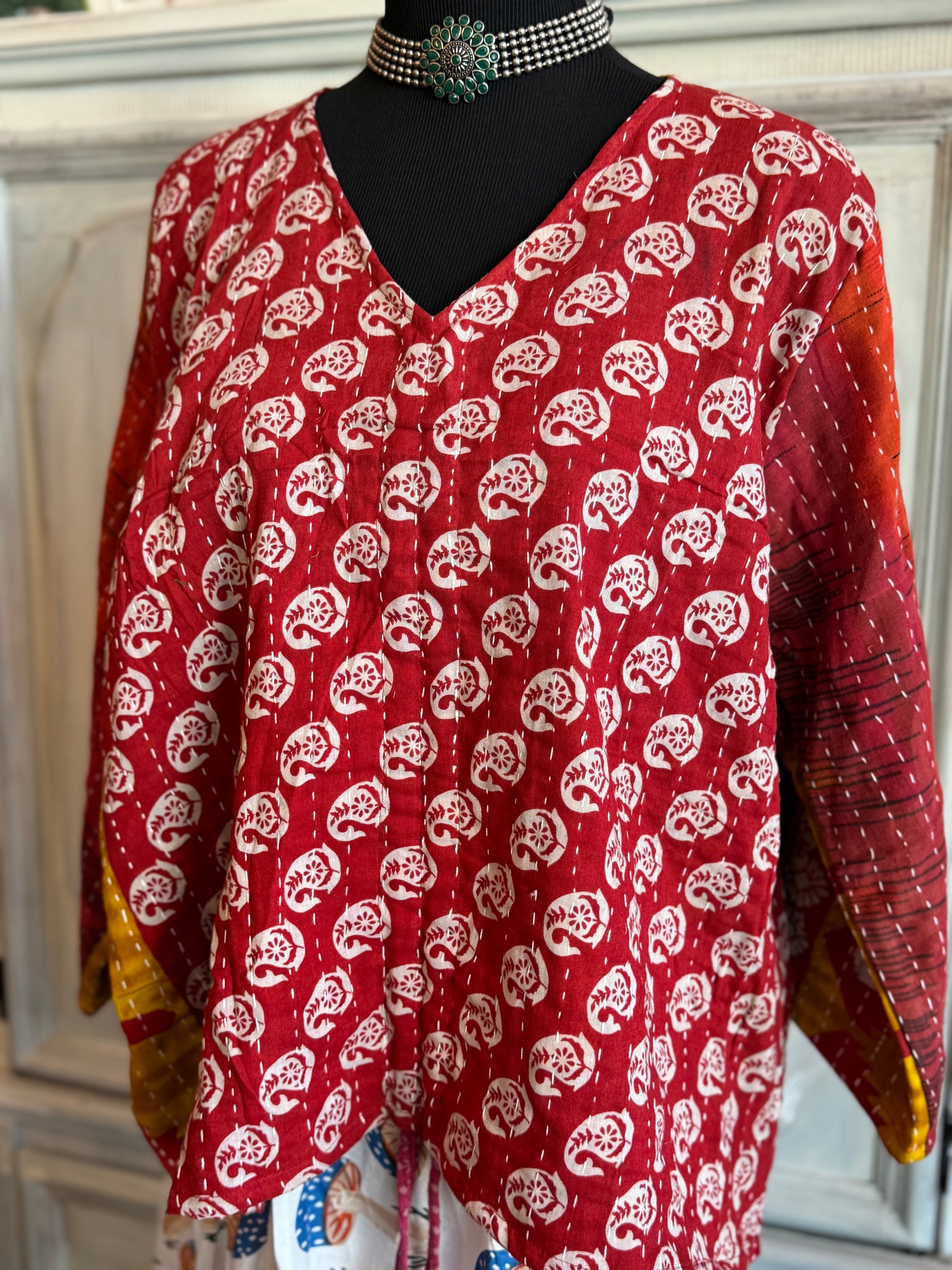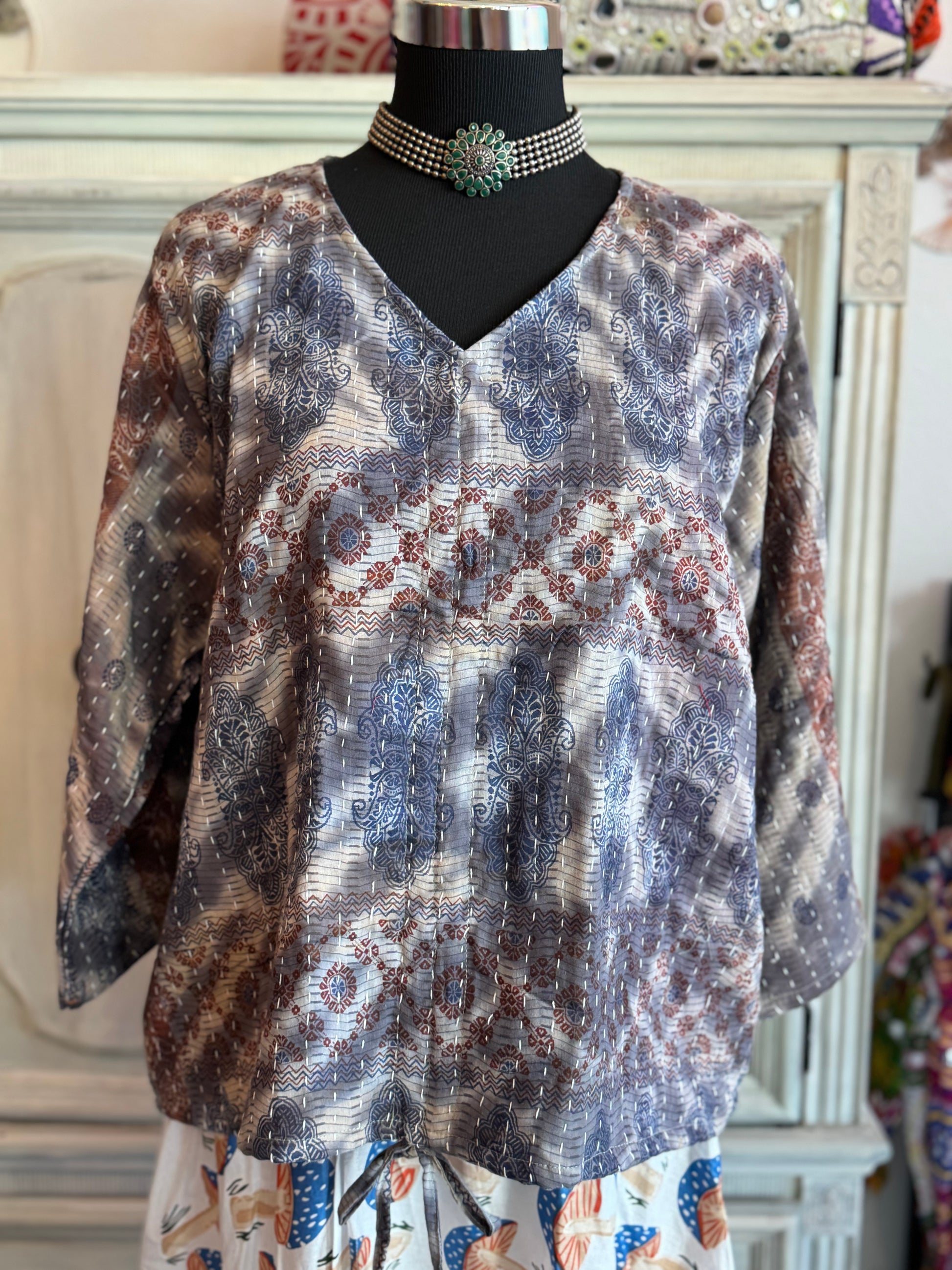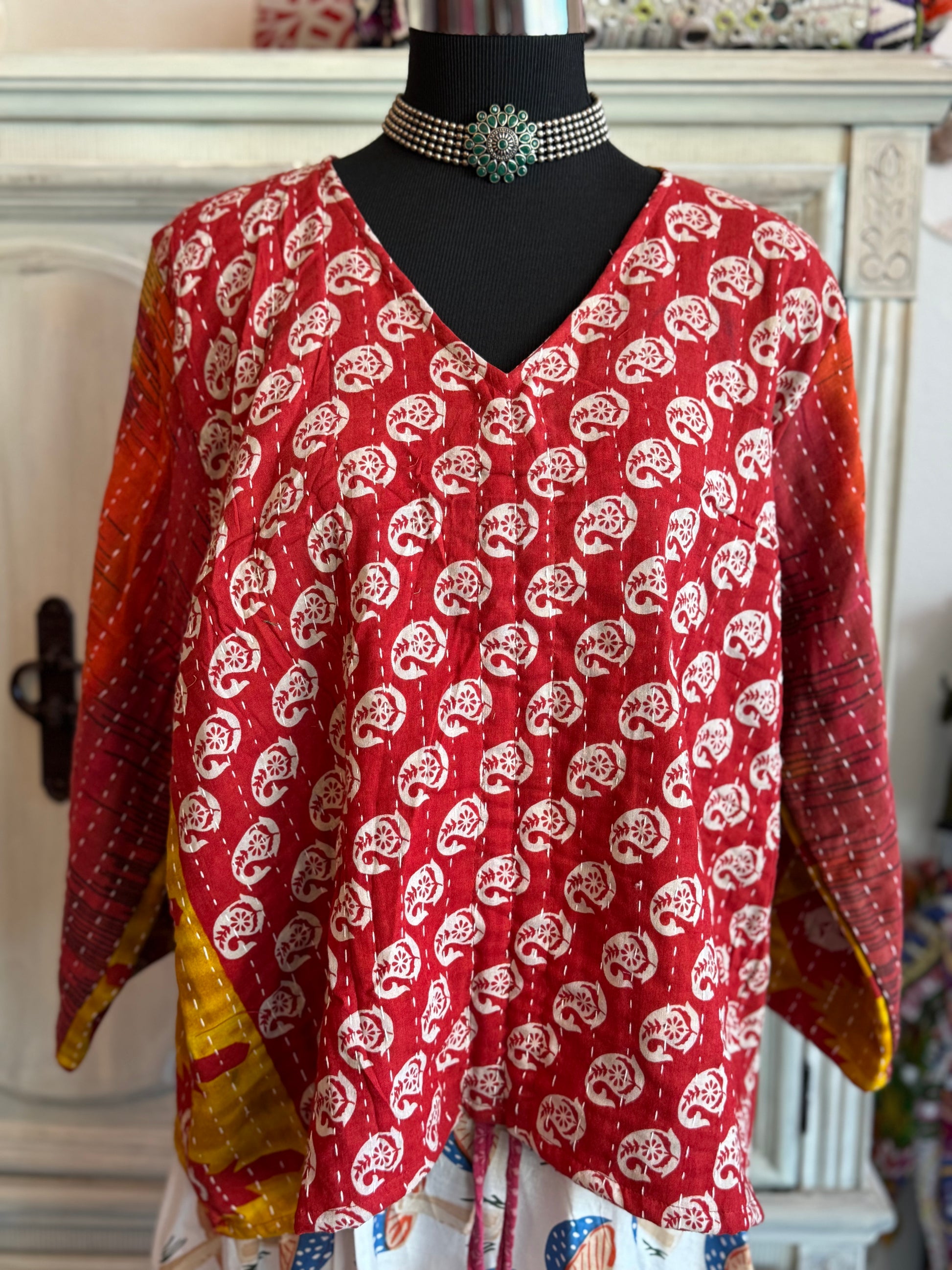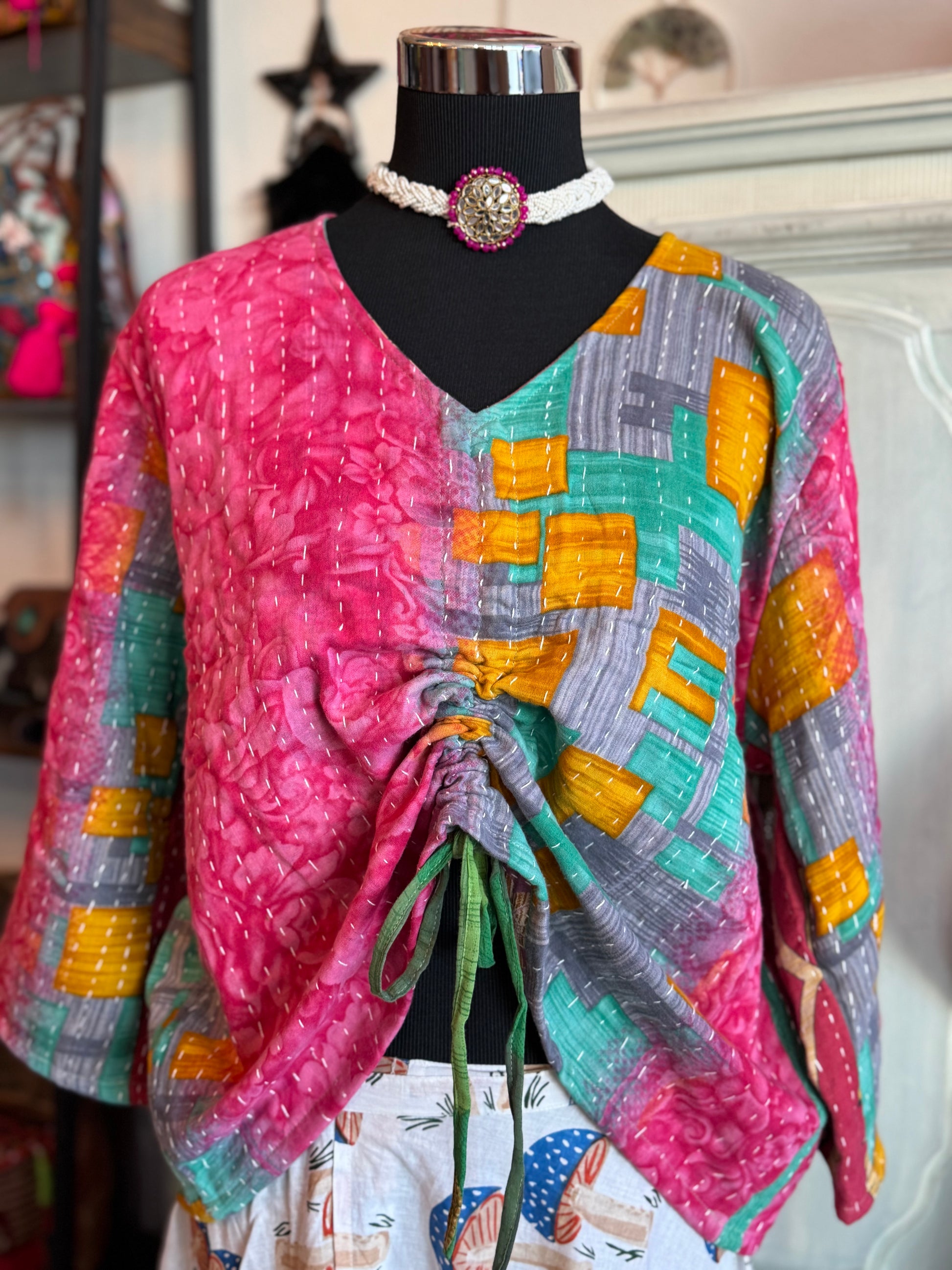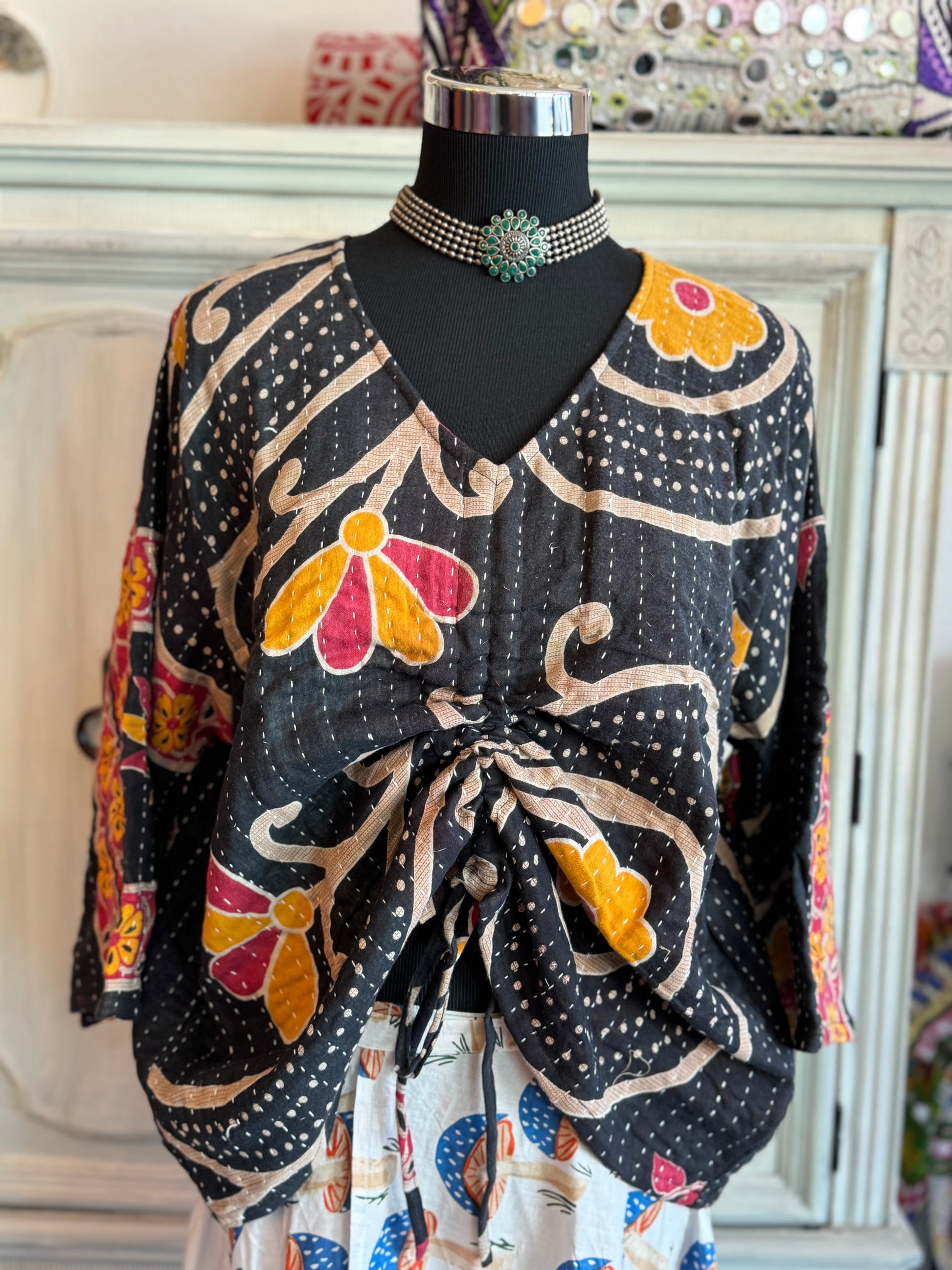 Made from soft, 100% cotton saree kantha fabric, this handmade top is as fun as it is functional. Pull the string at the center to transform it into a flattering butterfly shape — or wear it loose for a relaxed, flowy fit.