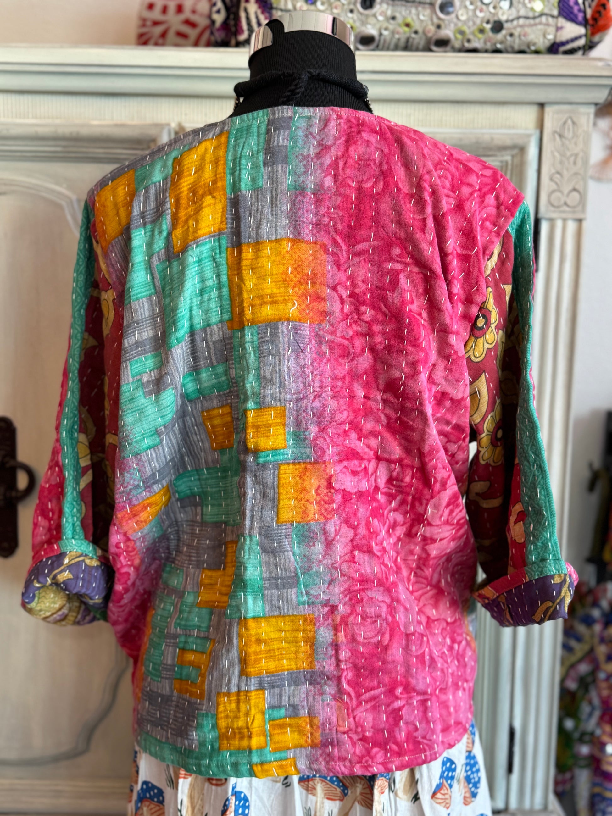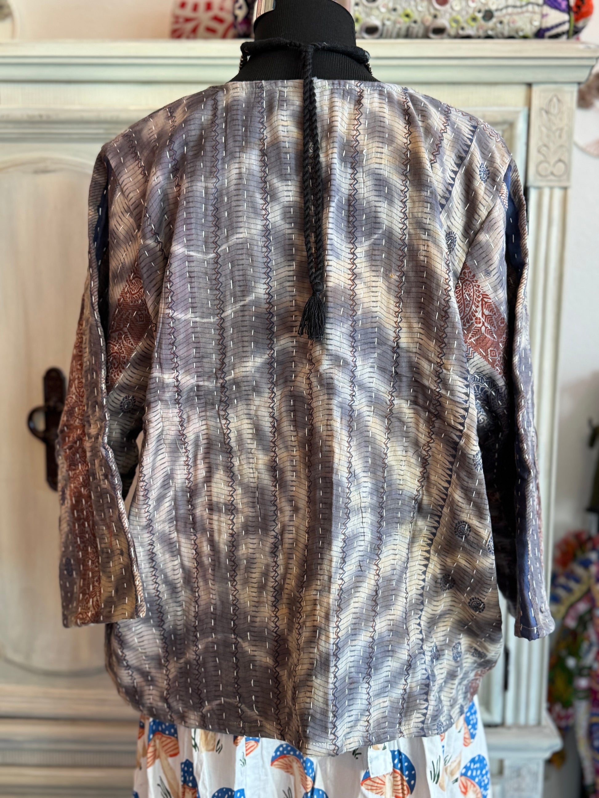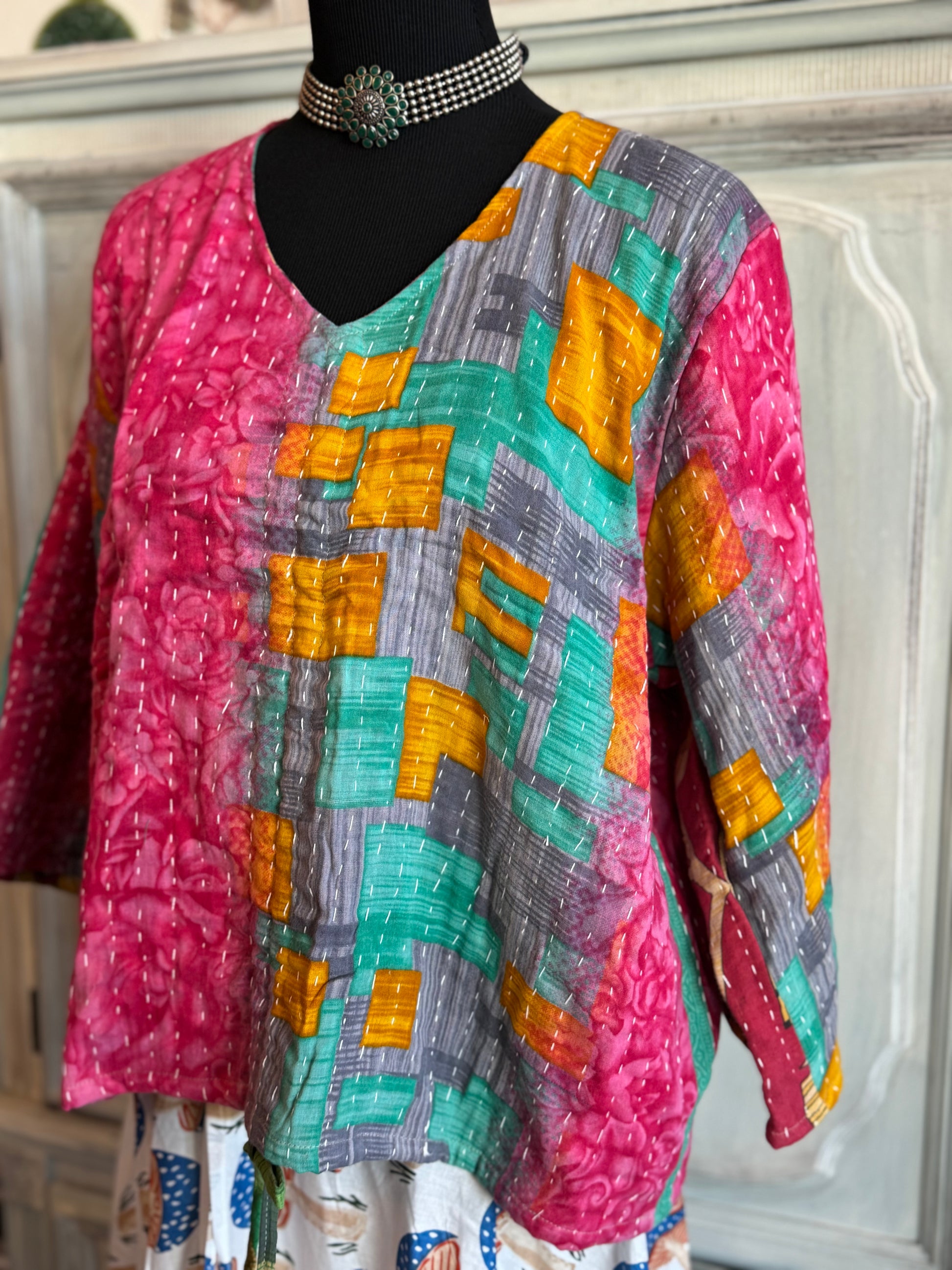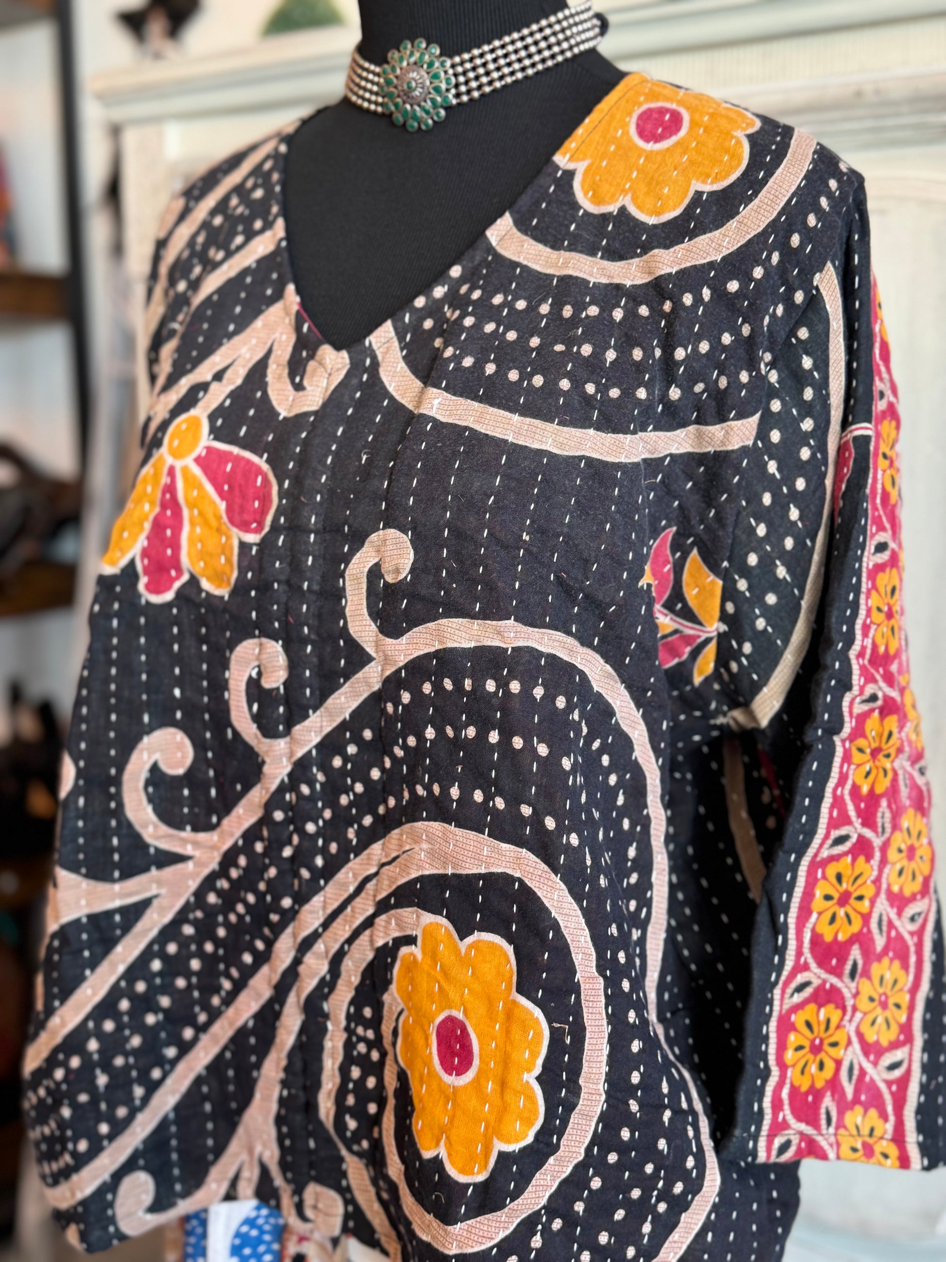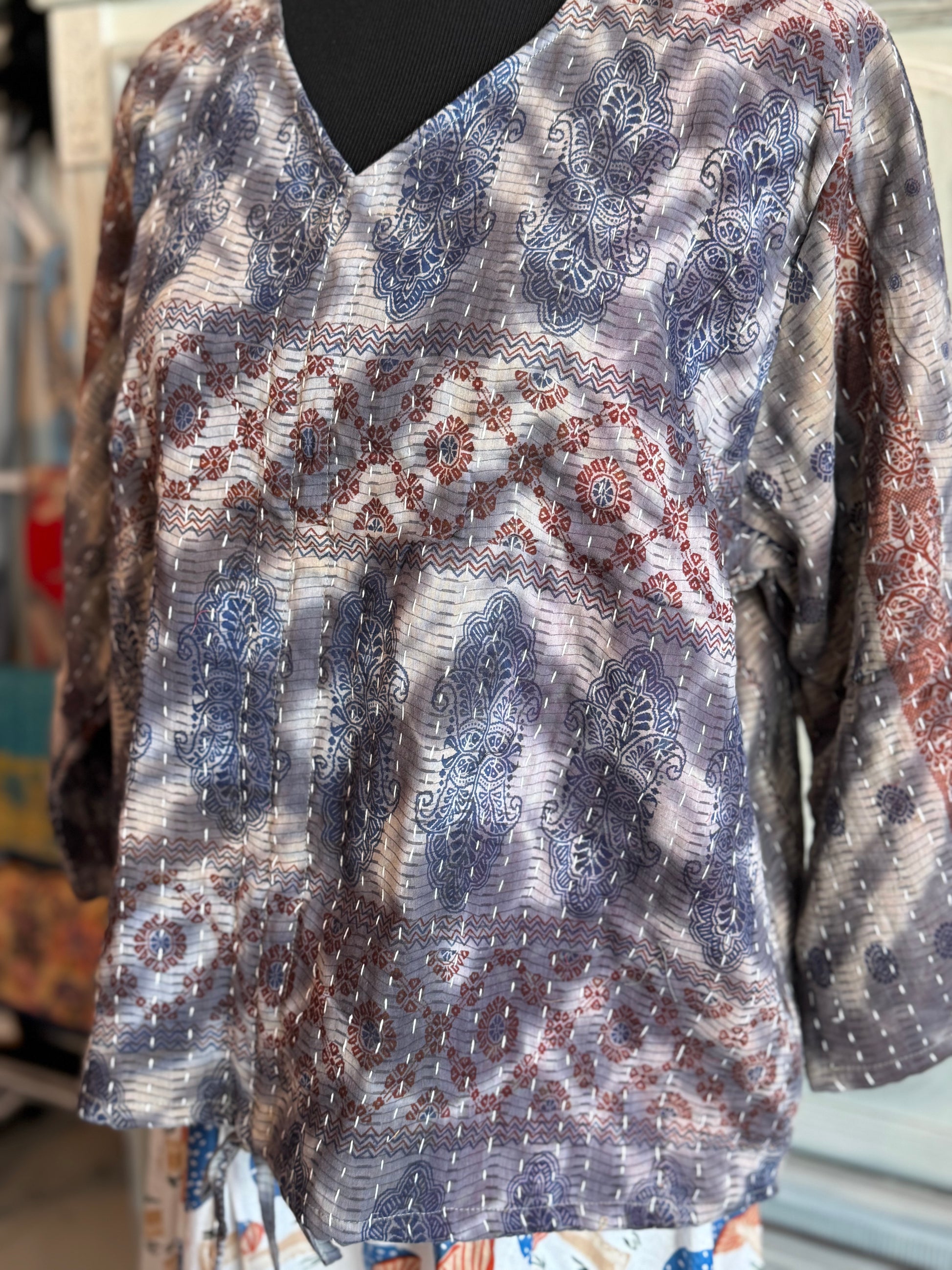 Made from soft, 100% cotton saree kantha fabric, this handmade top is as fun as it is functional. Pull the string at the center to transform it into a flattering butterfly shape — or wear it loose for a relaxed, flowy fit.