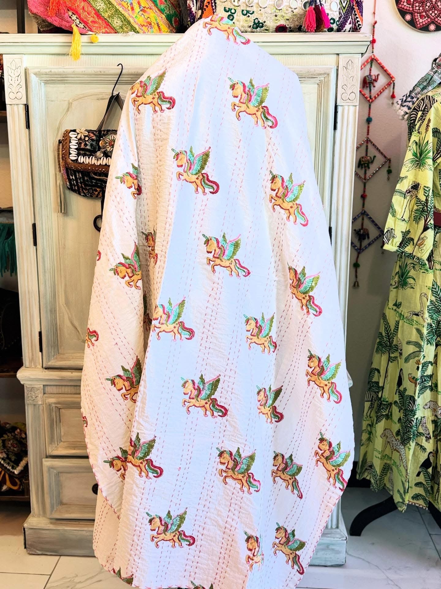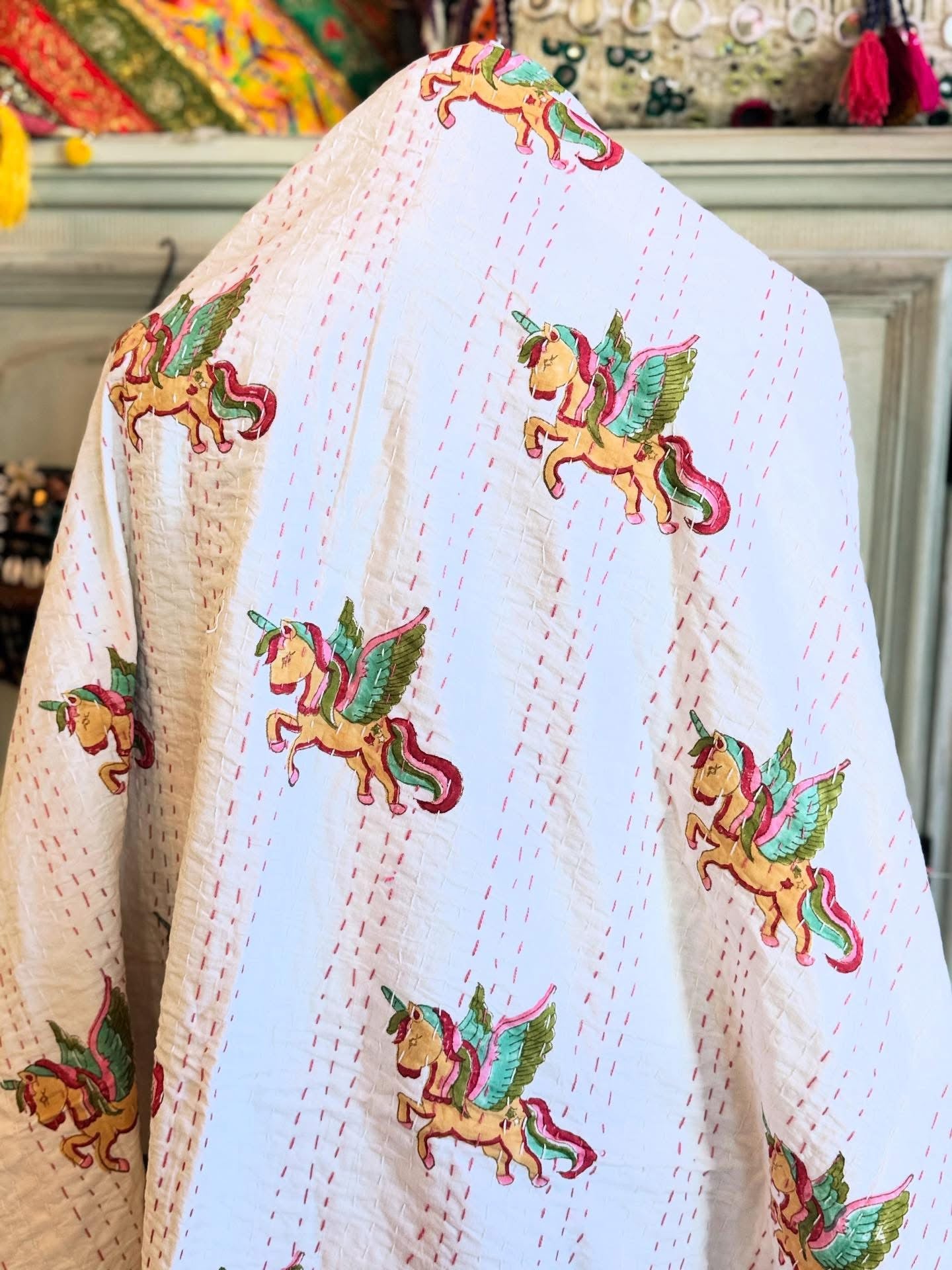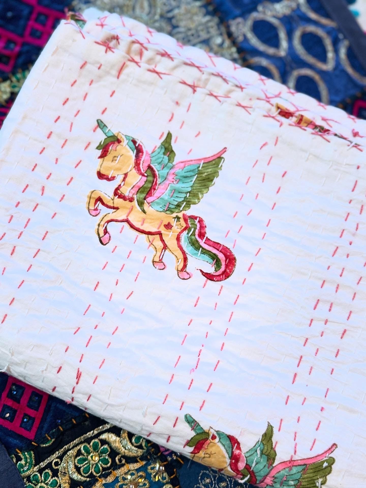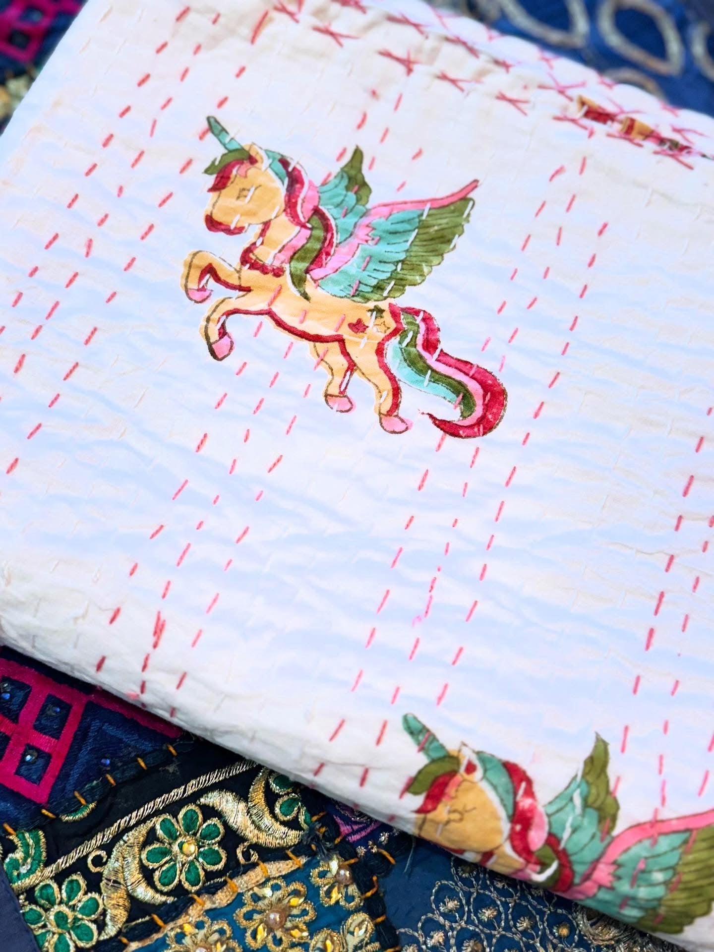 Kantha Cotton Quilt – Unicorns & Solid White | Handmade Toddler Blanket