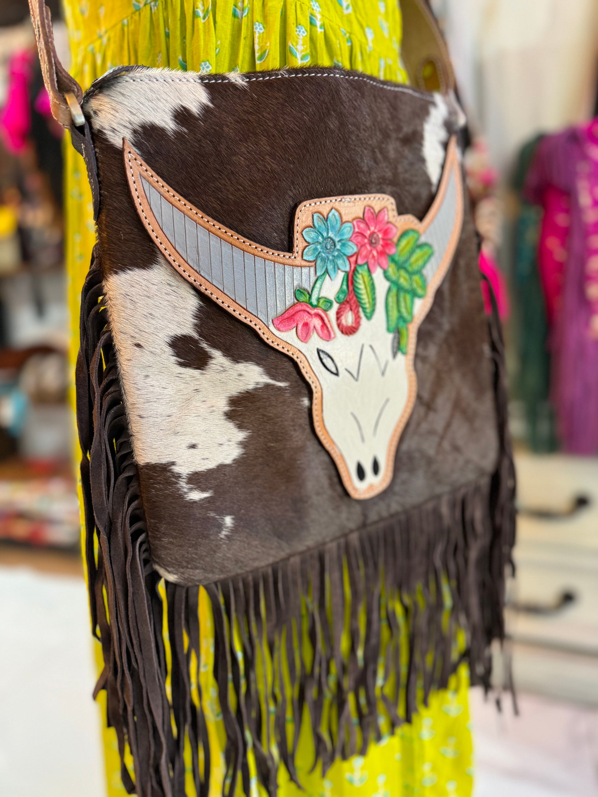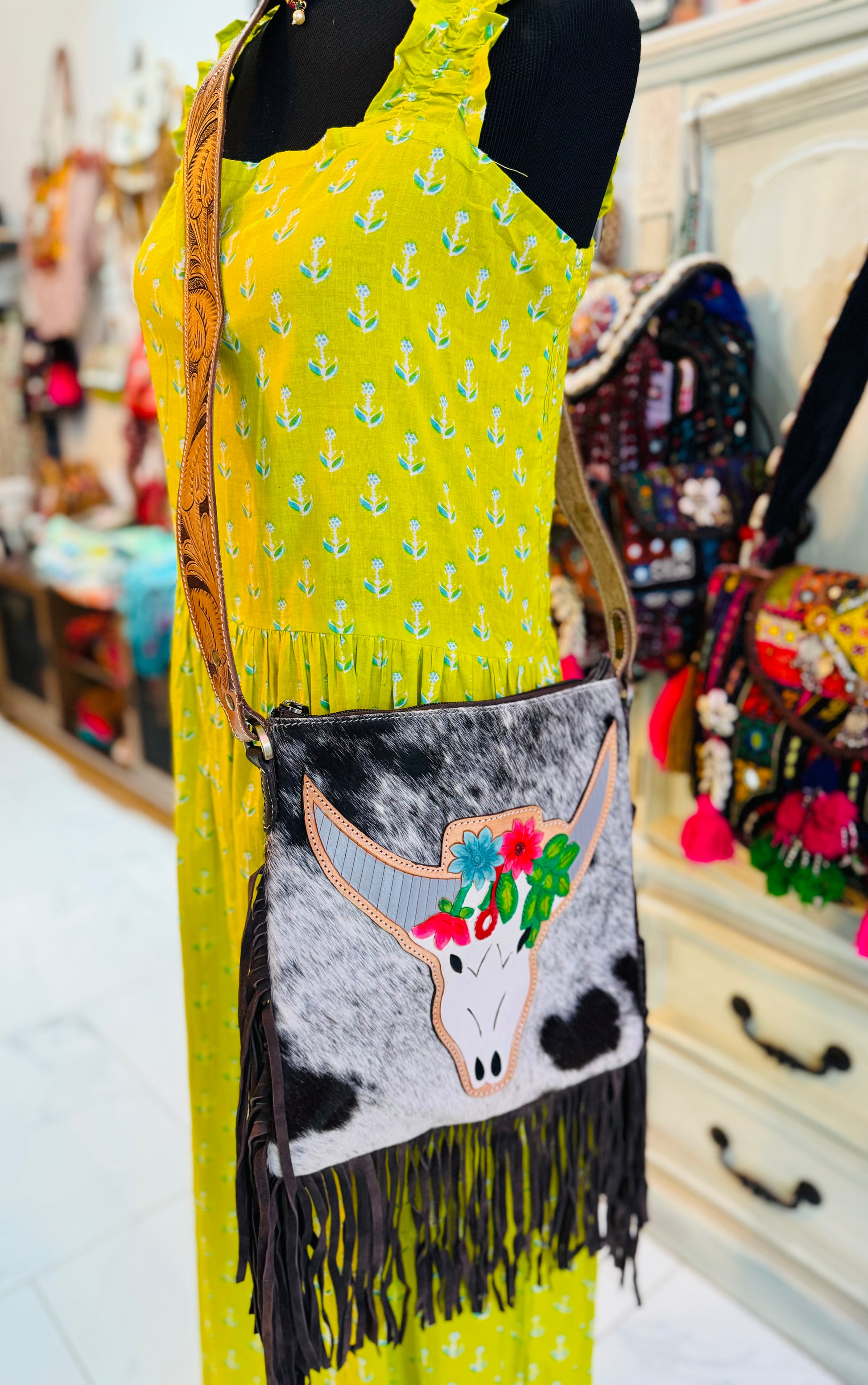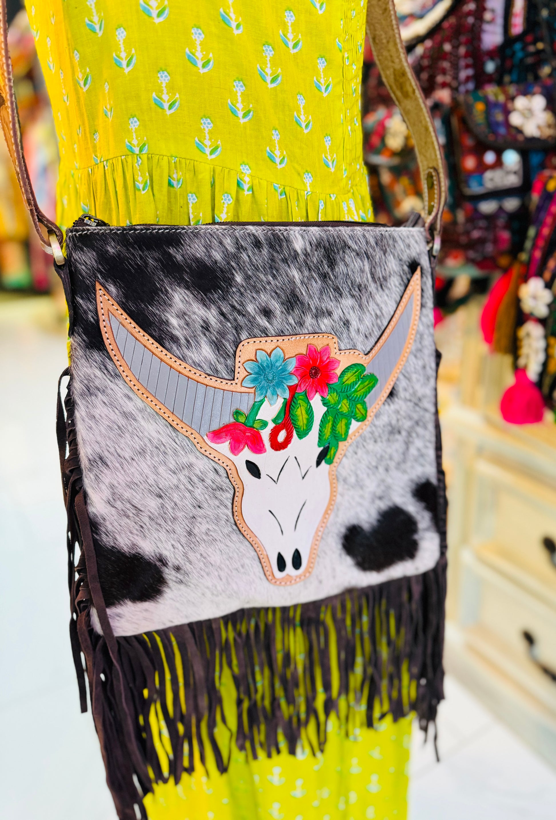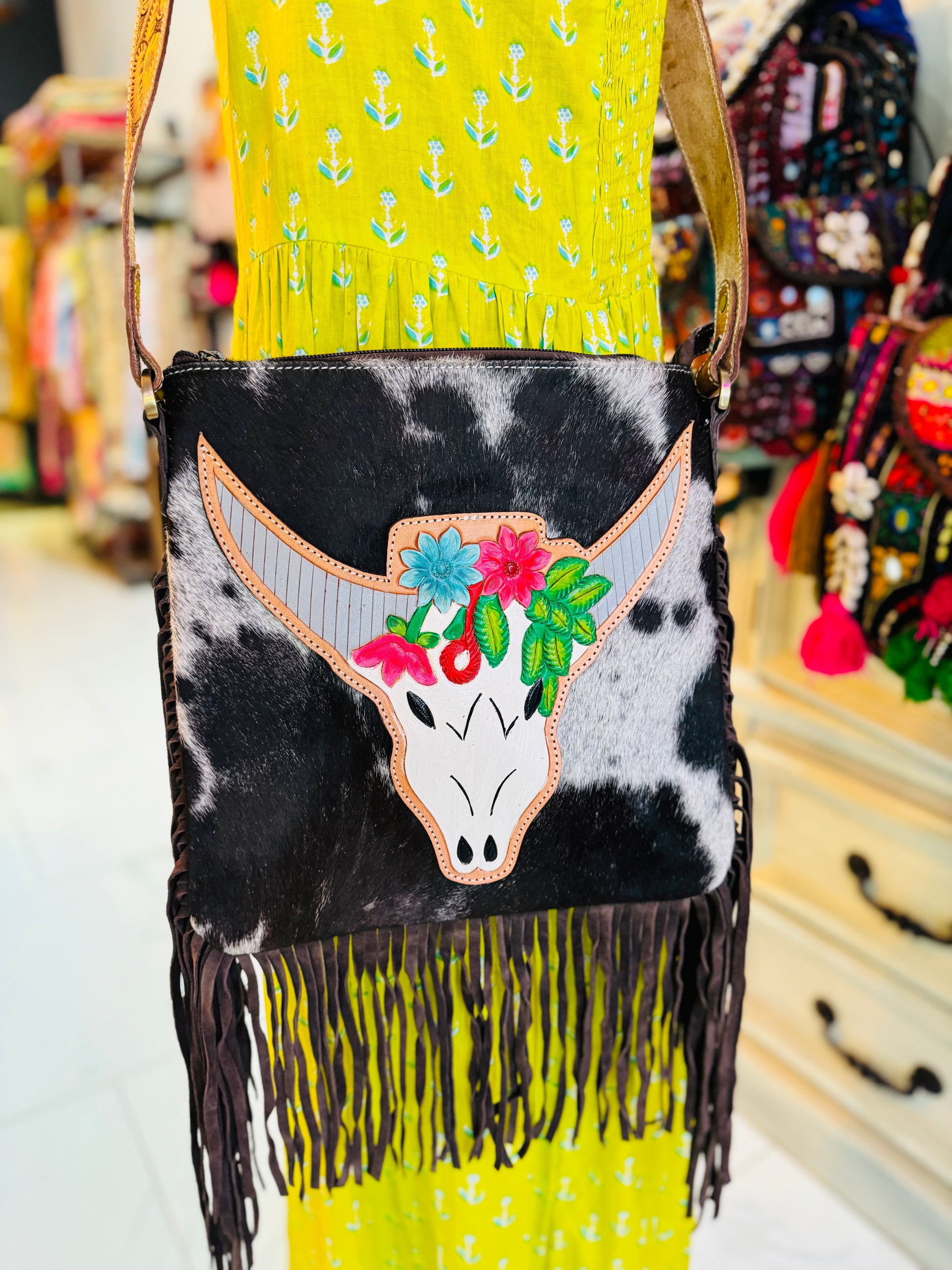 Introducing our exquisite shoulder bag, crafted from premium cowhide and genuine leather. Adorned with a stunning longhorn design and handpainted flowers, this bag is a true statement piece. The sturdy tooled leather strap ensures comfort and durability. Ideal for the cowgirl at heart, it's the perfect blend of rugged charm and artistic elegance.