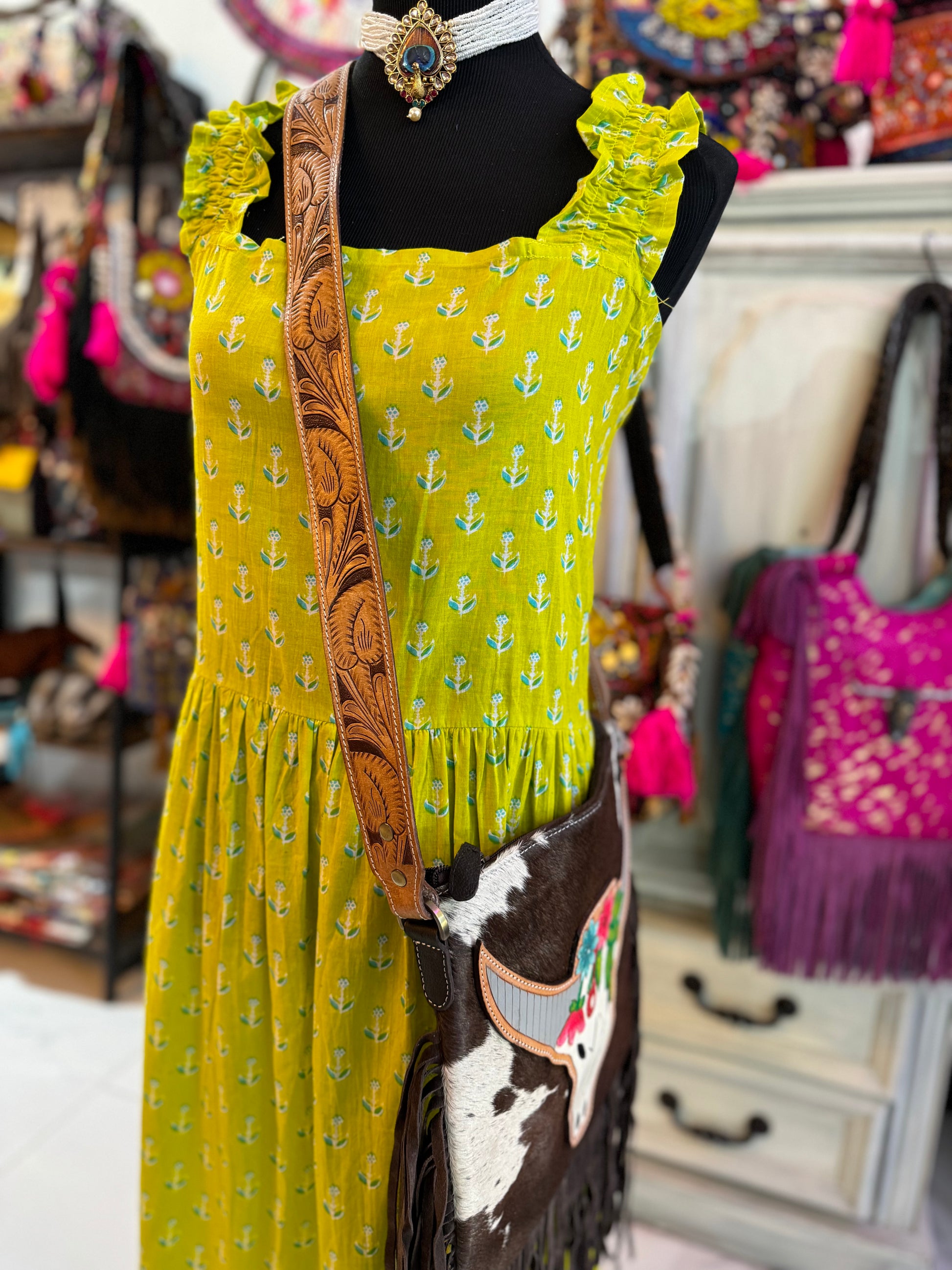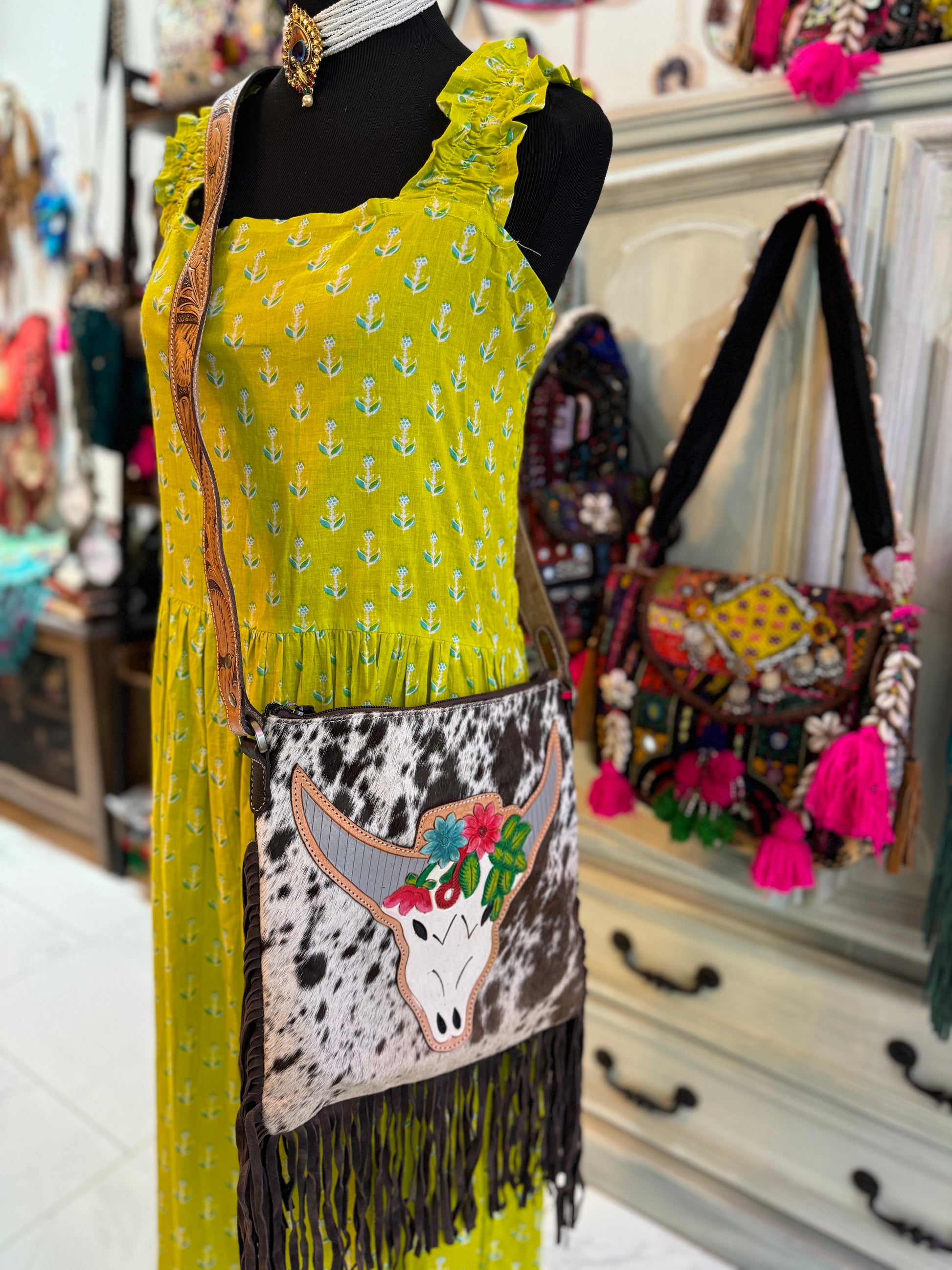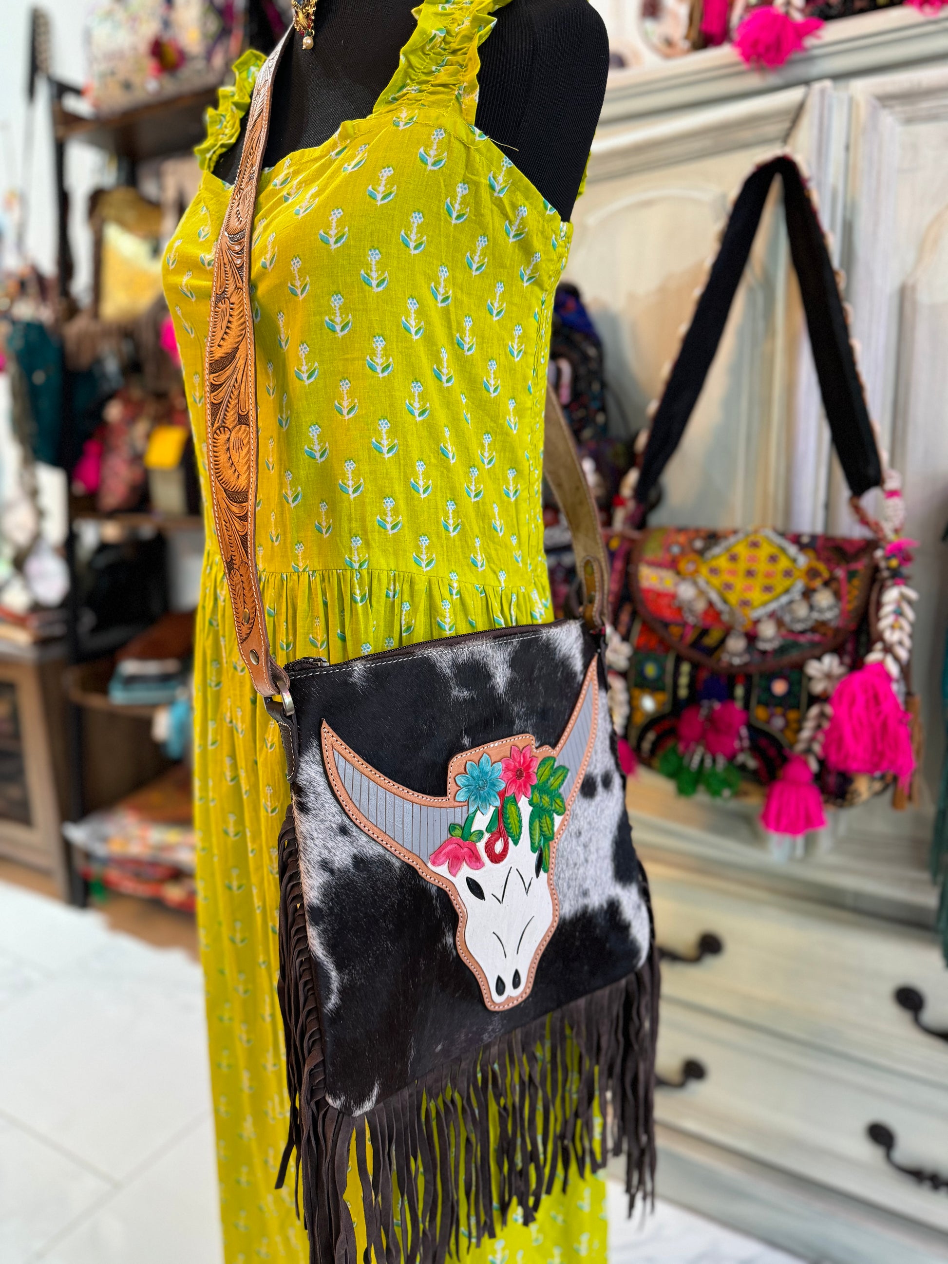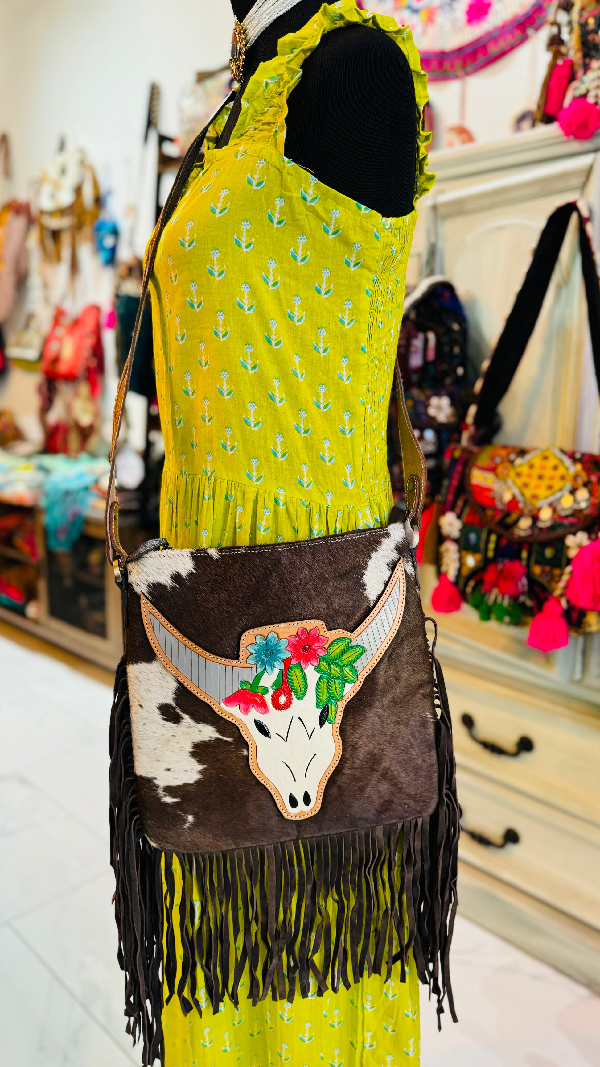 Introducing our exquisite shoulder bag, crafted from premium cowhide and genuine leather. Adorned with a stunning longhorn design and handpainted flowers, this bag is a true statement piece. The sturdy tooled leather strap ensures comfort and durability. Ideal for the cowgirl at heart, it's the perfect blend of rugged charm and artistic elegance.