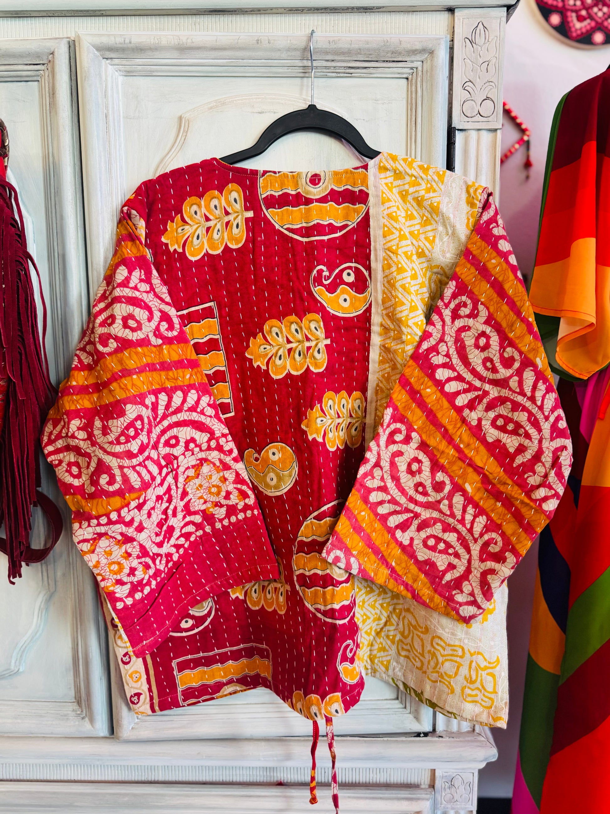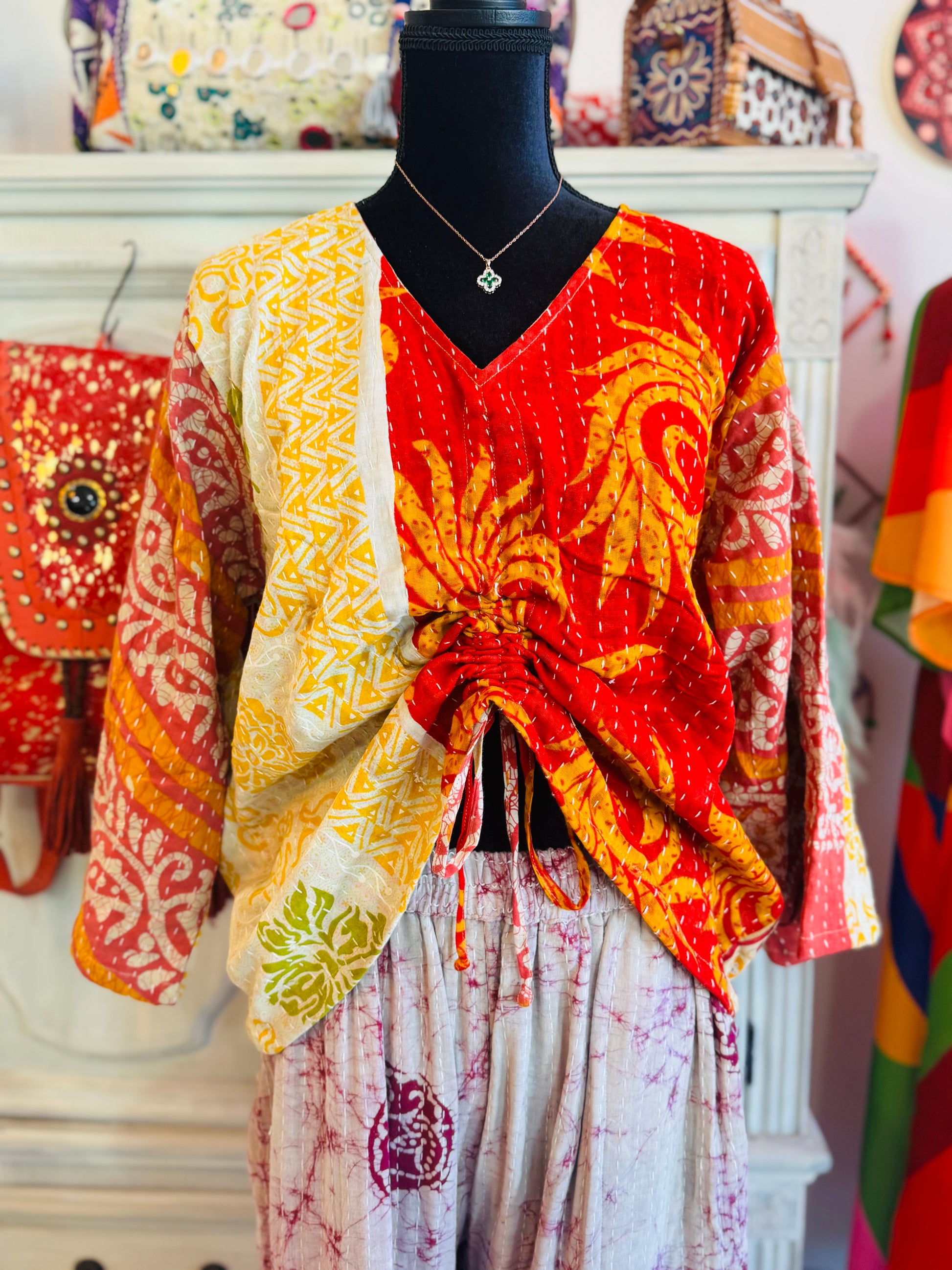 A radiant blend of warm marigold, deep red, and soft cream, the Marigold Ember Butterfly 2-Way Top brings effortless boho charm to every day. Handmade from vintage saree kantha cotton, this one-of-a-kind blouse features a beautifully textured finish and a relaxed silhouette you can style in two ways.