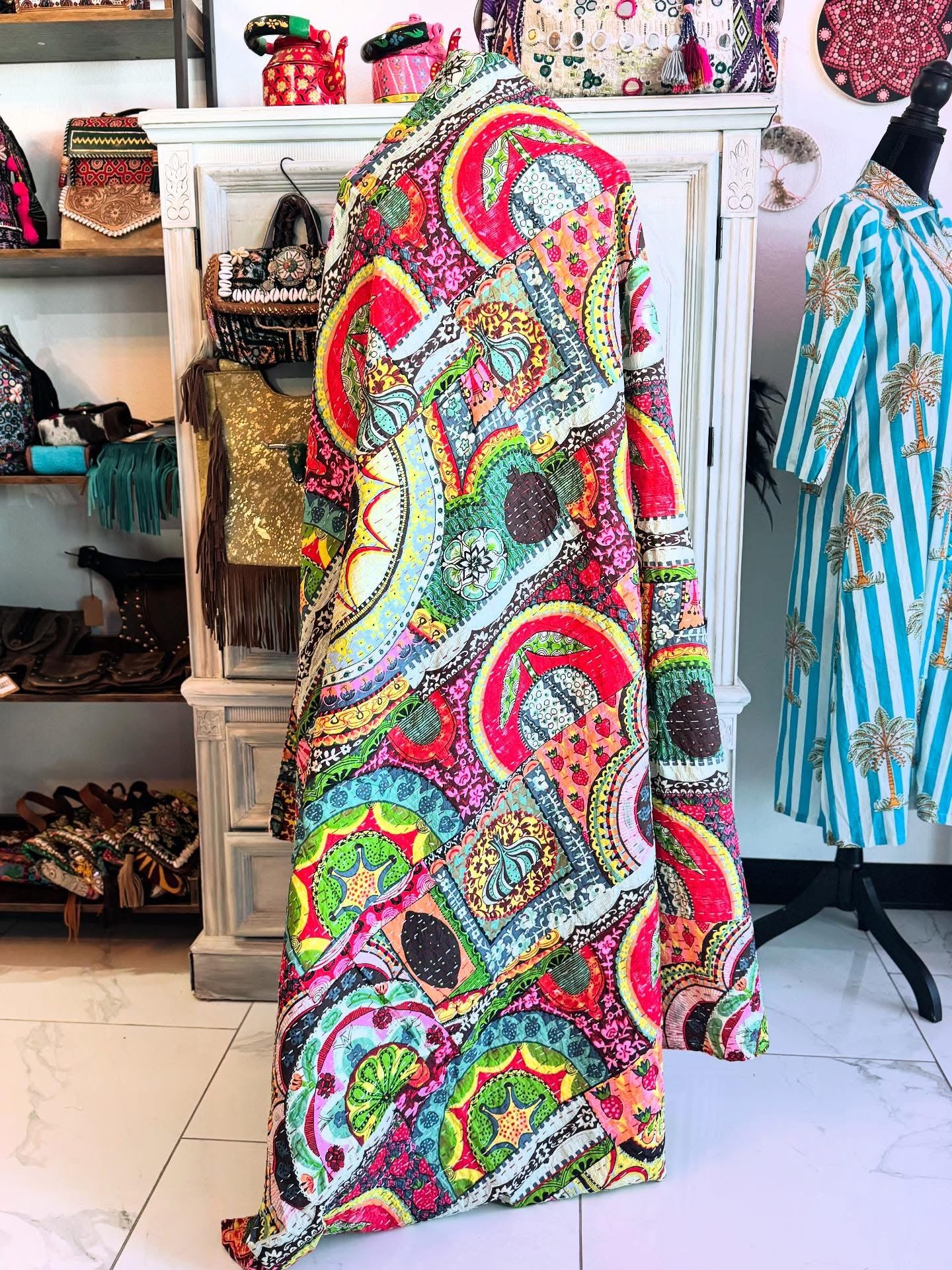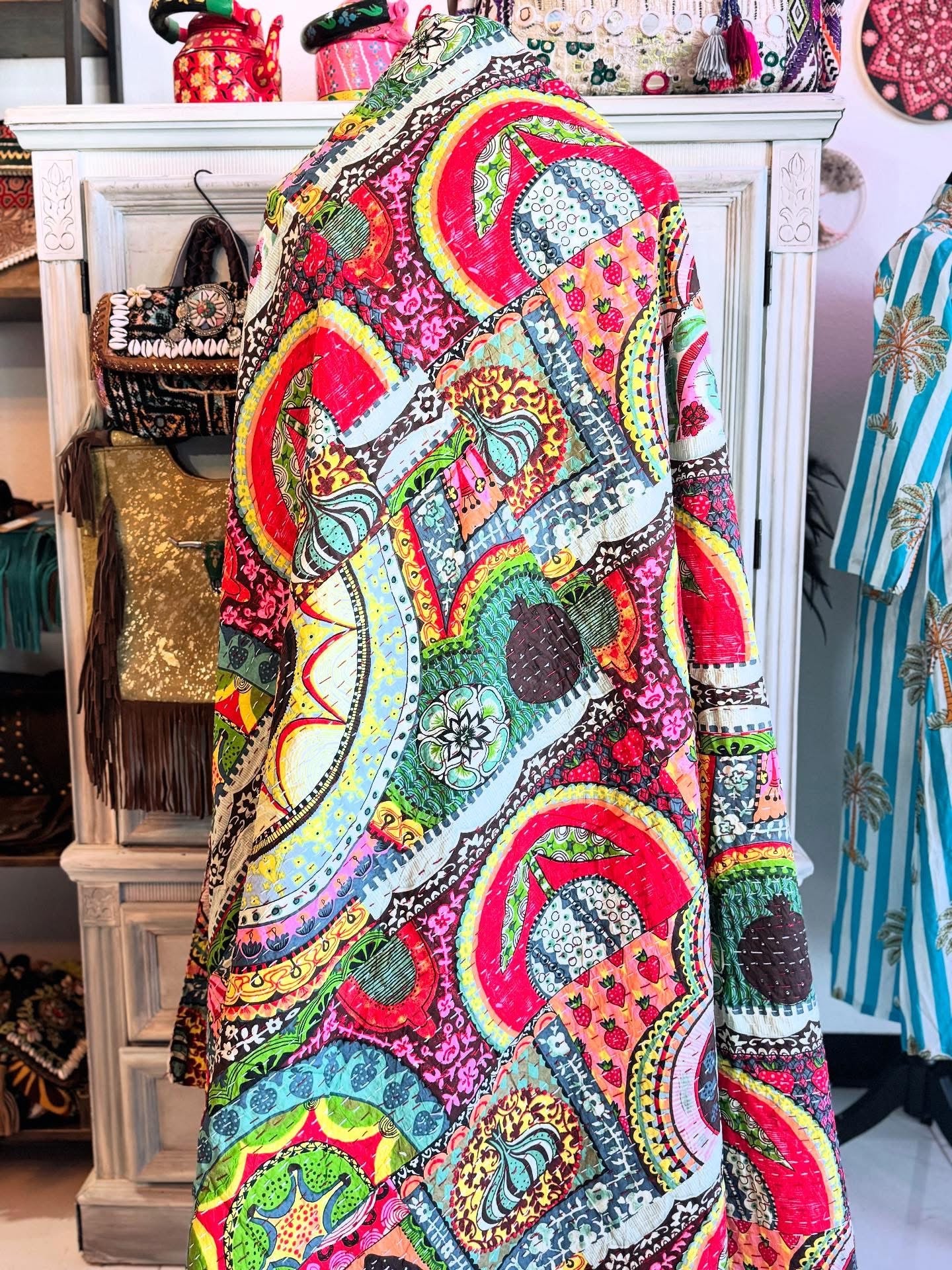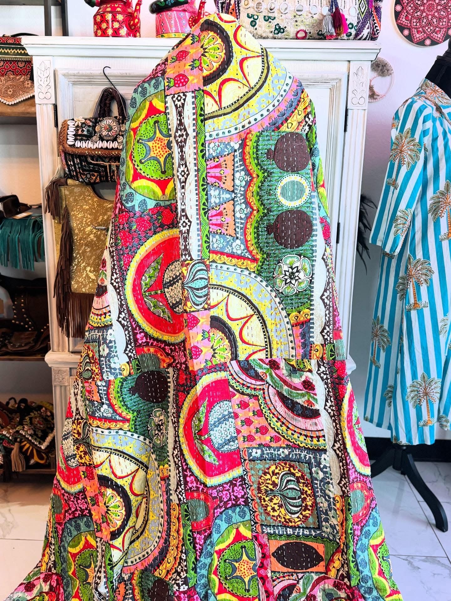 Wrap yourself in vibrant joy with our Mini Boho Mosaic quilt/ throw — a handblock printed Kantha bursting with eclectic charm. Featuring a lively blend of florals, fruits, and boho-inspired patterns, it gives the look of a playful patchwork without any actual piecing. The reverse is finished with a clean solid white for a modern balance.