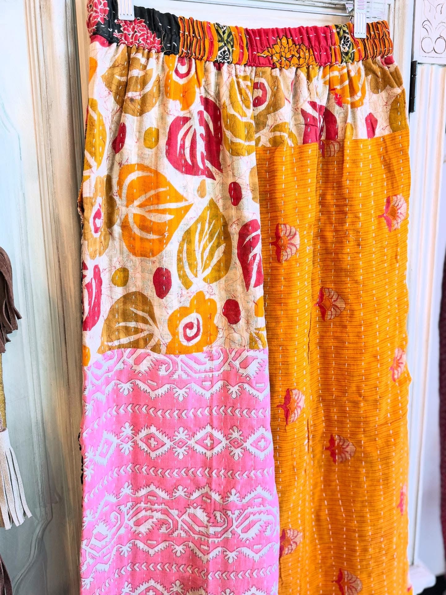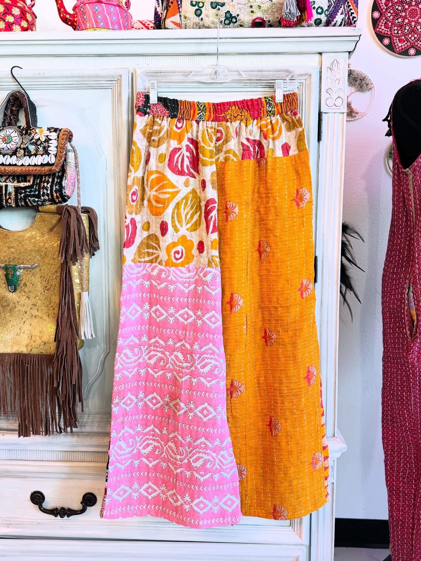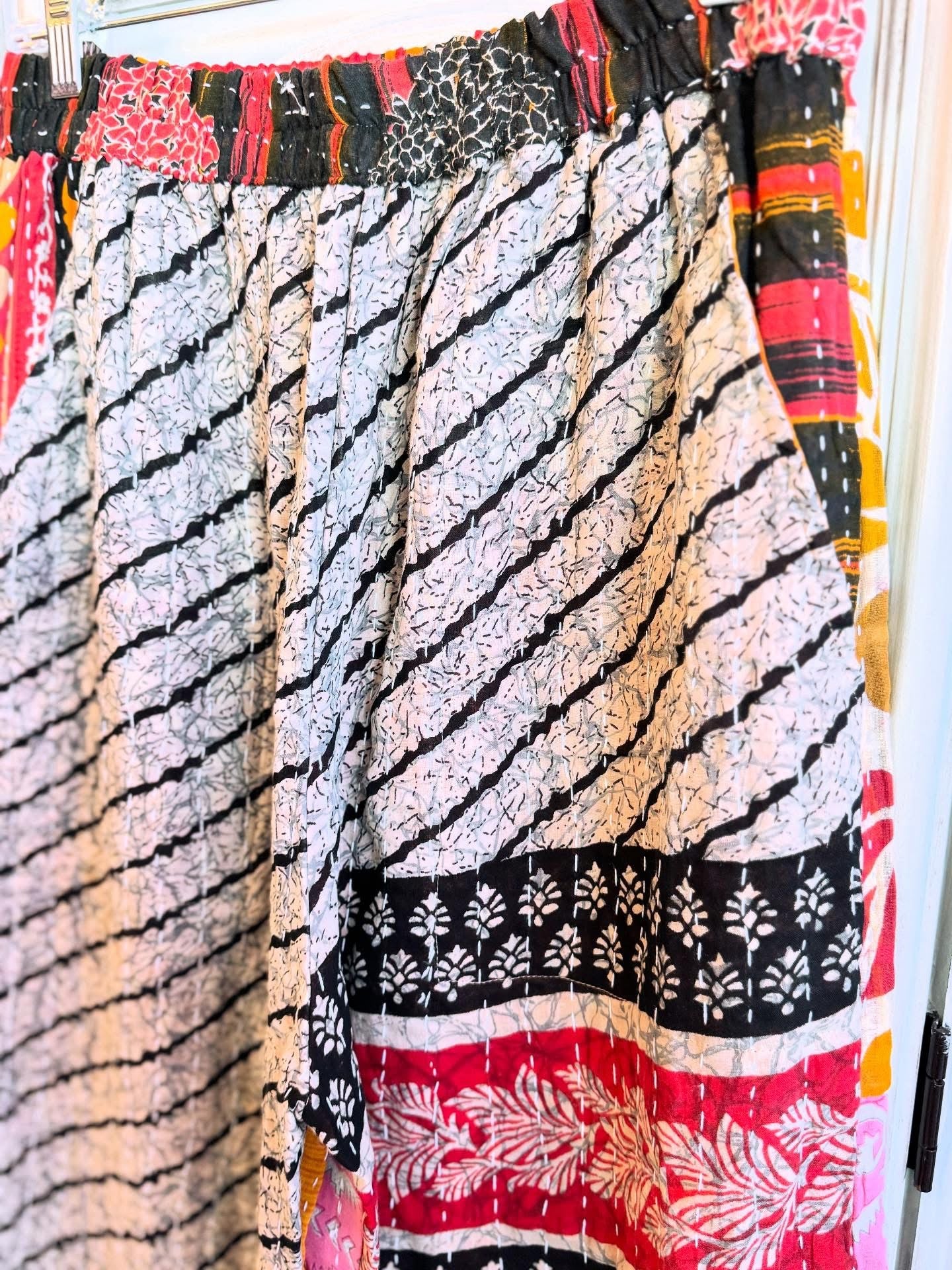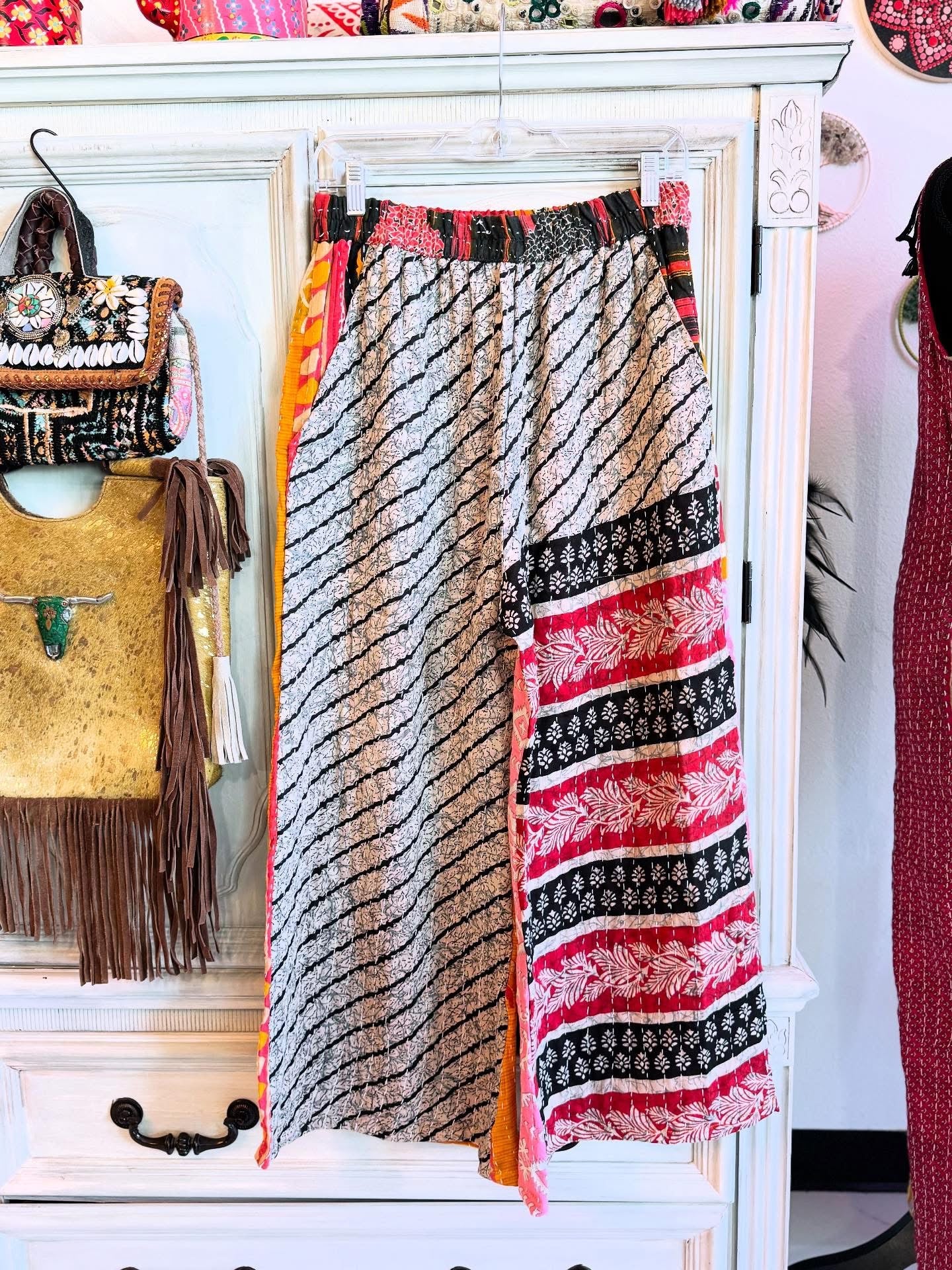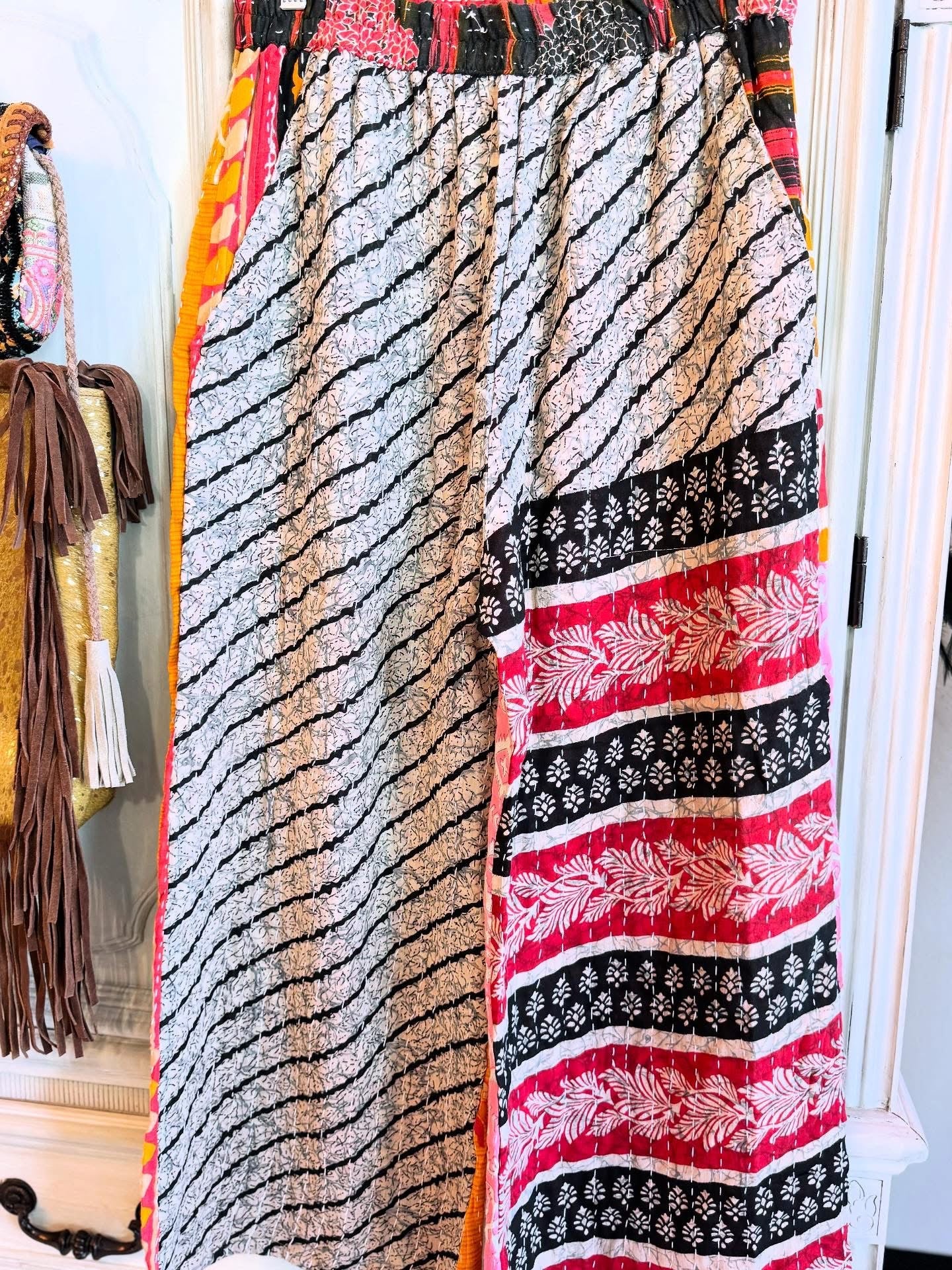 Elevate your everyday look with our Monochrome Mix Kantha Pants, crafted from 100% cotton quilts made of repurposed Indian sarees. Featuring black-and-white stripes, floral borders, and bold crimson details, these wide-leg pants blend classic contrast with artisan Kantha stitching — a sophisticated take on slow fashion and upcycled design.
