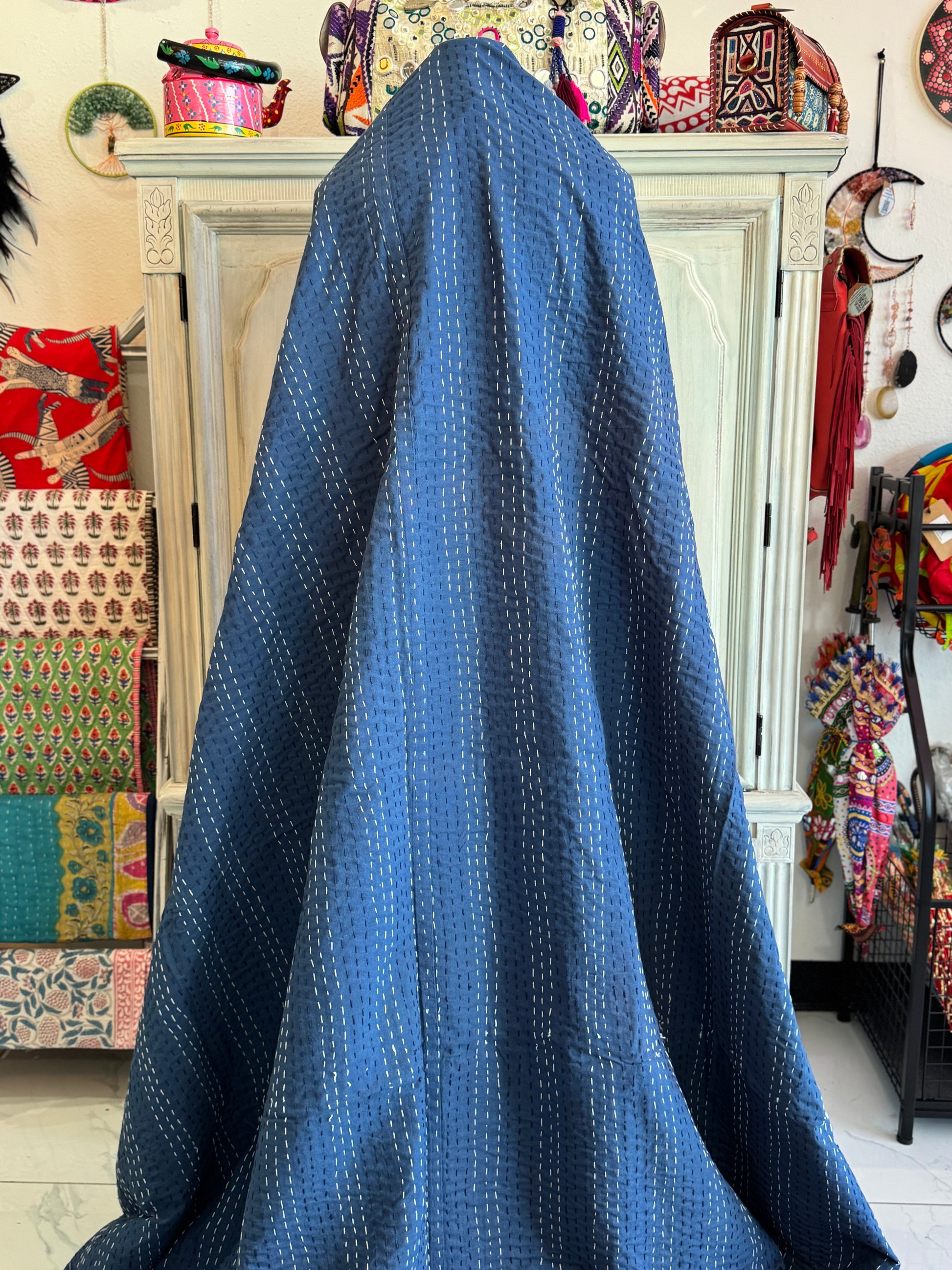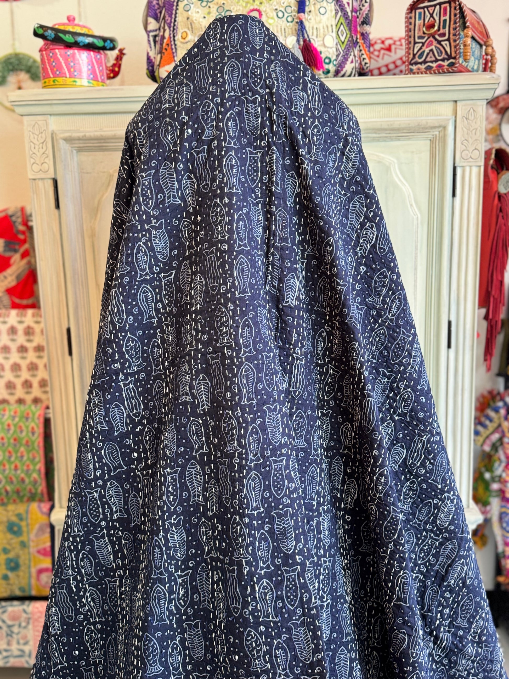 Meet Moonfish — a coastal-inspired Kantha quilt made from 100% cotton and stitched by hand. One side features white outlined fish swimming across a softly faded blue background, framed by a detailed printed border. The natural fade in areas only adds to its vintage charm and handmade beauty.