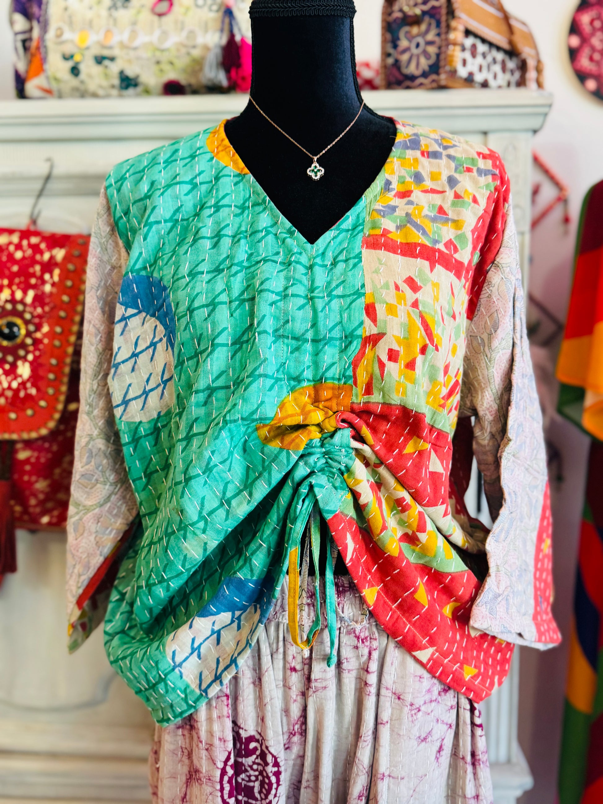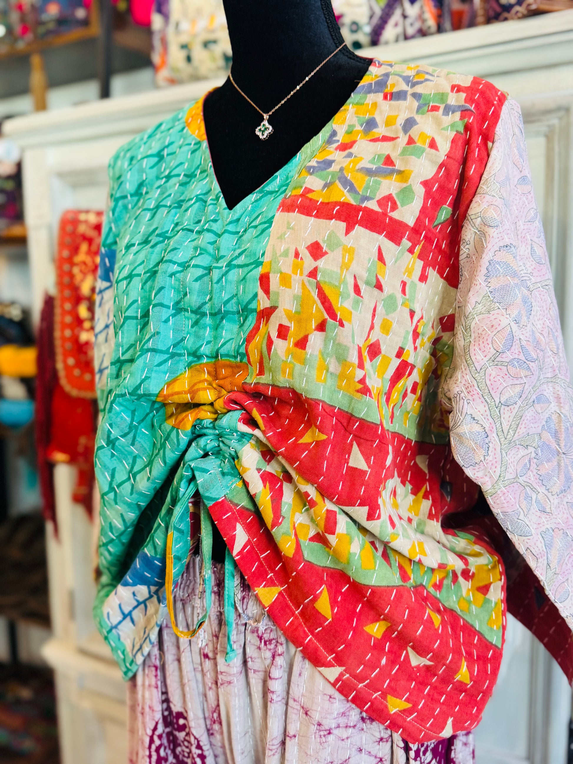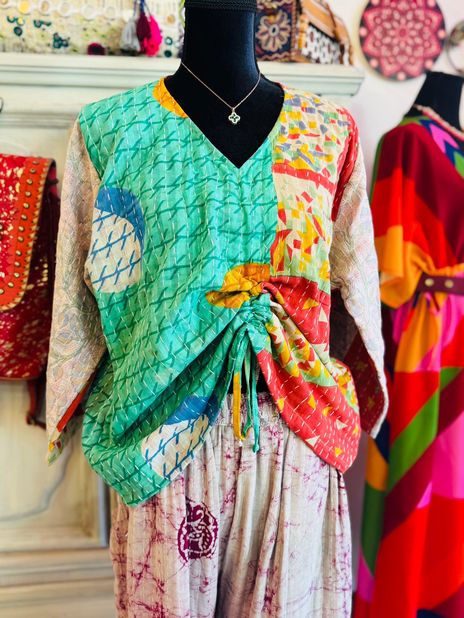 Playful, artsy, and full of movement — the Ocean Patchwork Breeze Butterfly 2-Way Top brings together teal, red, mustard, and cream in a patchwork-style kantha design that feels effortlessly eclectic. Its relaxed sleeves and breathable cotton make it a standout everyday piece, while the drawstring center lets you switch between a flowy silhouette and a more defined fit.