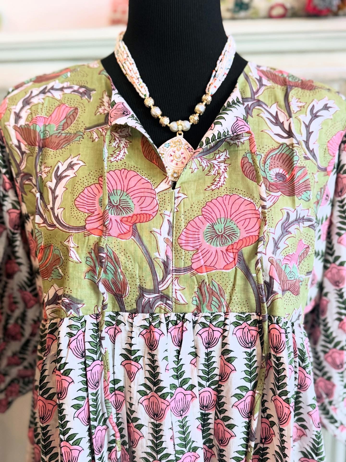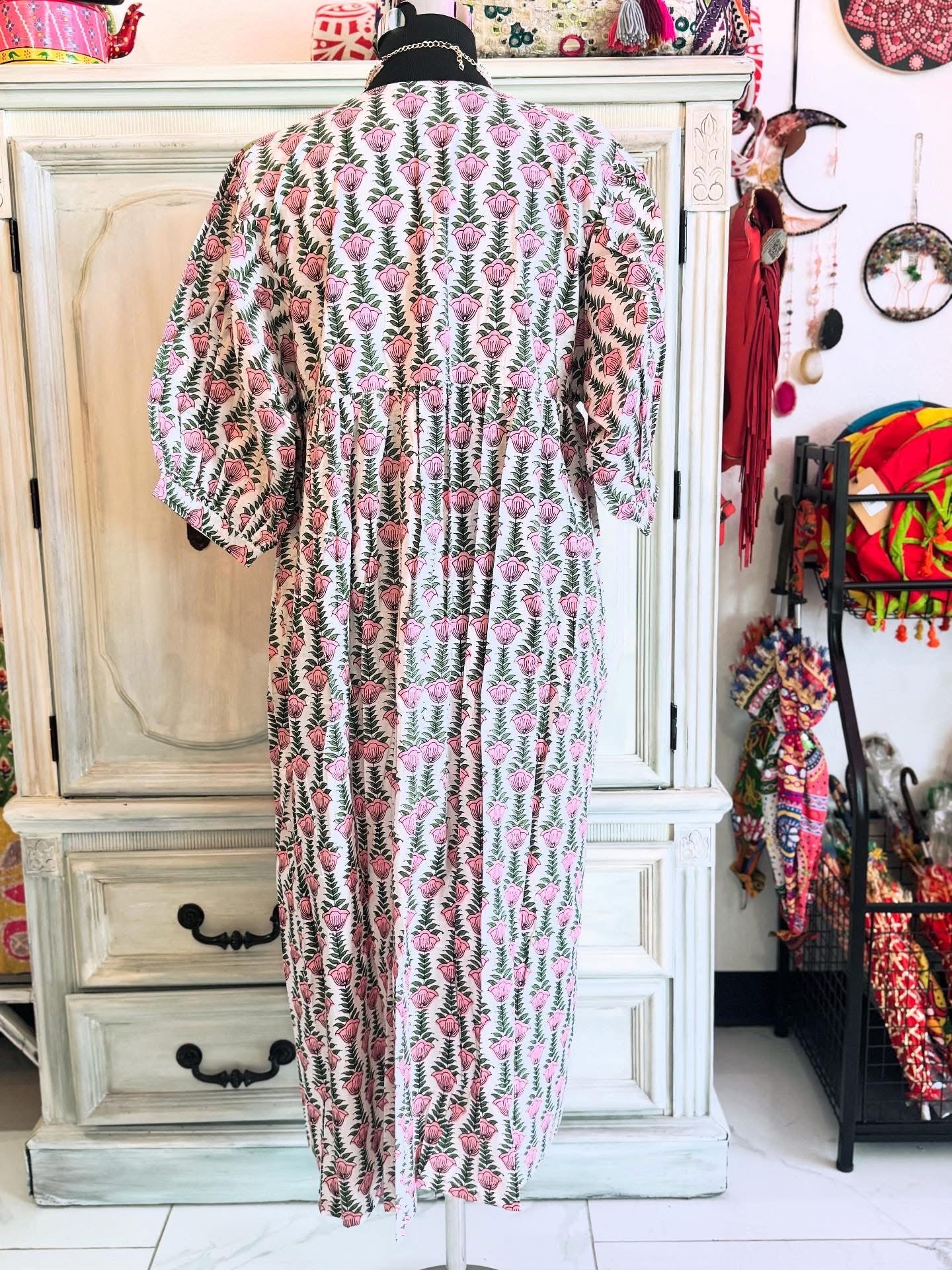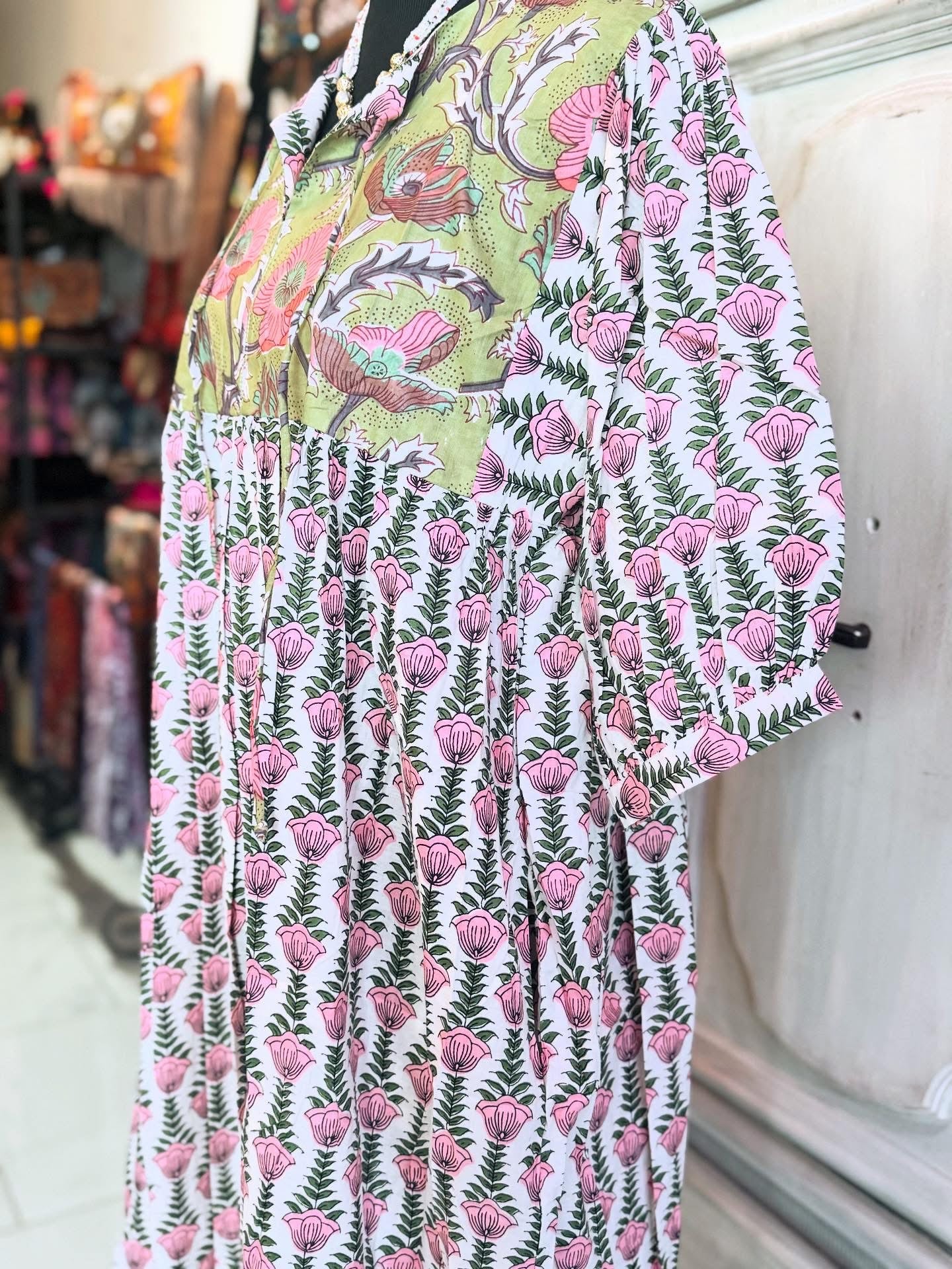 Wildflower Harmony blends two beautiful worlds — lush green florals and soft pink lotus motifs. With its layered look and free-flowing silhouette, this handmade cotton dress with side pockets is your go-to for effortless elegance.