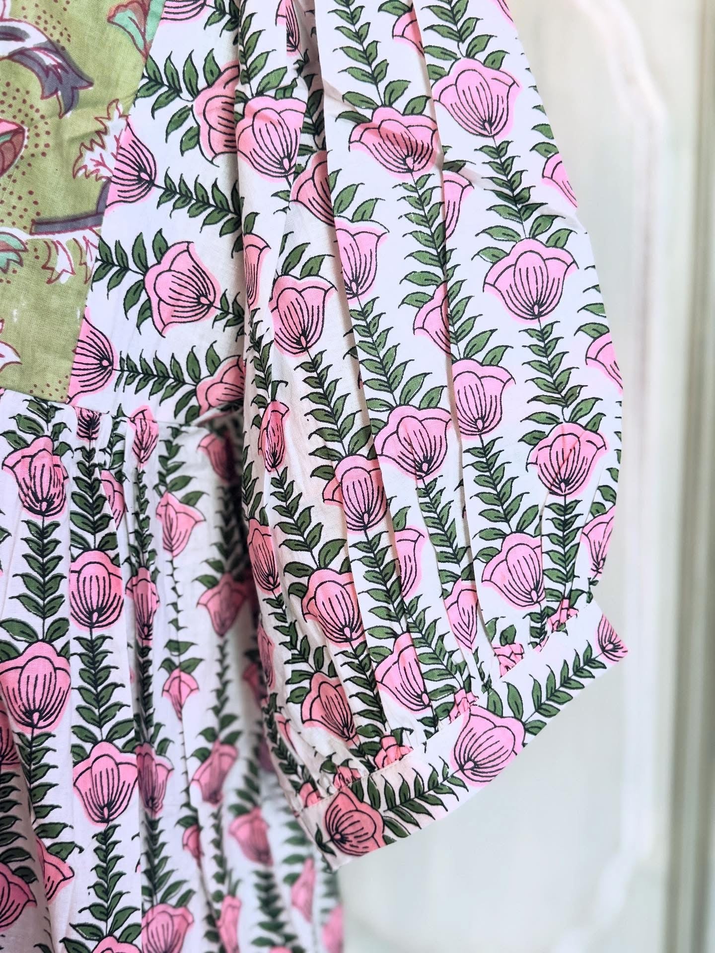 Olive Petal - Mixed Print Cotton Dress - Pink and Olive Tones
