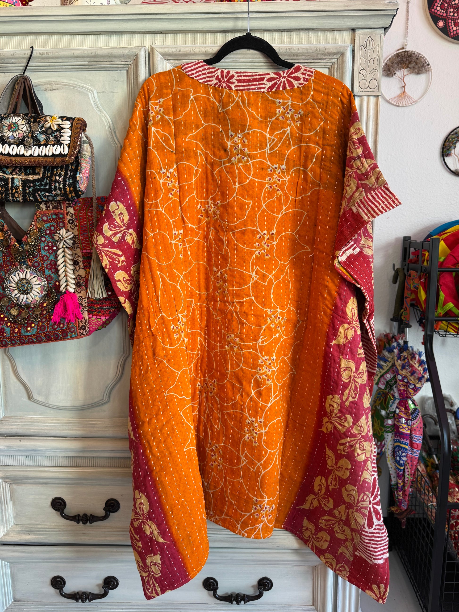 A vibrant orange Kantha dress adorned with delicate white pencil-drawn flowers, handcrafted from 100% cotton saree quilts. A wearable piece of art blending tradition and modern style.