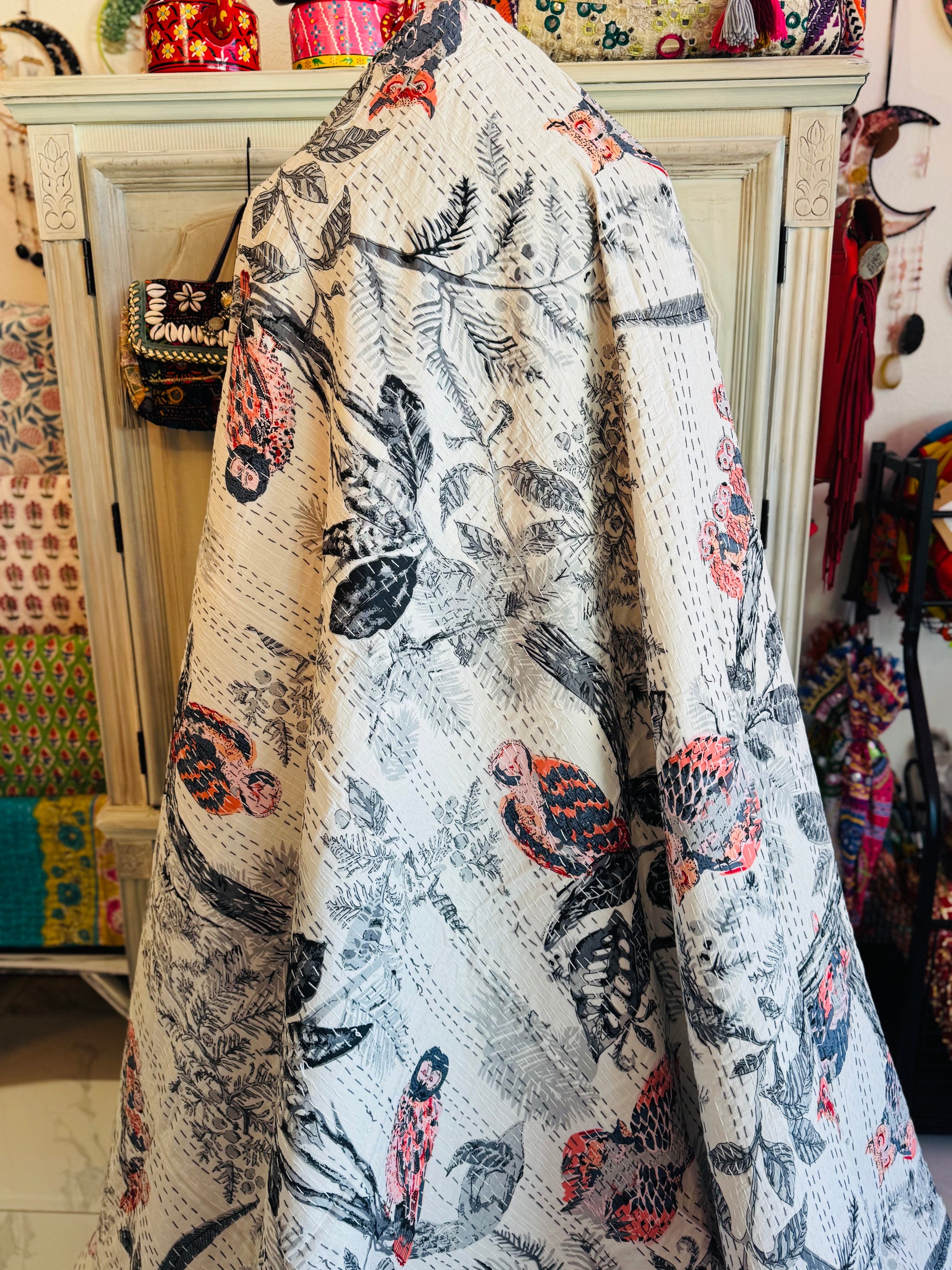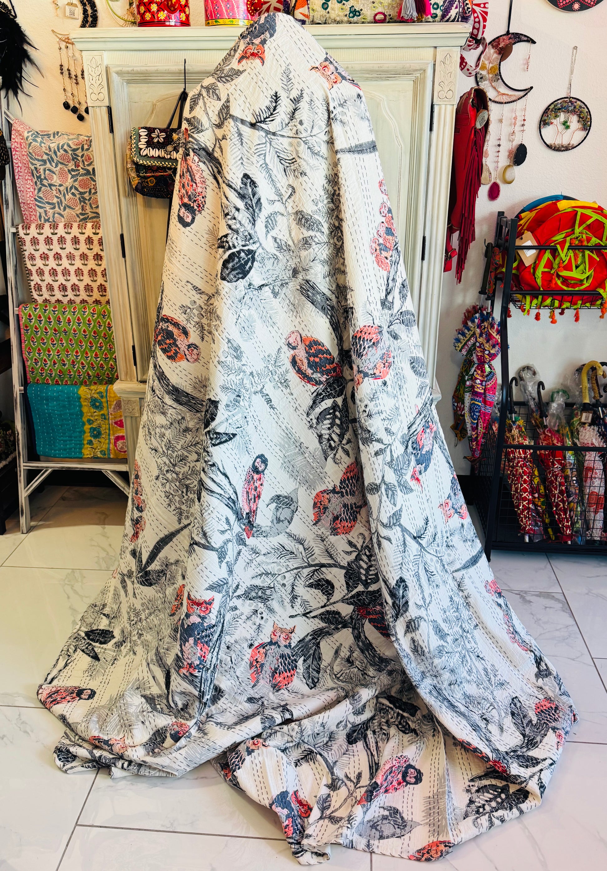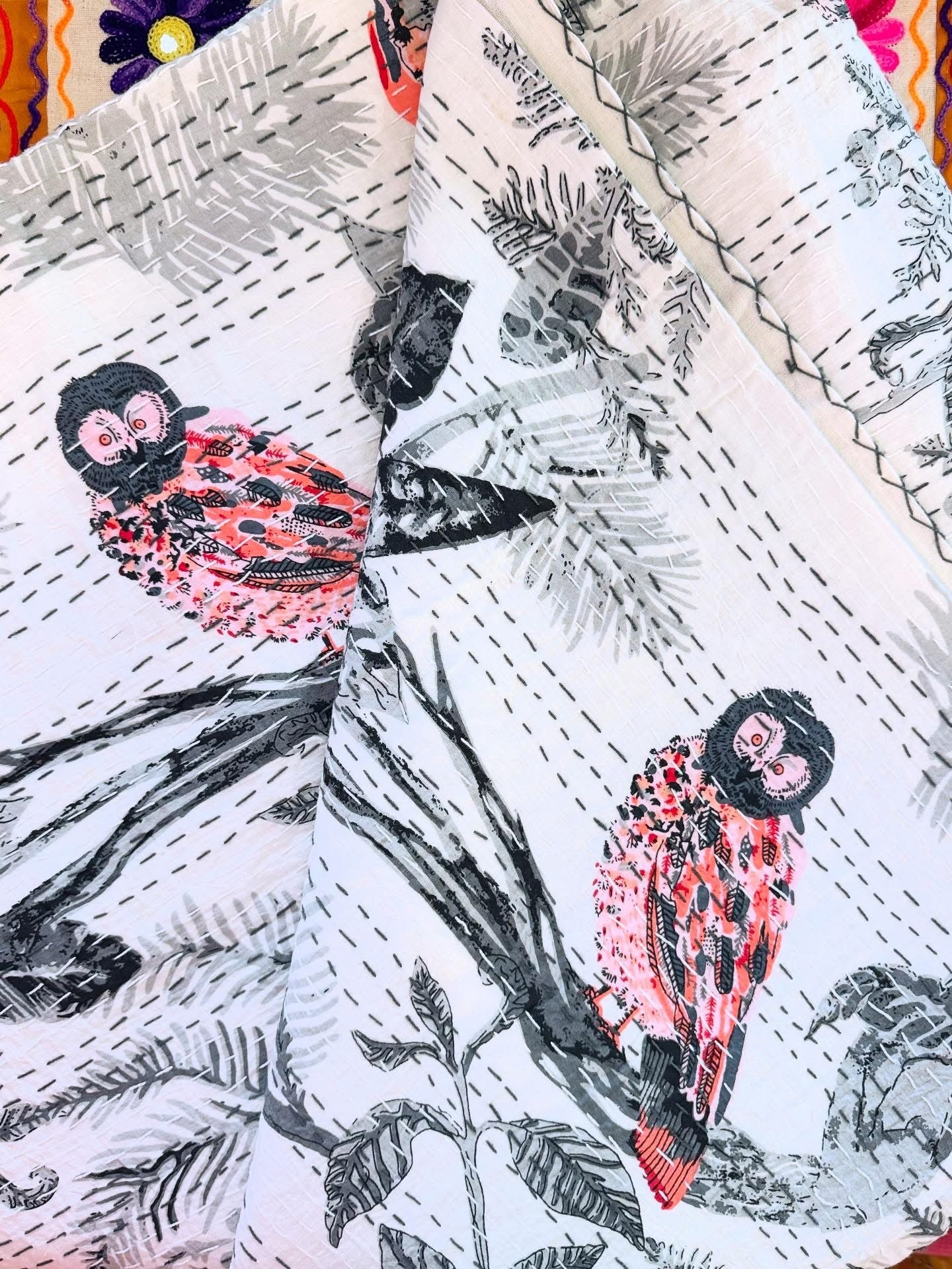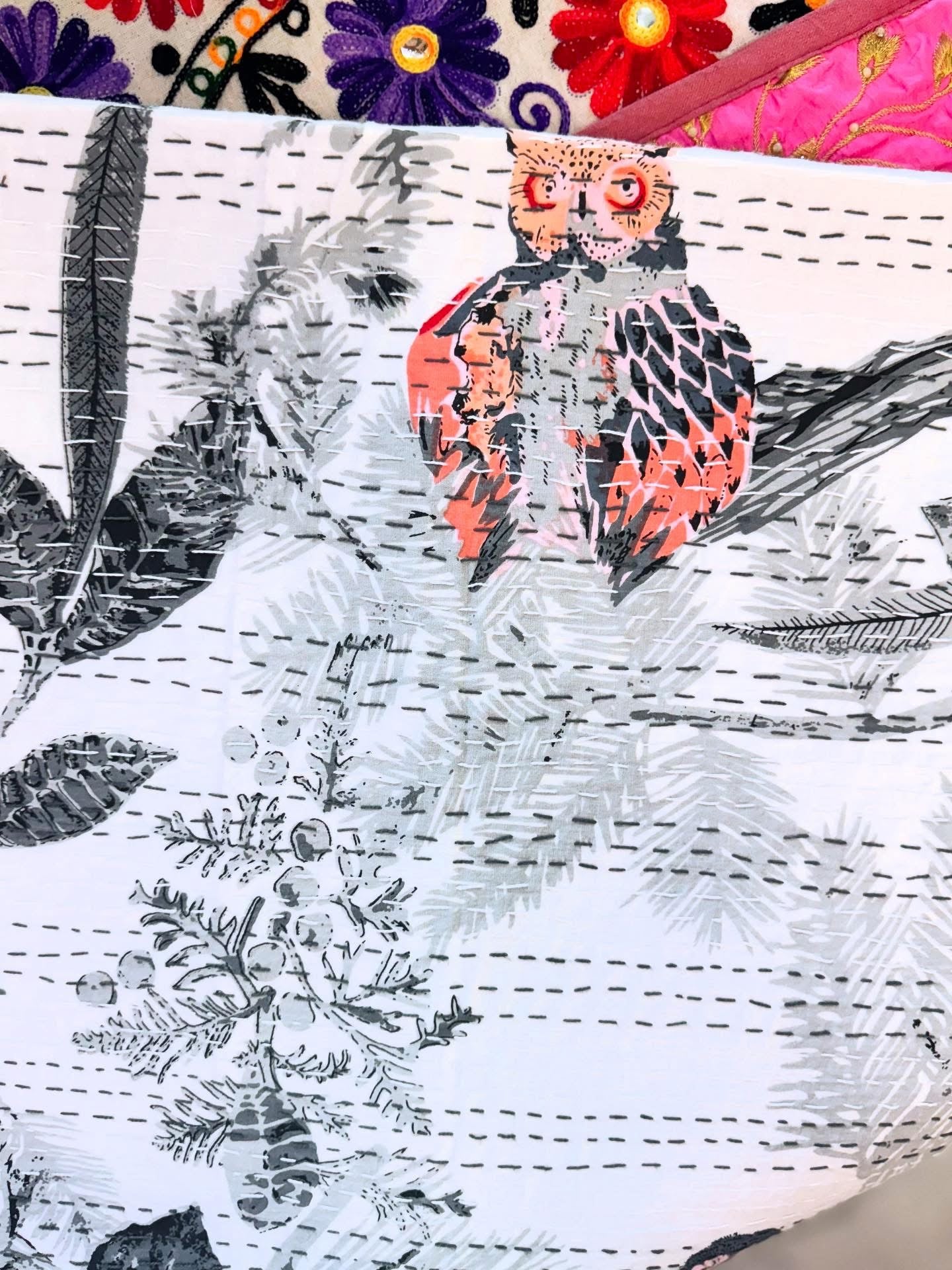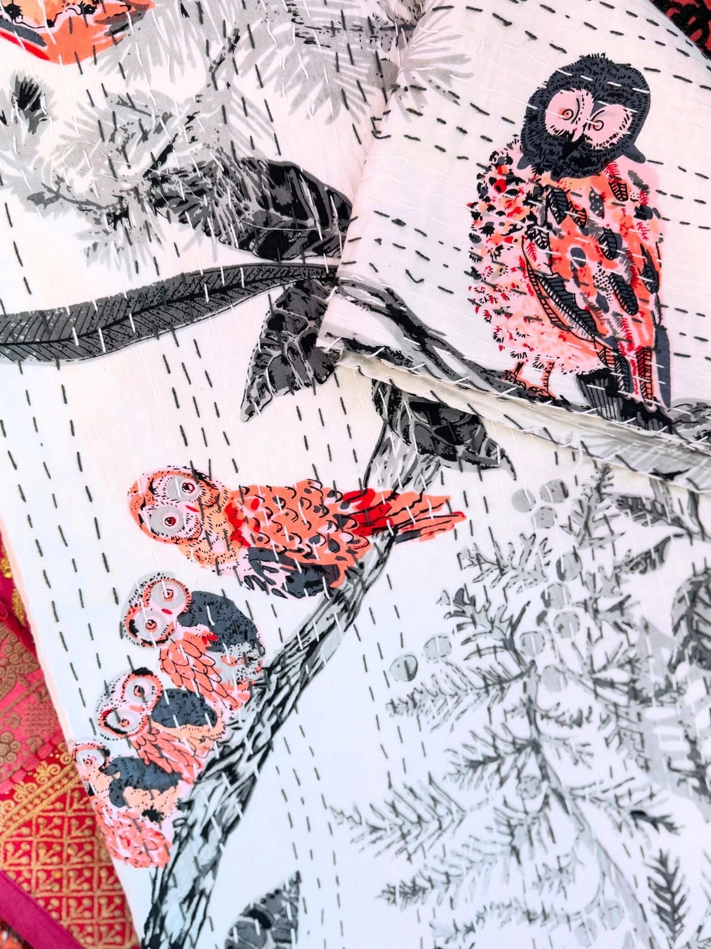 Owl Family – Handblock Printed Kantha Quilt – 100% Cotton | Handmade