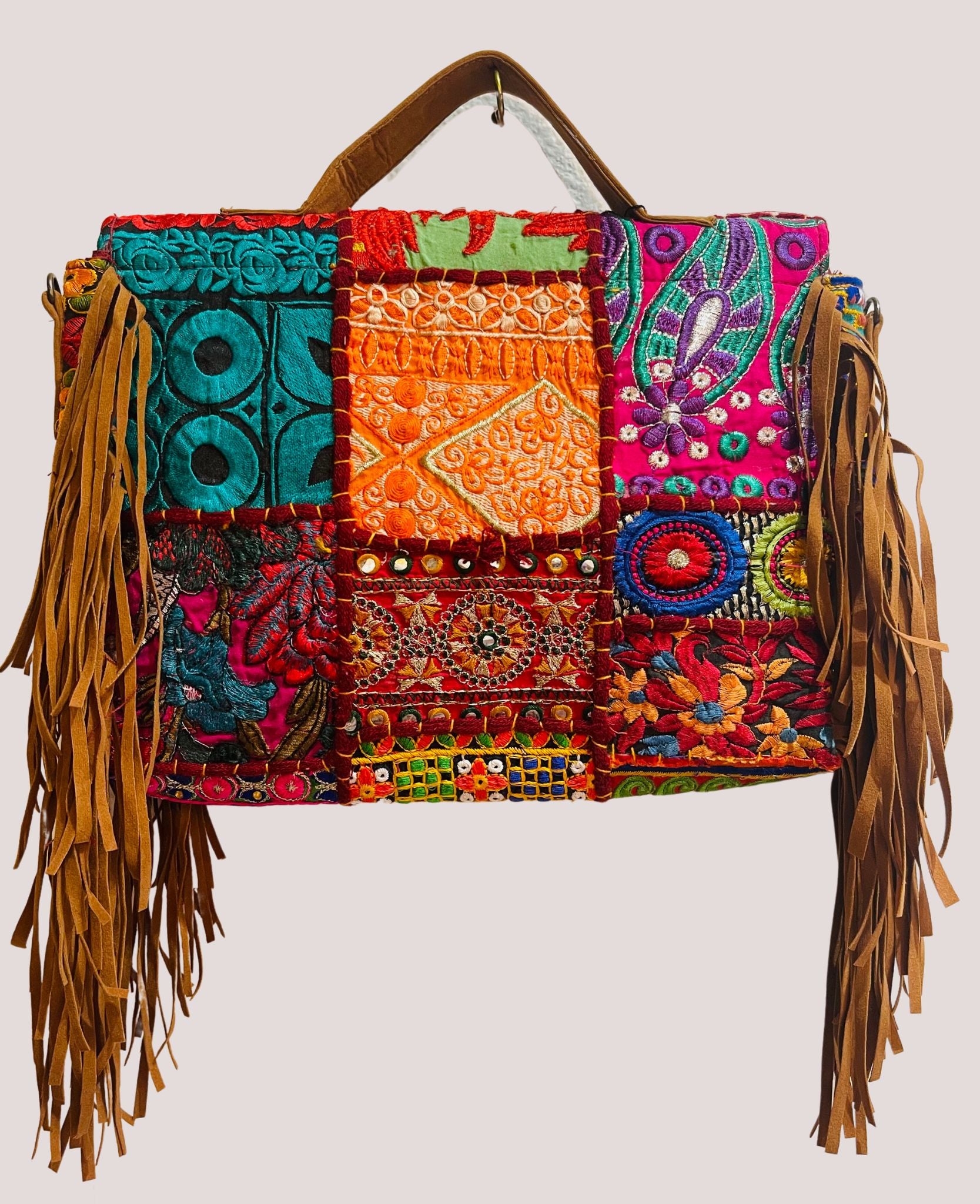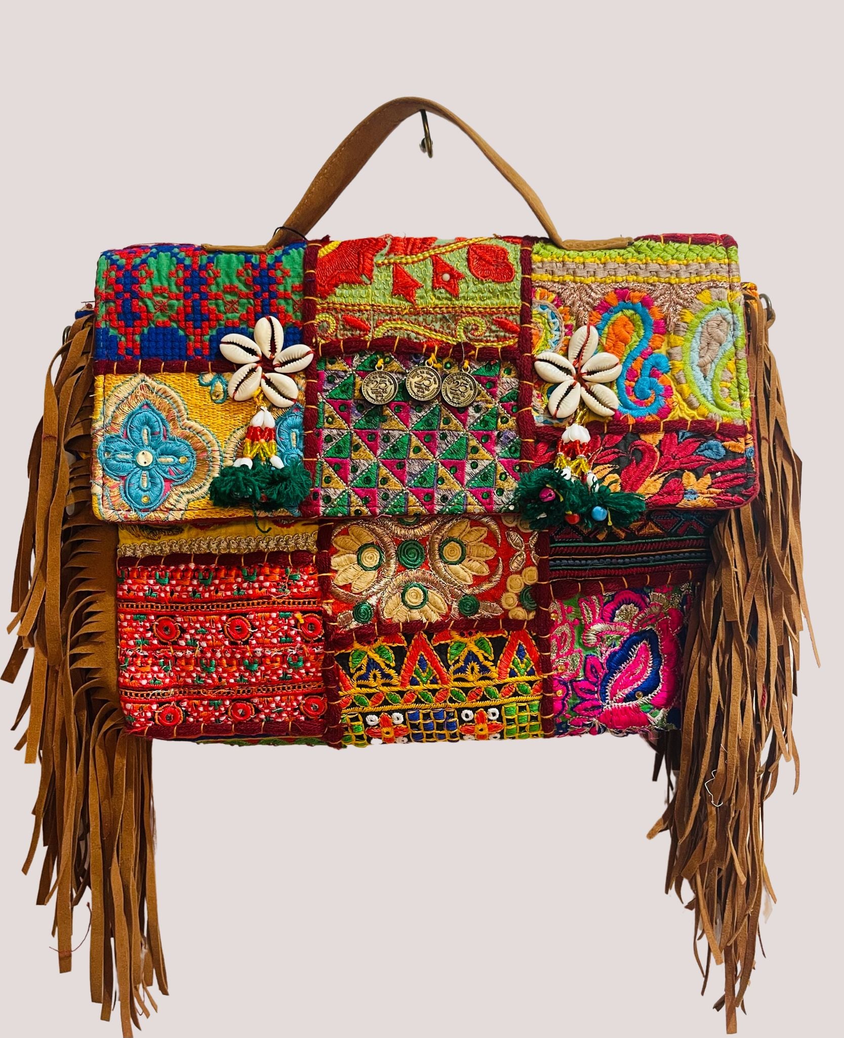 One of a kind Shoulder Bag with long strap, embroided patches decorated with stones, coins, beads and more. Removable long shoulder strap.