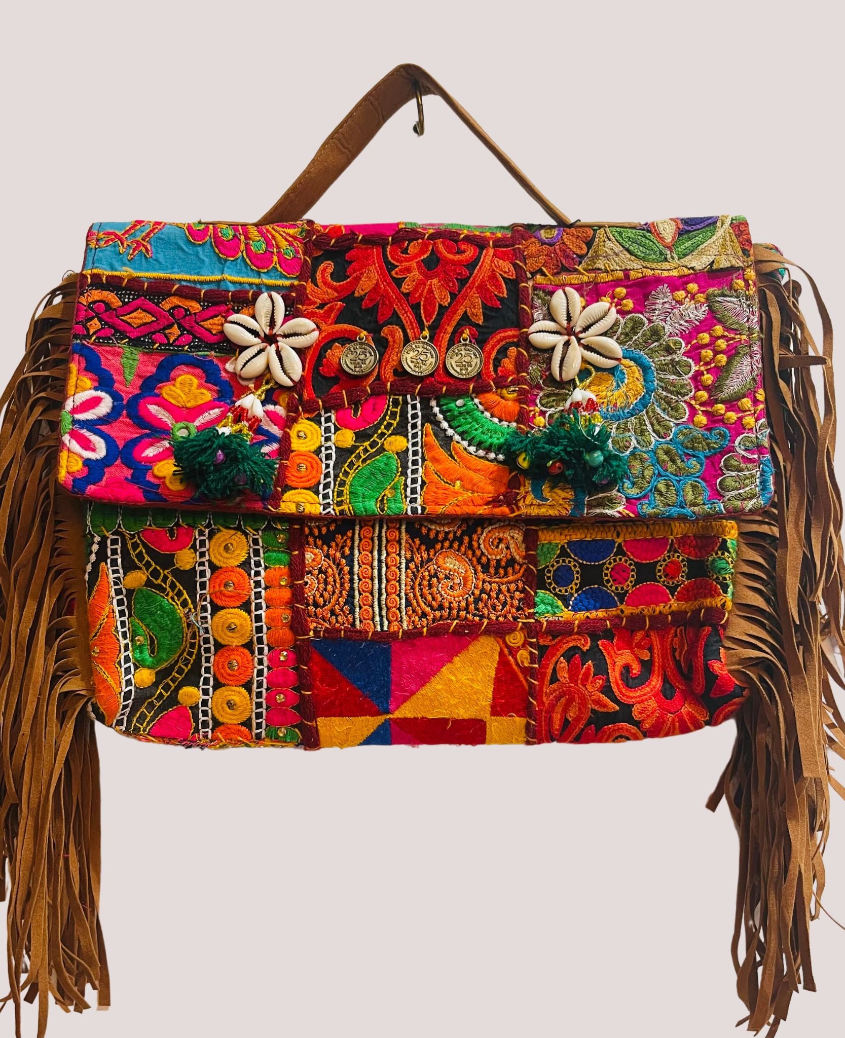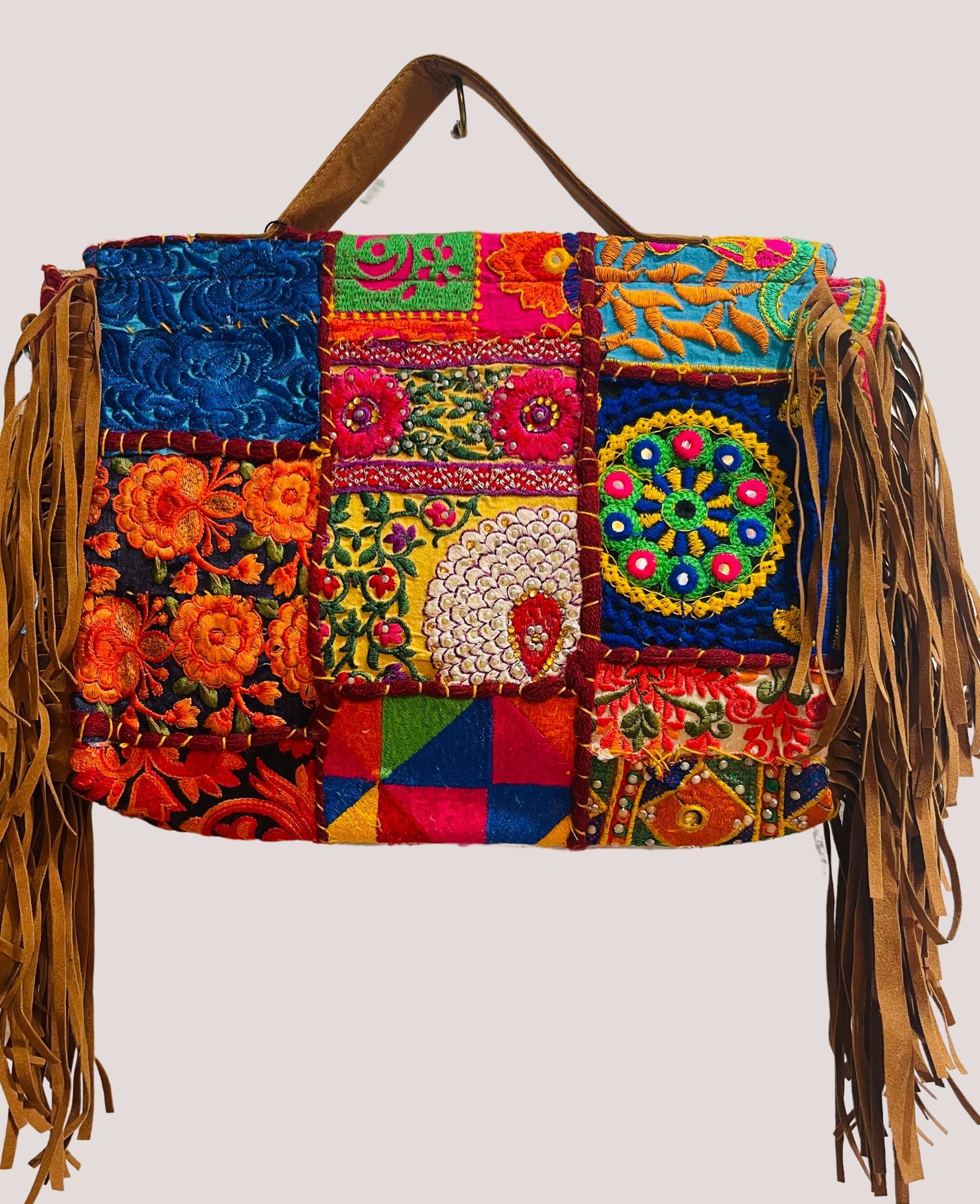 One of a kind Shoulder Bag with long strap, embroided patches decorated with stones, coins, beads and more. Removable long shoulder strap.