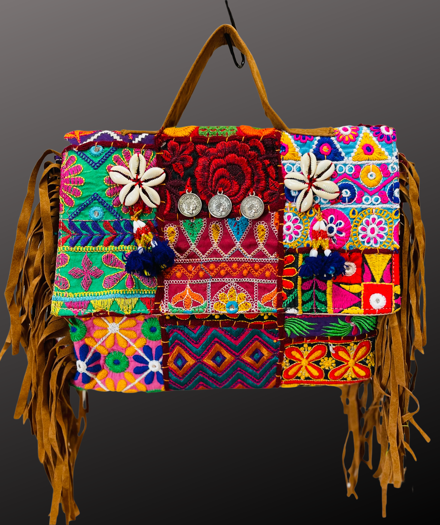 One of a kind Shoulder Bag with long strap, embroided patches decorated with stones, coins, beads and more. Removable long shoulder strap.