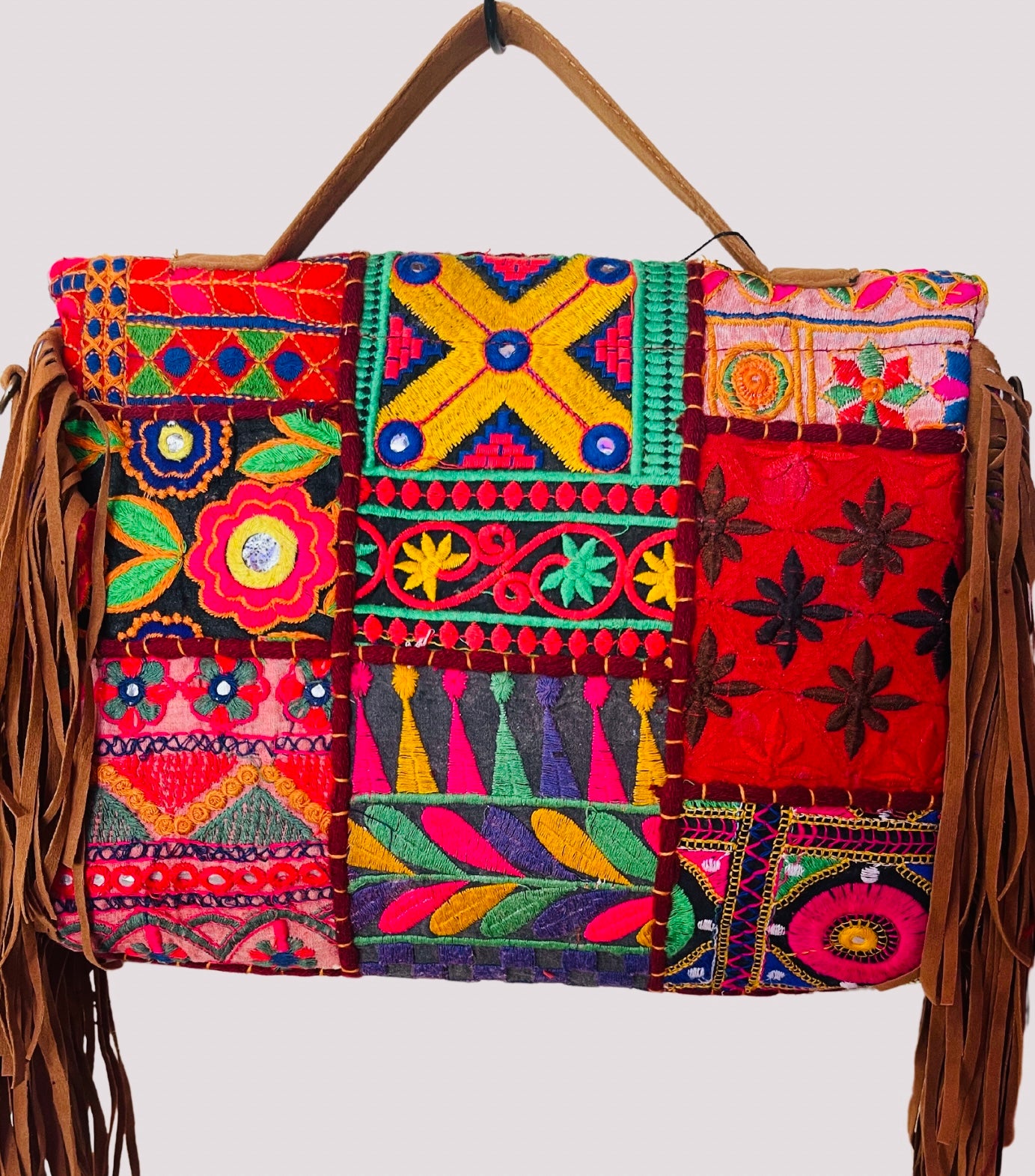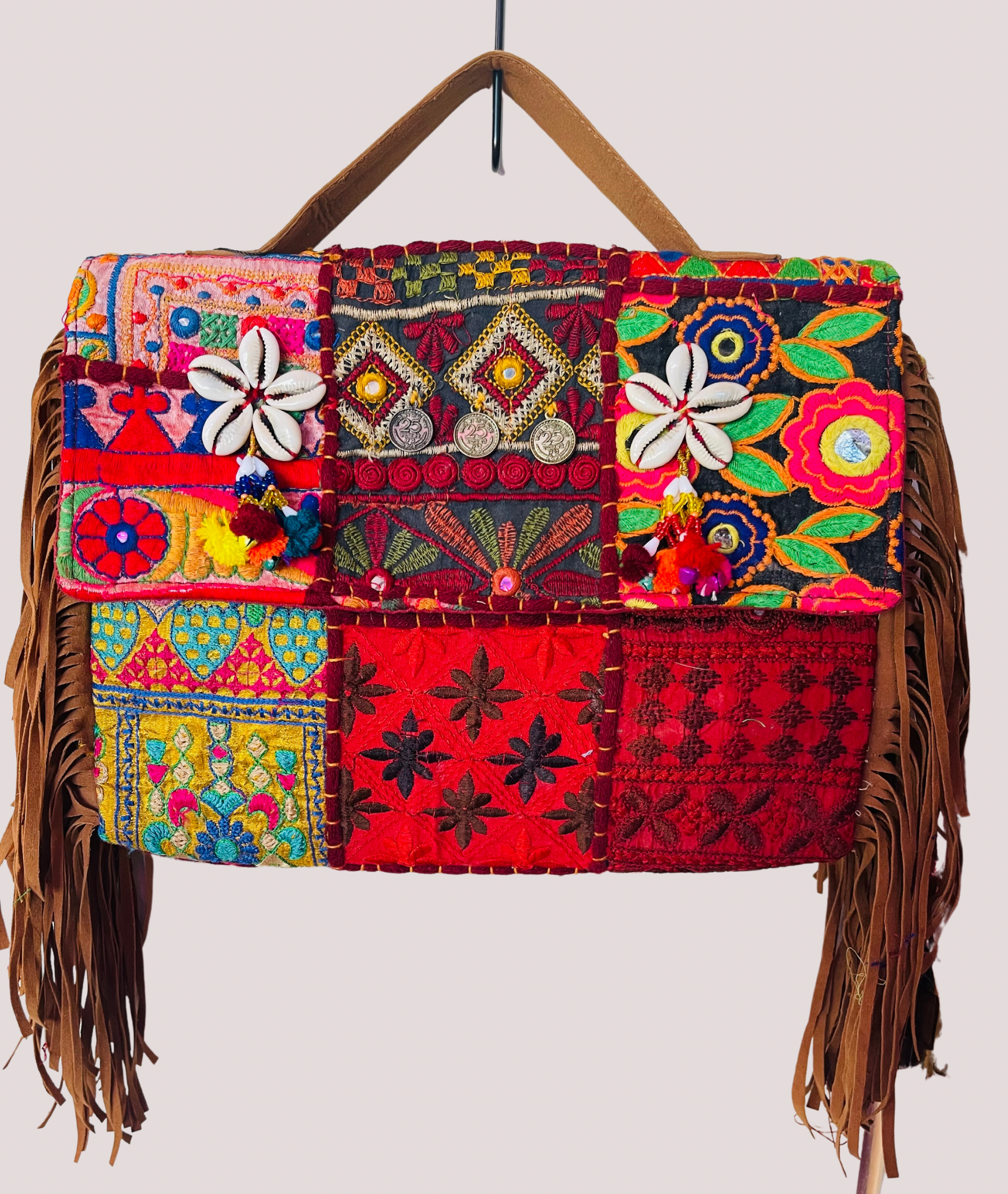One of a kind Shoulder Bag with long strap, embroided patches decorated with stones, coins, beads and more. Removable long shoulder strap.