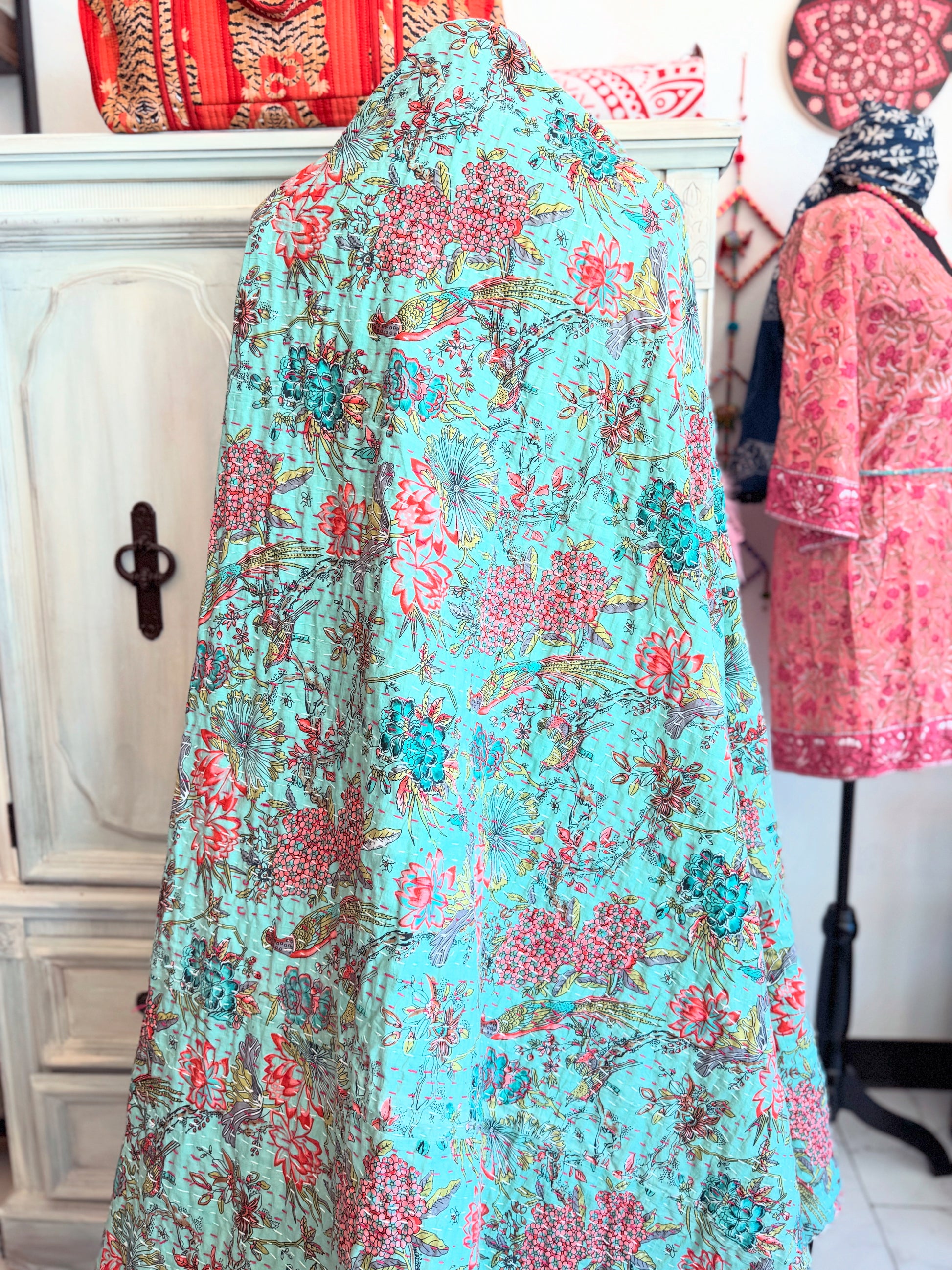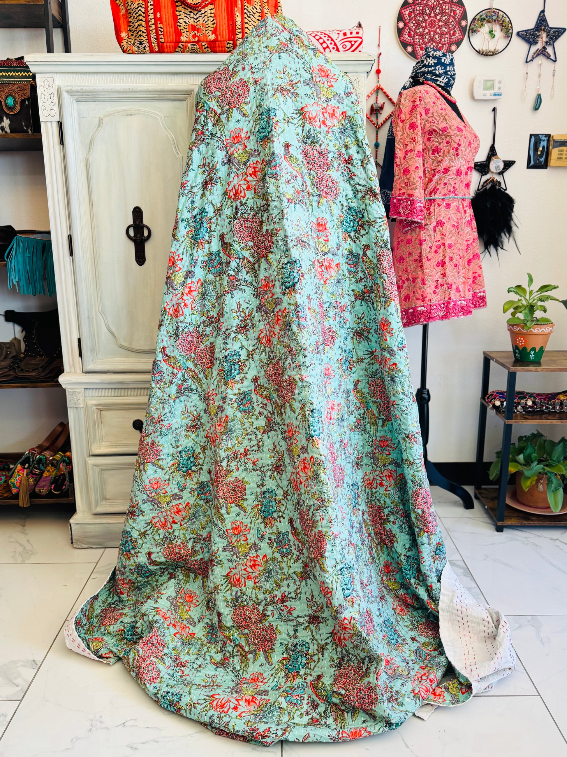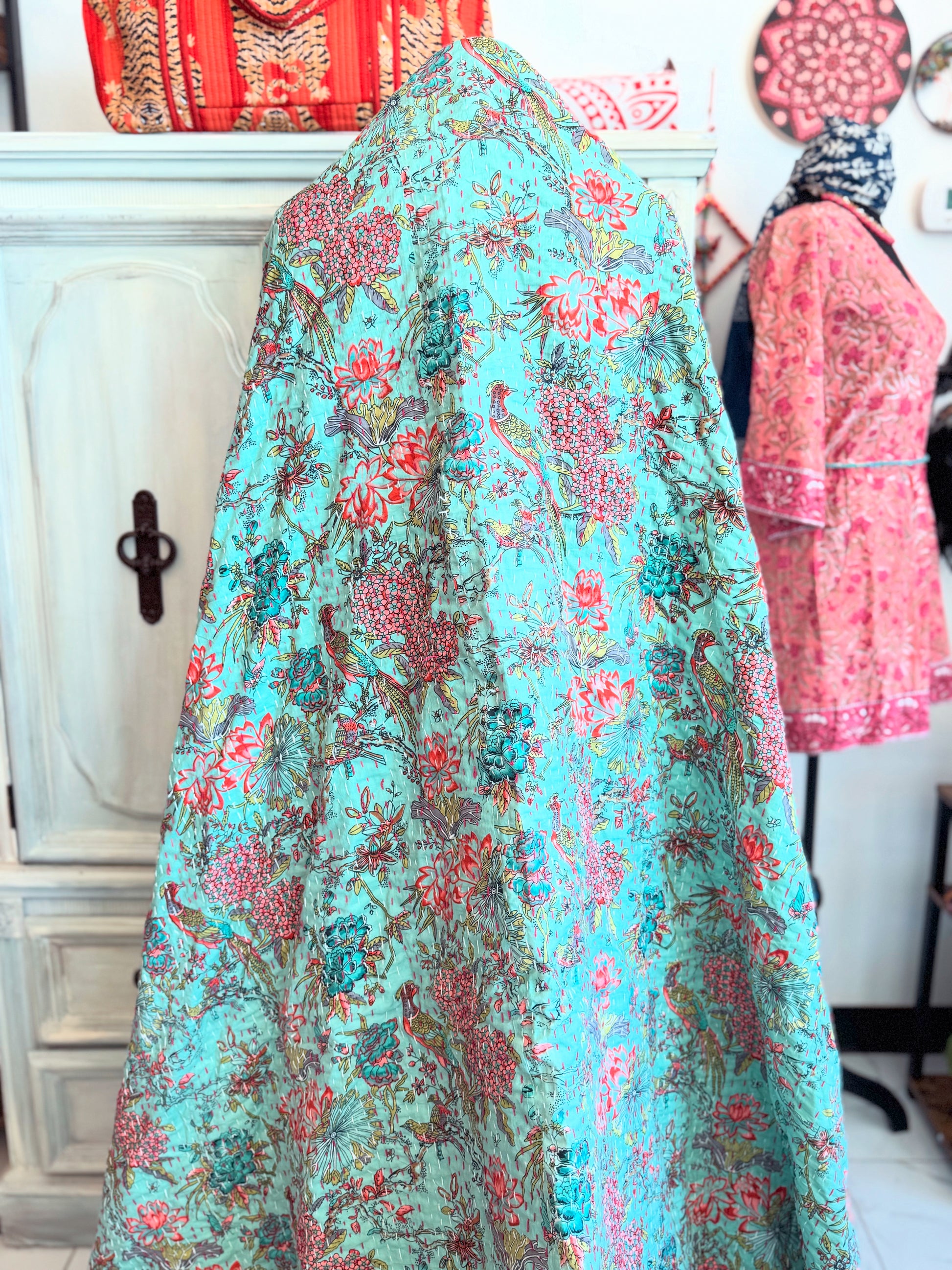 Peacock Garden – Handblock Printed Kantha Quilt | Cotton | Handmade | Full Size
