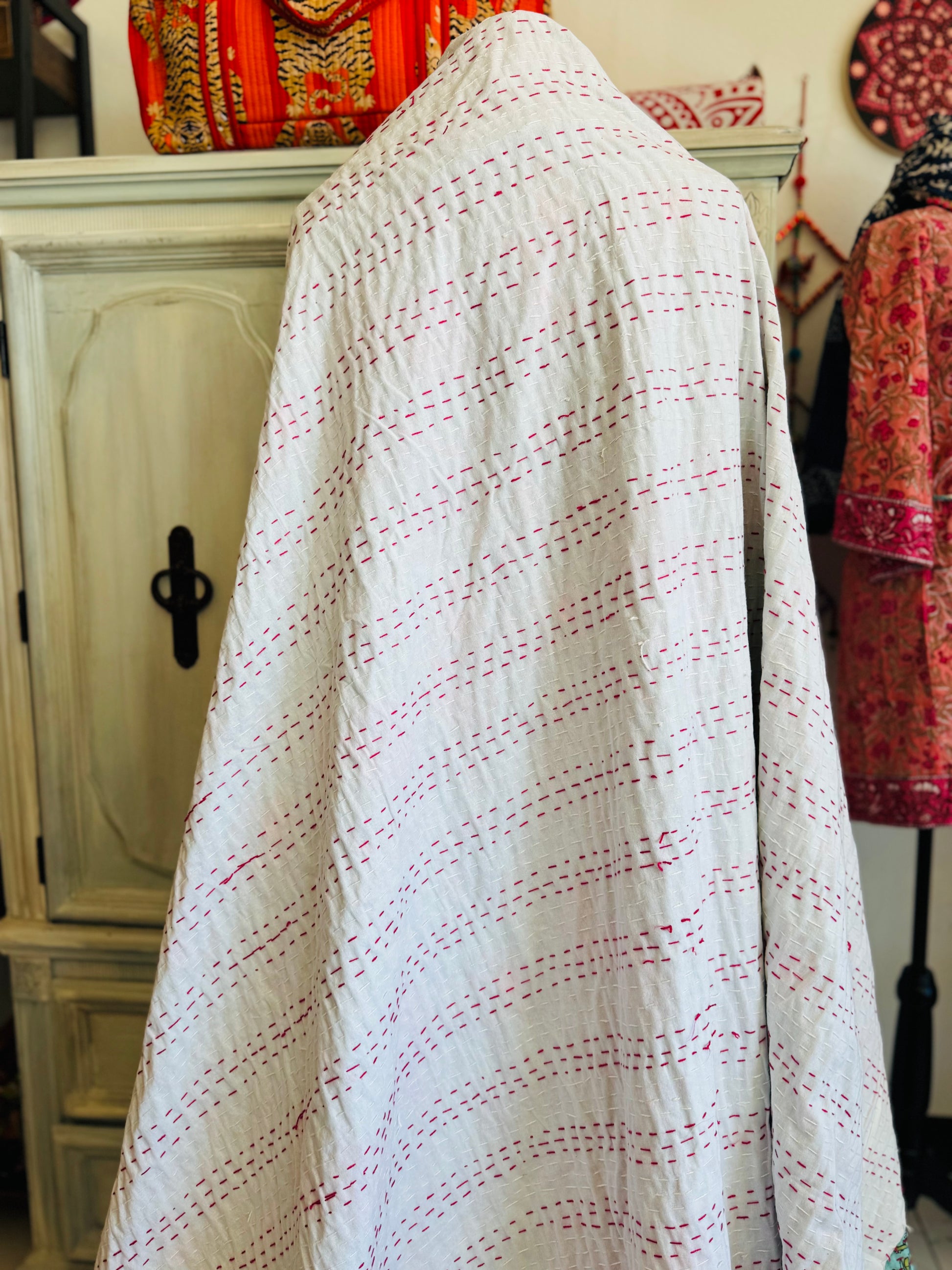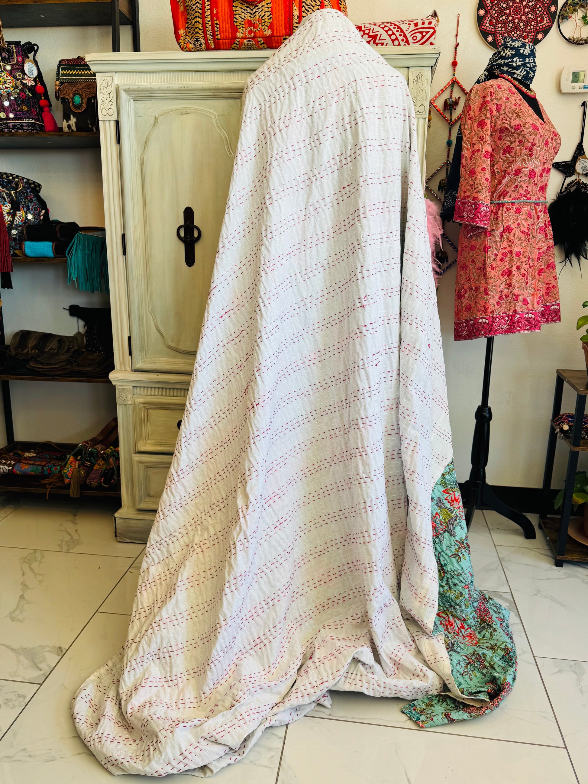 Elevate your bedroom with the exotic charm of the Peacock Garden Kantha Quilt. Handblock printed on soft cotton and meticulously hand-sewn with thousands of Kantha stitches, this full-size quilt showcases intricate peacock and floral patterns. Lightweight and breathable, it’s ideal for layering or standalone use.