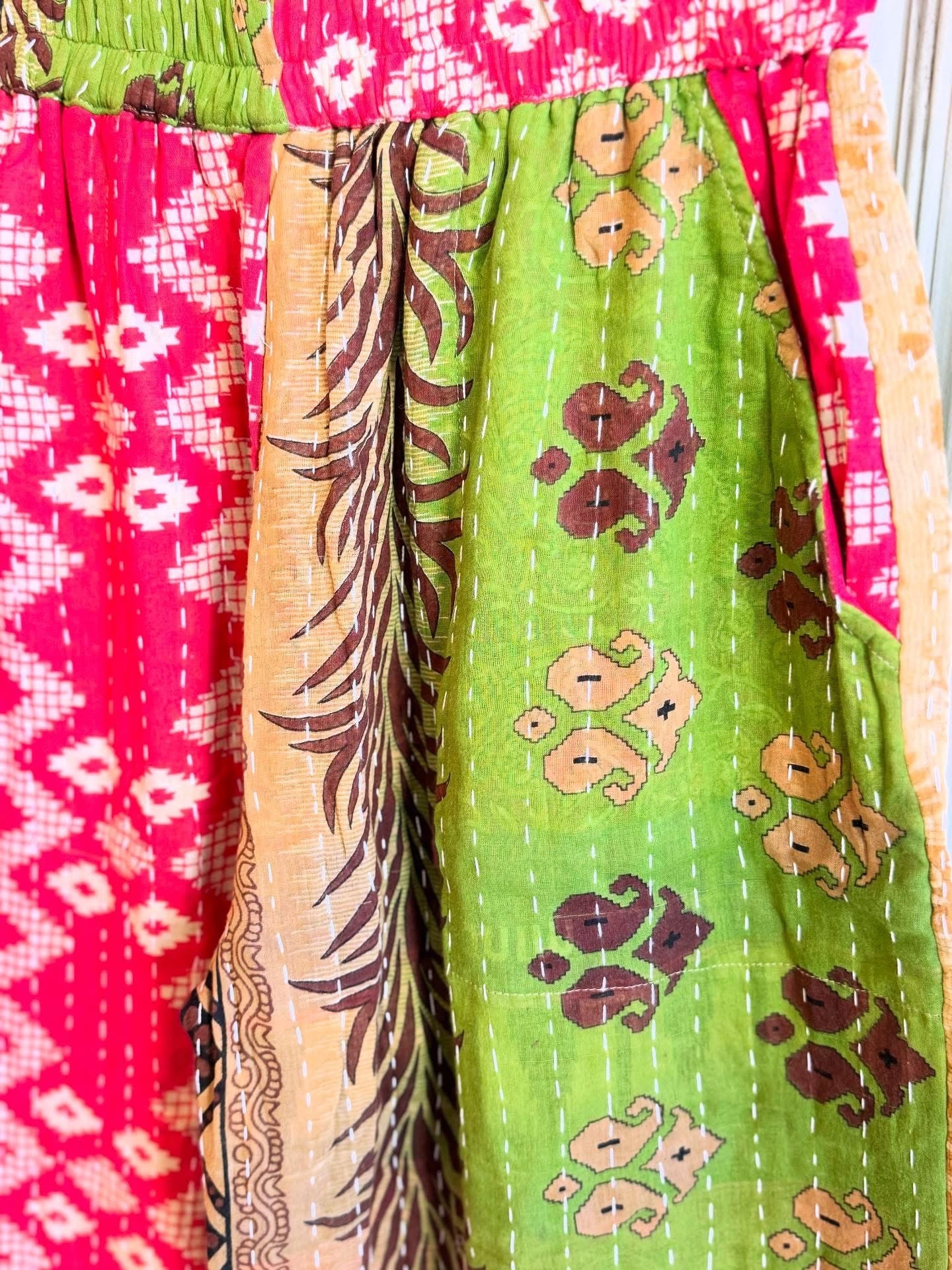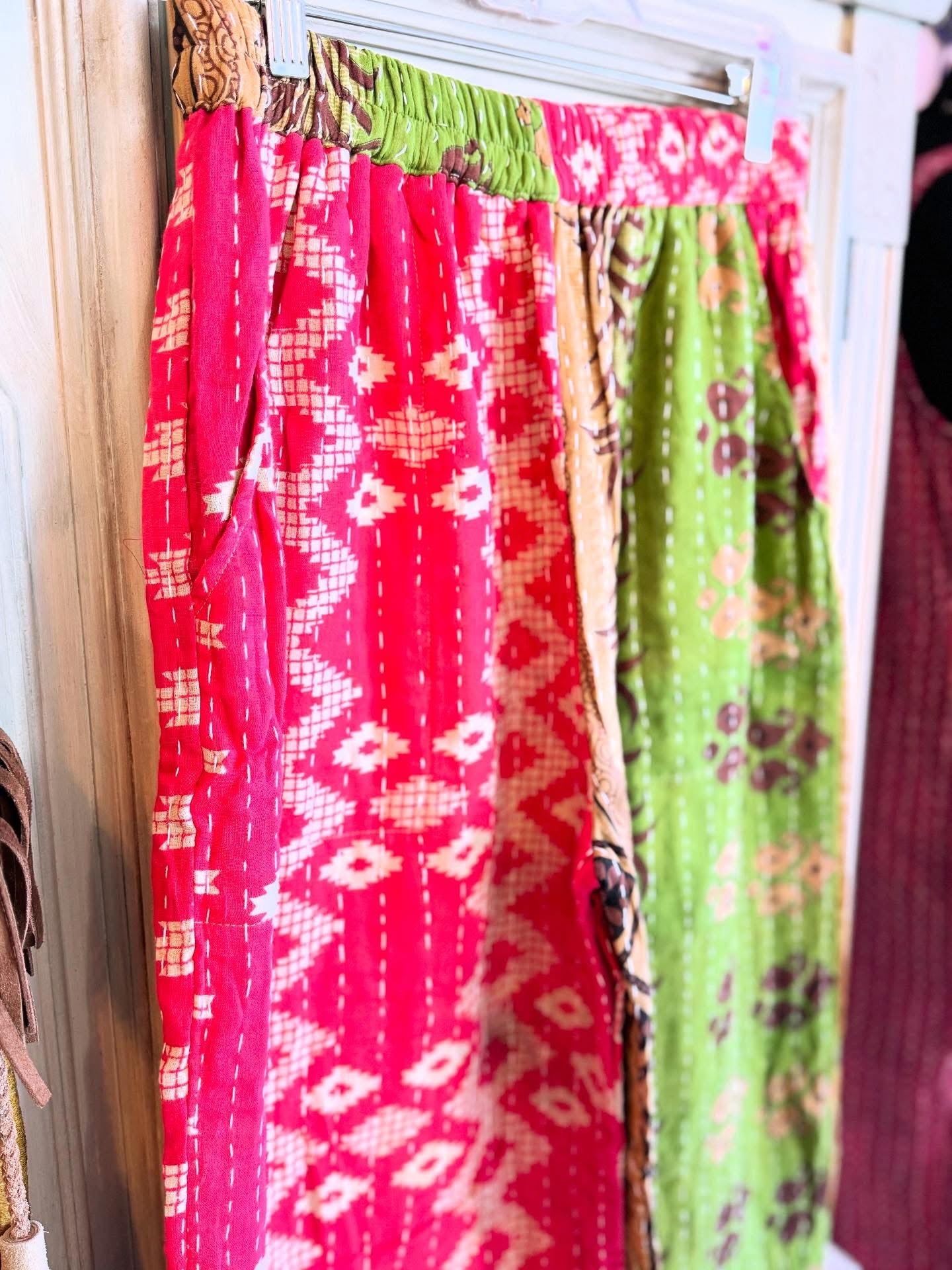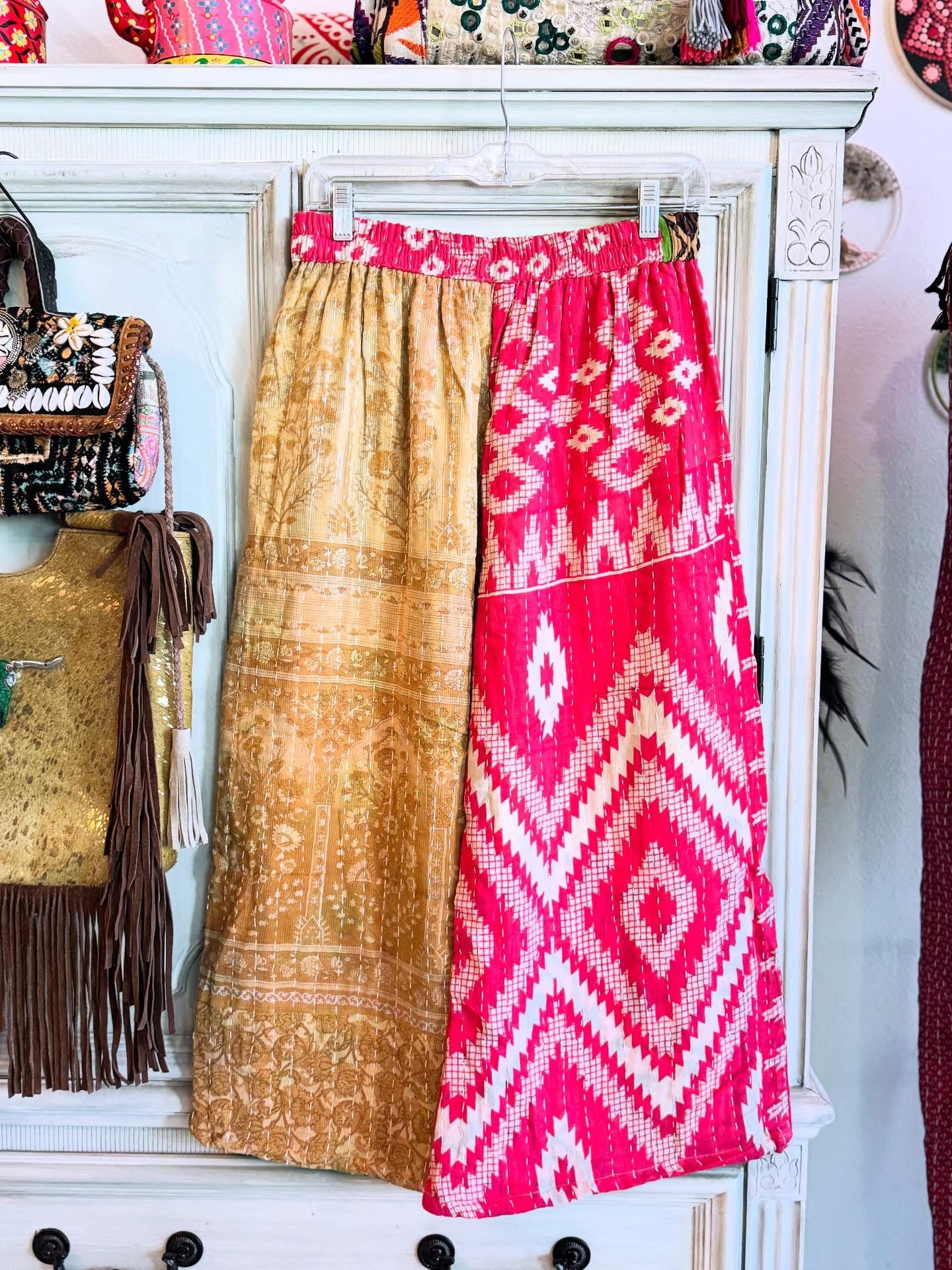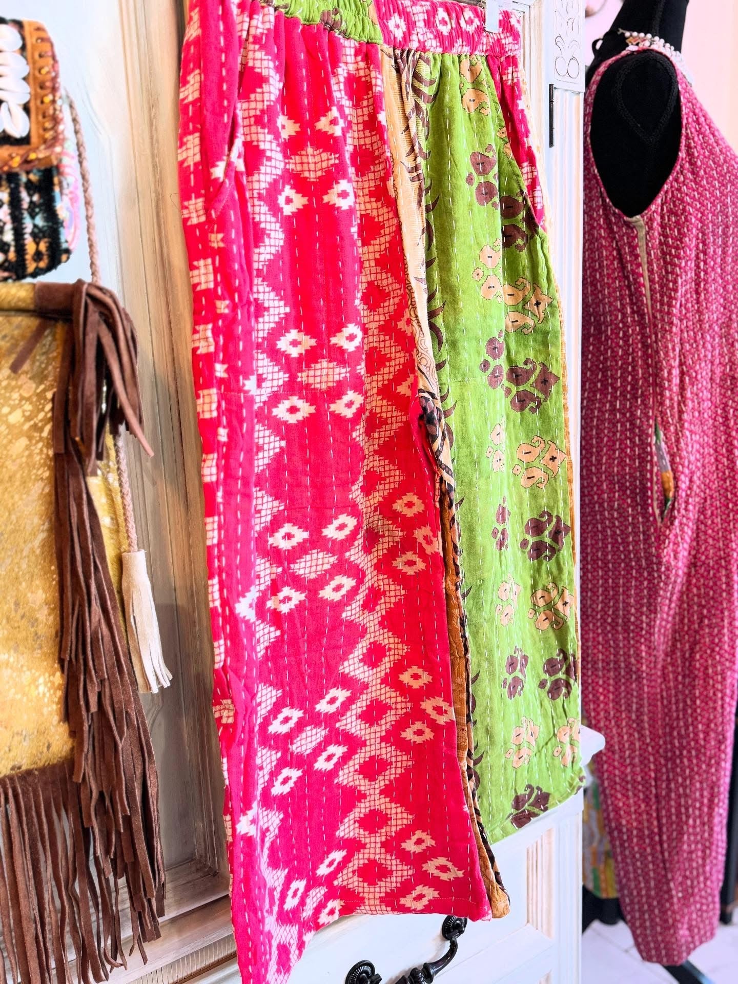 A bold clash of colors meets graceful tradition in our Pink & Olive Bloom Kantha Pants. Crafted from vintage cotton sarees, these wide-leg trousers feature bright magenta ikat-style patterns and olive florals, all stitched together with traditional Kantha quilting. A striking blend of heritage art and sustainable style.